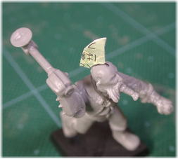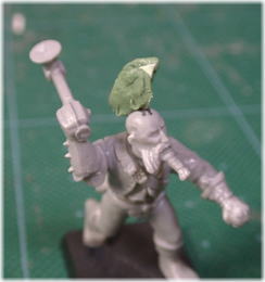 土台を作る カードをハサミで切り、好きなモヒカンの形を作る。それをミニチュアの 頭に瞬着で接着する。作業中に結構負荷のかかる部分なので しっかりと接着しよう。ハゲ頭にしっかりフィットするように接着面を カーブさせることが重要だ。 |