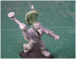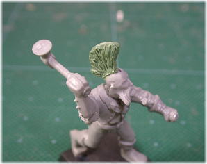 パワーアップ! 上の写真の状態でモヒカンは完成だが、さらにパワフルにしてみよう。 余ったパテをひも状に伸ばした物をモヒカン上部に張り付ける。 そしてスパチュラの先(爪楊枝)でポツポツと沢山の穴をあける。 これで完成だ!!! この作業はモヒカンをパワフルに見せるだけでなく、モールドを入れる 作業で歪んでしまったモヒカンの縁を美しく整えると言う意味もある。 パテが余っていたら是非ともトライしてもらいたい作業だ。 |