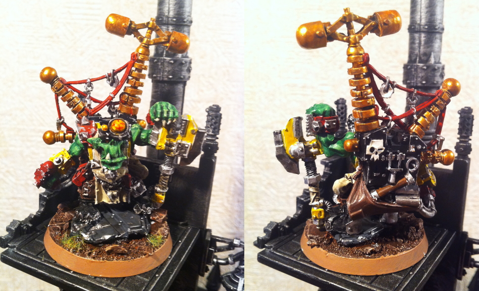 バッドムーンと言いつつ、むやみやたらに黄色くするのでは無く、ツボを押さえて黄色を配したことで引き締まって見えるのも素晴らしいですね〜。 このビッグメクのミニチュアの魅力といえば、背中にしょった巨大なカスタムフォースシールドの特異な形状の面白さは言うまでも無く、 沢山のさげ袋やアイ・レンズなどなど、何と言ってもこの盛り沢山感! そういった小物の一つ一つにも愛情たっぷりにペイントされているのがよく伝わってきました。 MOMIAGEさんのオルクアーミーにとって重要なキャラですし、しっかりペイントすることでより愛着も増すというものですよね。 緑肌の丁寧なグラデーションも見応えあります。 ちなみに僕もこの「ぬぽーっ」とした表情の顔はシマリが足りないようで、イマイチ好みではありませんでしたが、 なるほどMOMIAGEさんの解説を読んでから改めてみるとガテンがいきました。 確かにこの表情、ええもんを物色中って感じでなかなかに奥深い表情をされてます。 じっくり眺めているうちに何時の間にか僕もこの顔が好きになってしまいました(単純?)。 実戦でも愛嬌たっぷりに活躍してくれることを願ってます。 ところで、ファインキャスト一発目ということで大変お疲れ様でした。 ファインキャストというと下準備がなかなか大変ですよね。 しかしながら、このビッグメクはファインキャスト特有の気泡穴も見受けられませんし、やっぱり丁寧な工作が大事だな〜と勉強になりました。 しっかり完成させられれば、手に持ってみない限り、メタル製のものとはさすがに見分けが付きませんね〜。 素晴らしいことです。 これからはファインキャストでしか手に入らないミニチュアがどんどん増えてくるでしょうし、 MOMIAGEさんの丁寧な仕事を見習って僕も良い作品を作っていきたいと思います。 |
