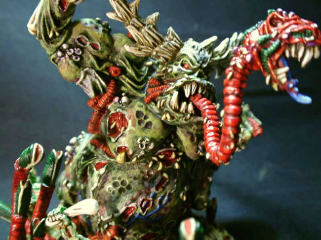 | Rmanのコメント mp36さんのグレーターデーモン、グレートアンクリーワンです。 凄まじい迫力です!腐った皮膚のペイント、生々しい顔付きの舌、骨のペイント、どれを見ても ナーグルらしいおどろおどろしさ満載です! う〜ん、思わず匂いすらしてきそうですね...(誉め言葉^^)。 40KのGデーモンはFBと違って、ゲーム中にキャラクターに憑依するという形で現れます。 ナーグルは見た目と違ってタフネスが低めだったのですが、新ルールでパワーアップしたそうです。素晴らしい! |