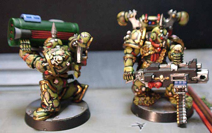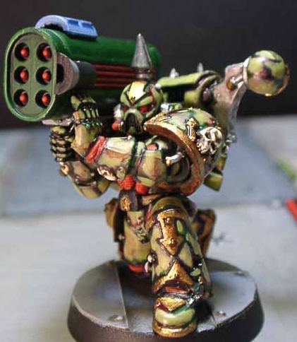 | Rmanのコメント mp36さん製作のケイオスマリーン重火力部隊Havoc(ハボック)です。 mp36さんはGW製のミサイルランチャーがバズーカっぽくて嫌い!だったとのことで、とあるプラモから パーツを入手されてオリジナルランチャーを作られたとのことです。サイズもしっくり来てますし、格好いいですね。 本体のペイントも相変わらずスゴイことになってますし。 なにげにきちんと座らせているあたりが、気合いはいってますね!僕もやりましたが、意外にこの改造が難しいんですよね。 |