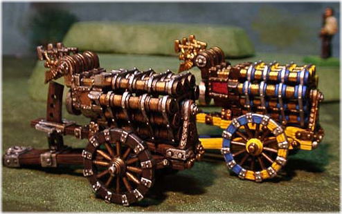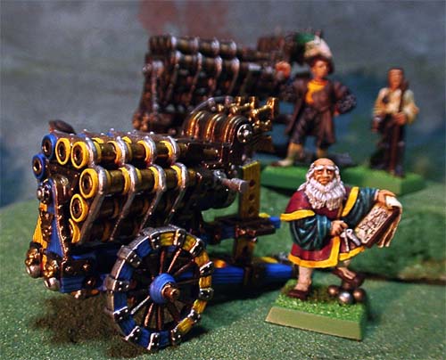 | ゆきじさんのコメント エンパイアの誇る非道兵器No.1 今回北海道UGT用に2門準備してみました。ダイス目がはしれば20体のレジメントも瞬殺しますが、 その場合ほとんどゲームにならないので(雰囲気的にも)今後は自粛したいと思います(^^; 強すぎる兵器というのも逆におもしろくないですね・・・。1台目は渋めに塗ったので、その反動で2代目は無茶派手に。 これはノードランドカラーです。 Rmanのコメント ムチャ格好いいっすね。一台目は見本っぽい配色でこれはこれでシブくて良いのに、この2代目のオリジナリティーな配色が また格好いい!自分ならではの塗りが出来るのがファンタジーミニチュアの魅力ですが、ゆきじさんのコレを見てると それを実感できます。旧ヘルブラスターの親父を使うところも昔からのメタルファンゆきじさんらしいこだわりですね! このカラーリングはナルンアーミーの中でも凄く派手で栄えていました! |
