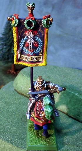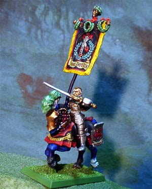 | ゆきじさんのコメント 限定品のスタンダードは徒歩だったので、馬に乗せて防御力を高めてあげました。 ただ、旗までメタル製なのでちょっとバランスが悪いです。 旗の絵はスクウェアの”ベイグランドストーリー”に登場した”血塗れの罪”のデザインをぱくりました。 Rmanコメント 限定ミニチュアであろうがガツンと改造してしまえるゆきじさんの大胆さに感動! しかも何ですかこのバナー!パクリたくてパクれるもんじゃないです。格好良すぎます。 バナーのすさまじさだけに目がいきがちですが、馬の改造&ペイントも凄い...さすがです! 馬が青いのはなにげに斬新ですね〜。 |