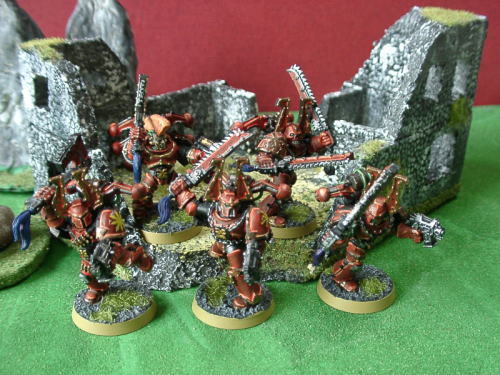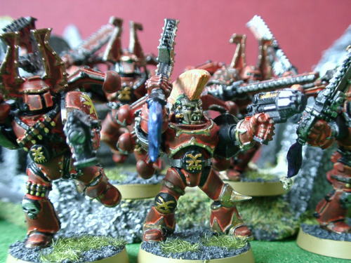| Rmanのコメント 卵帝君の40Kアーミーケイオスマリーンの主力たるコーンバーザーカーです。普通のマリーンを遙かに凌駕する体格に その凶暴さはケイオスウォーリアーを連想させるものがあります。 しかもきちんとモヒカンをコンバージョンしてるあたり彼のこだわりが見えて良いですね(笑)。 赤がきちんと塗られており迫力があります。またリーダーのブースターはコンバージョンによって普通のより増設されており、 彼曰く「通常の3倍のブースターを付けているが、個々の出力が通常の3分の1しかないので、機動力は変わらない」だそうです(笑)。 しかし迫力ありますよね。構えも良いですね。40Kプラ最高! |