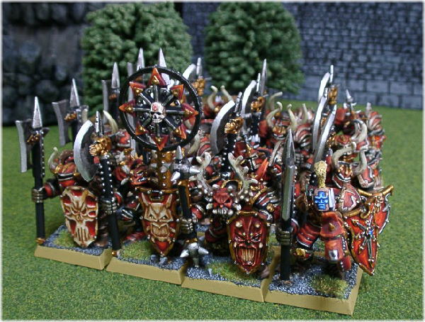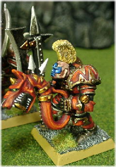 Rmanのコメント 今まで旧メタルウォーリアーを使い続けた卵帝君でしたが、 unGTのアピアランスポイントを稼ぐために プラのウォーリアー(ハルバード)を作ったということです。 彼がプラウォーリアーを塗るのは3度目とあって、 さすがにツボを押さえた重厚感かつ、 コーンらしさにあふれたペイントだと思います。 ミュージシャンの顔のペイント(ネタが分かる人はどれくらい いらっしゃるでしょう?)に、 パテ製のモヒカンといい遊び心にあふれた作品ですね。 チャンピオンの微妙な改造も彼のこだわり(と技術)を伺い知る事ができます。 追記 これまたアピアランスポイントの為に塗った(笑)シールドが非常に見事です。 僕自身もこれらのケイオスシールドをペイントしましたが、縁まで骨っぽく塗るとは! 前に塗った騎乗ソーサラーの頃と比べても格段により「らしい」塗りになってきてると感じました。 盾って面積広いからそれに手を入れるか入れないかで印象が随分かわるものですね。 |