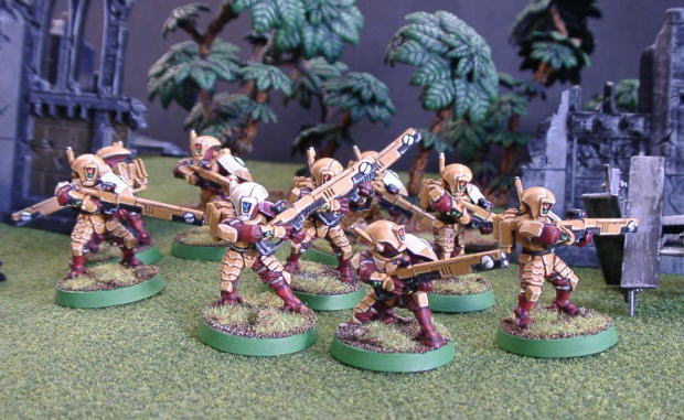 | 卵帝さんのコメント タウアーミーの中核を担う歩兵部隊です。(歩兵が持つ武器としては)高威力、長射程のパルスライフルと そこそこ硬いアーマーのおかげで撃ち合いは非常に強力なのですが、接近戦能力は人間以下です(笑)。 まさにタウの特性を象徴している部隊ですね・・・こいつ等が殴り勝てるのはグレッチンだけなのかぁ! Rmanのコメント 一見すると何のゲームのミニチュアなのか分からないですね(笑)。 しかし造形はプラとは思えないほど見事です。最近のGW(25mmスケール)プラは凄いですよね〜。 昔の一発成形ものよりよほど動きあるし自然なポーズですよね。 この卵帝さんのタウはスタンダードな配色ですがとても丁寧な仕事がなされています。 全モノアイを宝石塗りしているのには脱帽! |