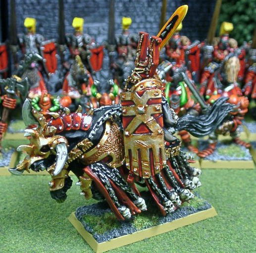 | 卵帝君のコメント 満を持して発売されたケイオスのロードシリーズ!トップバッターはコーンですね。 も〜全てがコーンコーンコーン!と言う感じでナイス! 僕は今までず〜〜〜っと騎乗してるロードには旧アーカロンのモデルを使っていました。 何度もダークペガサスあたりからパワフルな馬を作り出してロードを作ろうかな〜と思っていたのですが (Rman君からも何度も作れと言われましたし)、 その都度「新ケイオスで格好いいのが出たら悔しいからヤダ!」と言い続けていました。 待った甲斐があったな〜と思います(笑)。 顔が好き嫌いあると思いますが、僕はガンダム試作2号機みたいで好きかな〜・・・ 今回は配色は極めて単純ですが、赤色、金属共に気合いを入れてグラデをかけました。 ゲームで活躍してくれるのが楽しみです。 Rmanのコメント デカイ!それがこのロードを見て最初に思った感想です。いや〜これほど迫力のあるミニチュアは 初めてかも知れません。ひたすら格好いいですね。 ペイントもいかにもコーンのロードらしい配色で、シンプルながらバッチシ決まってます。 バーディングのジャラジャラとした骸骨も1つずつ丁寧にペイントされていますね。 |