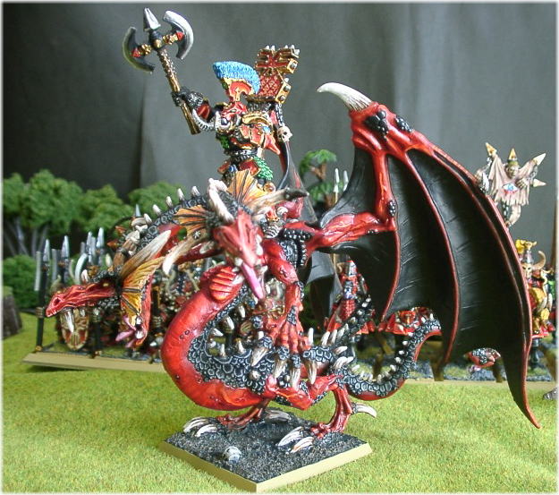 | 卵帝さんのコメント 6版ケイオスに「キマイラが居ない」と言うアクシデントのため(笑)、永らく失脚していたギルベイダー卿であったが、 新たなる破壊の翼“暴虐の王”アスマディを得てついに復活した!!! 「そう言えばコイツの下半身はドラゴンの乗り手だった」と言う事を思い出し、急遽復活となりました。 無改造で乗せ換えてます。コレも全て計算済みさ・・・フフ・・・ ドラゴンはかな〜〜り昔に有機溶剤さんの協力で完成したものが実家に放置してあったので、 全体的にリペイントを施しました。6版はドラゴンのコストが安くなったので、活躍の機会が多そうですね。 Rmanのコメント 赤いドラゴンに赤いロード、まさしくコーン!といったかんじで格好いいですね。 GWのミニチュアの中でも最大クラスの大きさを誇るドラゴン。まさに迫力です! こんなのが戦場に出てきた日には..。 全体にわたってリペイントを施されただけあって、きれいに仕上がってます。爪や牙の塗りが良い感じです。 |