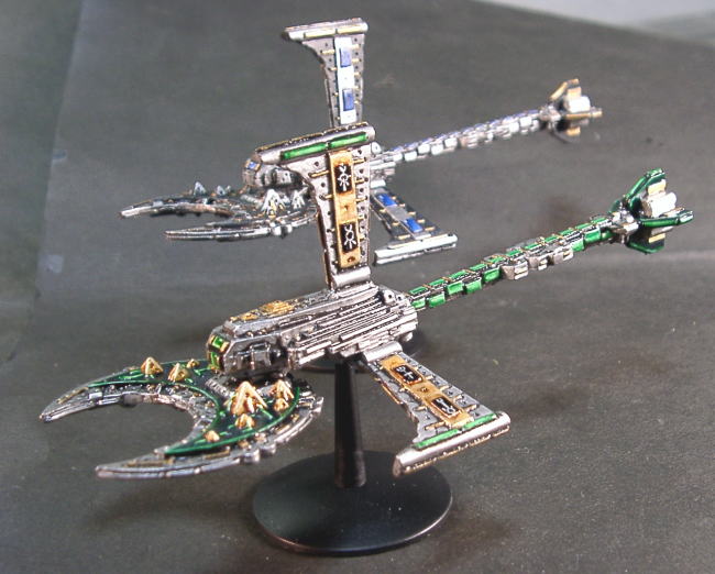 | 卵帝さんのコメント ジャッカル級から手足と尻尾が生えてきました。完全体まであとわずかですね(笑)。 このぐらいのモデルになると流石に塗り応えが出てきます。 ガウスエネルギーが動力だろうと思うので、緑色を基調にペイントしました。 後ろに見えるのはRman君がペイントしてくれた1番艦です。 ところで、ハーヴェストって何をハーヴェストするんですかね〜・・・やっぱ魂とかですか?? Rmanのコメント 僕が塗った時はMYアーミーの色に合わせただけだったのですが、 緑&ネクロンの紋章を描いたのにはヤラレタって感じです! なにげに持ち運びに気を使うデザインだよねコイツ。 |