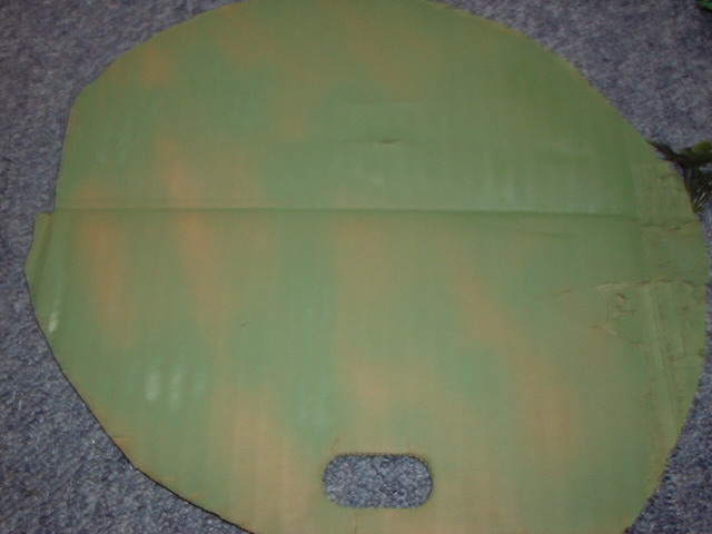 | 4 | せっかくの人工芝の土台(?)を有効利用しましょう。 ダンボールの形に沿って丸く切ります。 グリーンボールは図のように地面に接する部分の 芝は全部外しておきましょう。 |