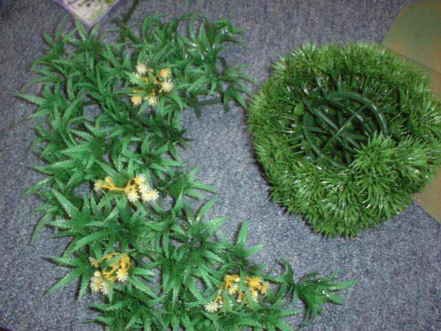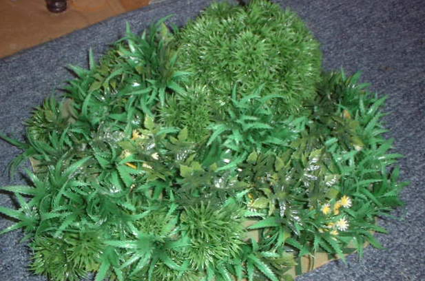 用意するのは100円ショップで売っている人工芝です。 ほんとに世の中便利になったもので、100円ショップに 行けば大概のモノが買えてしまいます。 もちろんテレインも例外ではありません^^。 様々な人工芝が売っているでしょう。その中でも 自分のイメージする森にあったものを買いましょう。 2つで充分ですが、3種類ぐらいあると良い感じです。 今回は新商品?のグリーンボールも使用します。 |
