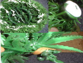 作業も終盤にかかりました(早い!) 4番で切った土台付き芝の裏にボンドをたっぷりつけ、 ダンボールにくっつけます。 グリーンボールは図のようにベチャベチャになるくらい とにかくたっぷりと。 そして 2番で切り離した芝を幾つかまとめて輪ゴムで縛ります。 そうすることによって芝の隙間が埋まって、 上手く茂みを作れます その後はたっぷりとボンドを付けます。ここはケチらずに たっぷりこぼれるくらいつけてください。 それを先にくっつけた芝の隙間 隙間に埋めていくように くっつけていきます。ボンドがたっぷり着いているため、 固まってしまえばこっちのもんです。 |