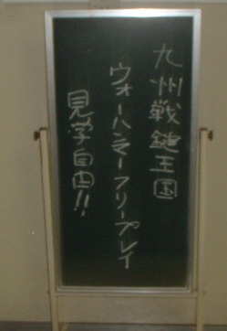 | イベント終了〜 会場を5時過ぎに出ます。holtenさんをてらださんの車で大橋駅まで送りました。 holtenさん鹿児島から本当にどうもありがとうございました。またお会いして今度はゲームしたいですね。 その後は福岡メンバーで「笑笑」という店で打ち上げ!3人とも顔が凄く明るかったです(笑)。 やっと九州地方に明るい未来が見えてきたという感じで^^。 この第一回イベント、実に有意義なイベントとなったと思います。 今後も2回3回と回を重ね、もっともっとWHを楽しんでいきたいですね。 |