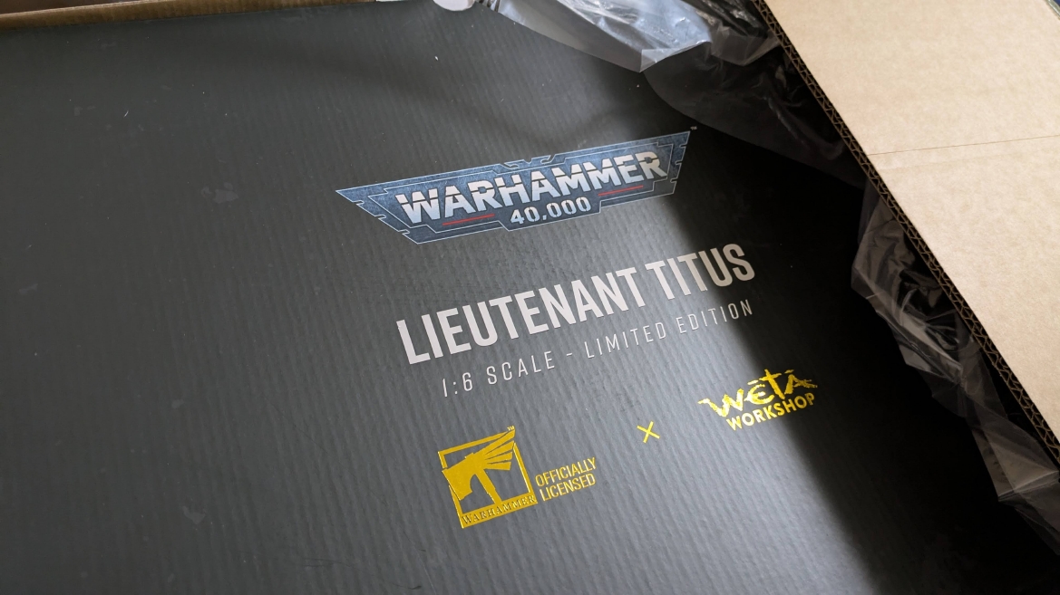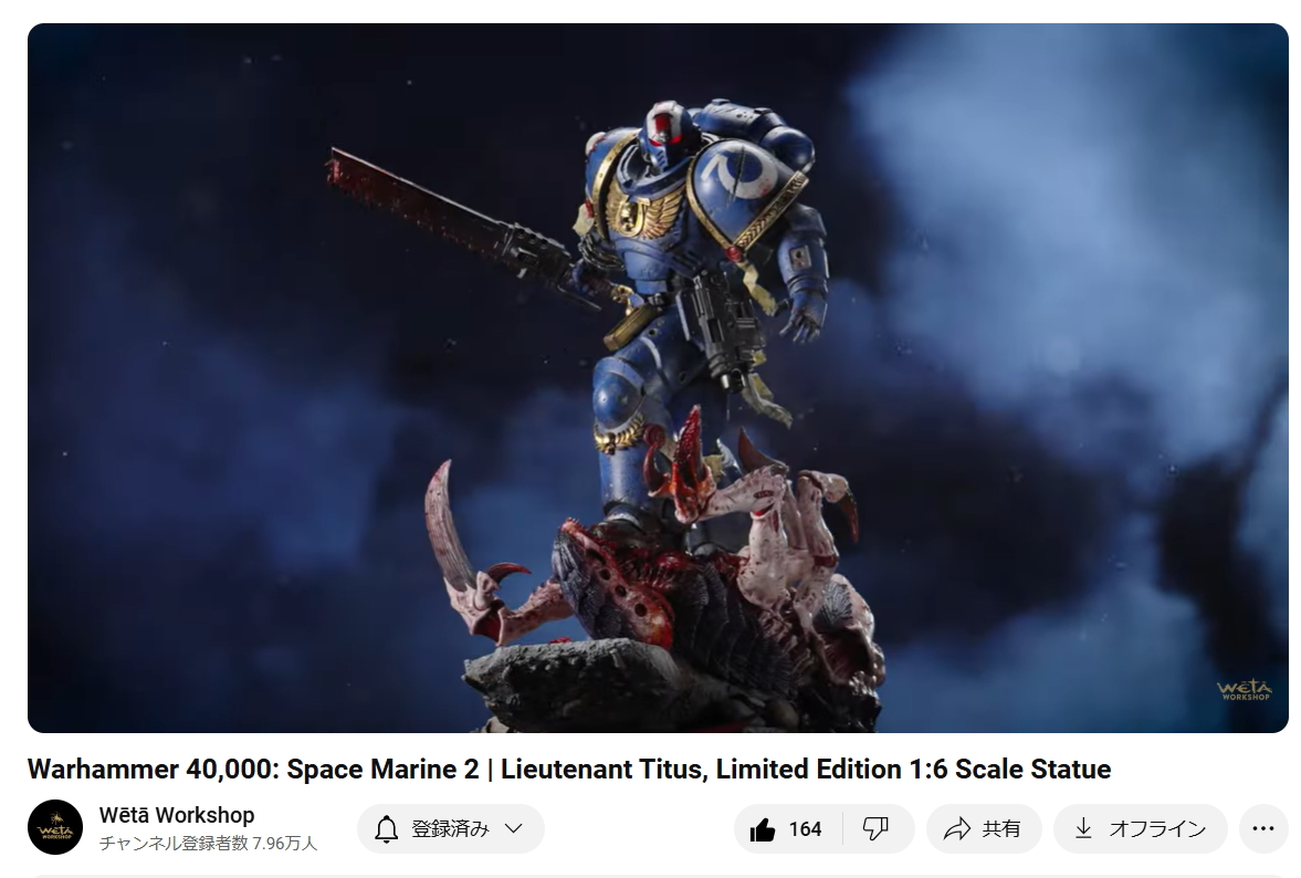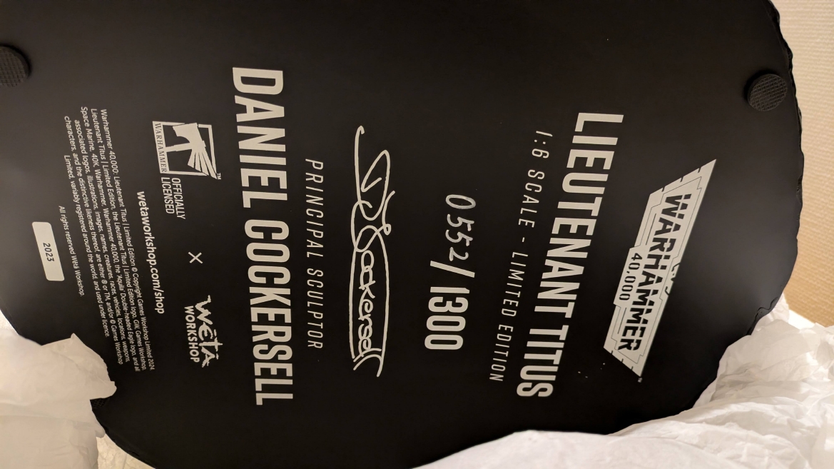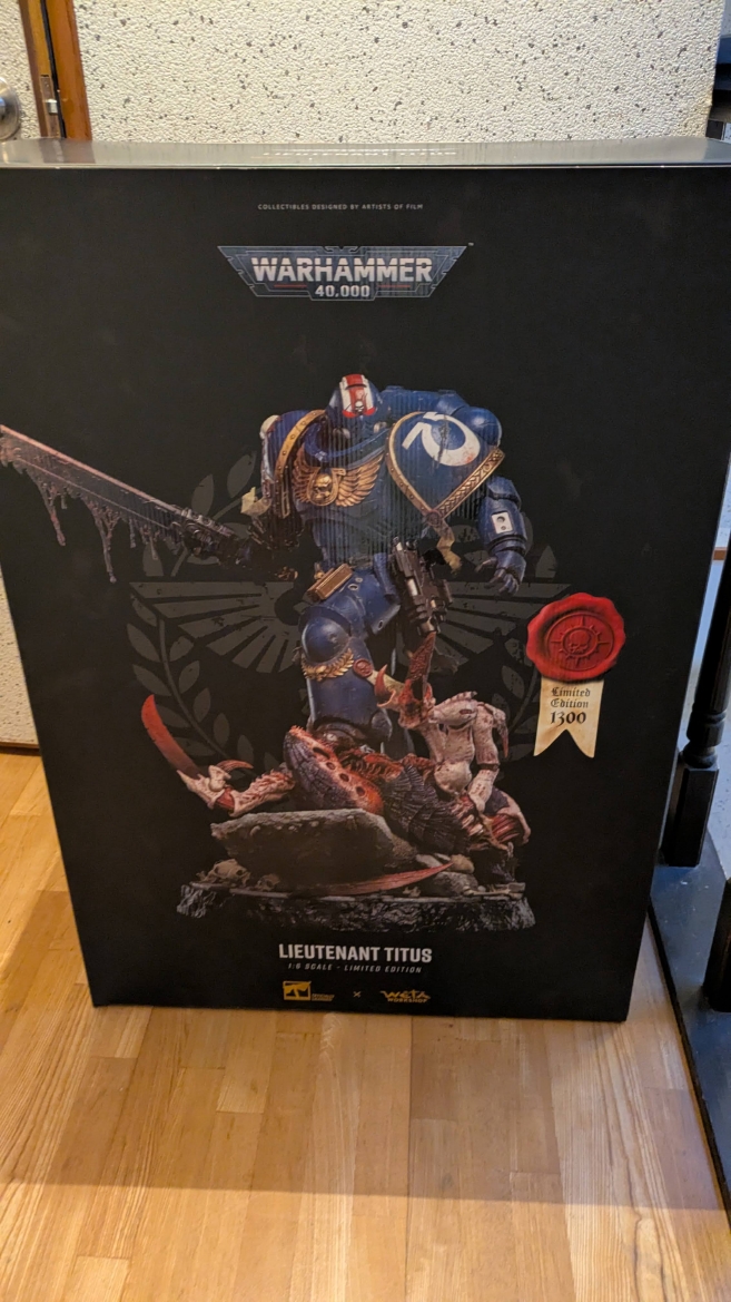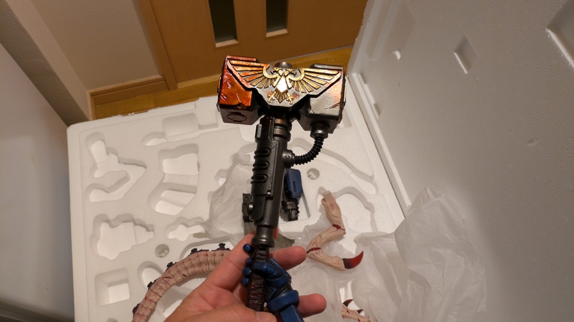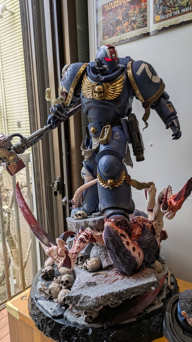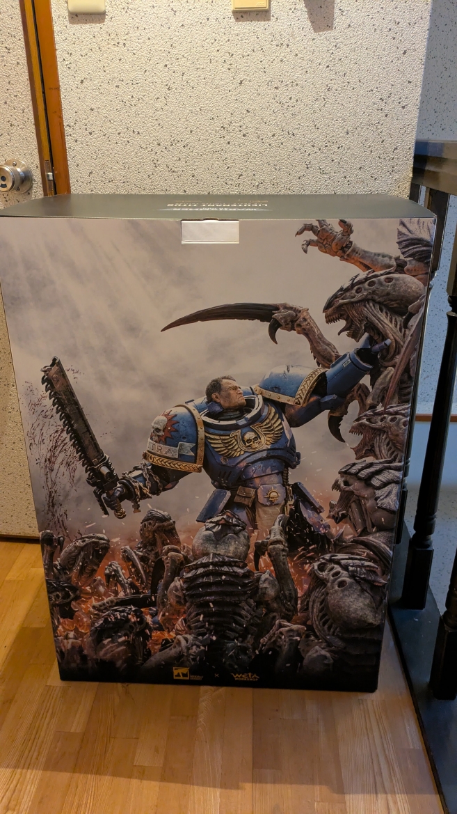 スペースマリーン2 ![]() パソコンやプレイステーション5にて昨年発売されるや全世界で大ヒットとなったタイトルです。 ウォーハンマーホビーが根付いているイギリスやアメリカでも、 このゲームの影響で本家GWのミニチュア(特にスペースマリーン)が飛ぶように売れて専門店の棚が空になるほどの販売促進に影響したと話題にもなりましたね。 昨今飛躍的にウォーハンマーの知名度が高まっている日本においても、元からのファンだけでなく一般のゲーマーからもかなり評判良かったようで、 ウォーハンマーの人気定着にかなり貢献してくれたタイトルになったんじゃないでしょうか。 スペースマリーン2、10年くらい前に発売されたスペースマリーンの正式な続編であり、主人公もタイタスその人ということもあり、 前作にかなりのめり込んでハマった身としては発売を心待ちにしていました。 ![]() もう、予告映像を見た時の感動は忘れられません。 サンダーホークから降り立ったスペースマリーンがそのメットを外し、タイタスの顔があった時の感動と言ったら。 前作のネタバレにはなりますが、部下からケイオスへの汚染の疑いを告発され、異端審問庁に囚われるという衝撃のエンディング。 その後のタイタス中隊長の行方は公式から明らかにされることがなく、 (続編開発のニュースも何度かあって、タイタスは生きているという話もちらほらありましたが)いつかタイタスの活躍をまた見たいと願っていたのでした。 それだけに正式な予告編で、タイタスがウルトラマリーンの戦線に復帰したあのシーンを見れて目頭が熱くなってしまったのでした。 最近、妙に冷めているというか、フィクションに対してあまり真剣になれないというか、40kに対してもプライマリス登場以降、どんどん置き換わっていく帝国軍の常識に、 ちょっとついていけない自分がいました。 でも、タイタスが生きていた、この予告編を見た時の感動はなんか胸に刺さりました。 やっぱり夢中になって何度も死地を共に潜り抜けたタイタスというキャラクターには自分の分身のような思い入れがあったんでしょうね。 それだけに異端審問庁にとらわれたまま行方不明というのは本当に心が苦しくなるトラウマエンディングでした。 ![]() 予告編が公開されたその後、当初の発売予定日の直前に開発延長が発表され、発売が1年先送りになったことも驚きましたが、 その当時はまだPS5本体が品薄ということもあり、1年延長はちょっとホッとしたところでもありました。 で、現時点でも結局PS5は買ってないんですよね。どうも現在の生活の中でTVゲームを遊ぶ時間を確保することは難しい雰囲気で、 高額なゲーム機を買うとそれはそれで色々と妻に追及されそうで(「あんた独りでゲームして、自分の時間がたっぷりあっていいですね?」とか嫌味を言われるやつ)、 PS5はあえて買わない選択肢をとっています。今のところは… さて、スペースマリーン2にはタイタス(上半身のみ)とティラニッドの攻防を立体化したスタチューが付属した限定版も海外では販売されていました。 ![]() これがもうカッコイイ。欲しいなぁって思ってましたが、なかなか手に入れるきっかけが無いので、これはもう上半身しかないし、まぁいいか、と自分の中で諦めを付けていました。 ![]() それはそれとして、 スペースマリーン2の発売前からロードオブザリングの小物やジオラマやスタチューの製造で有名なWeta Workshop社とGWがコラボして、 スペースマリーン2のタイタスが立体化されるとニュースになっていました。 予約開始の告知ビデオがまたかっこいい! ![]() https://www.youtube.com/watch?v=EU8Y4tgz13E ![]() https://www.wetanz.com/us/lieutenant-titus-limited-edition ものすごく素晴らしすぎる出来栄えです。欲しい。これは欲しい!! とは思ったものの、ゲームやってないしなぁ、っていうかもう置く場所も無いしなぁ、と悶々とすること約半年。 実際にゲームが発売されて、遊ぶことはできませんでしたが、深夜にYouTubeのプレイ中継やストーリーを追いかける動画を見させてもらって、 タイタスの熱い活躍に触れ、もう居ても立っても居られず、購入ボタンをポチったのでした。 (一括払いはキツかったので3か月の分割払いにしました笑) 非常に大きい荷物なので送料だけでも6万くらい請求されてゲって感じでしたが、さらに関税の通知が。 ![]() なんかすごいうげぇって感じでした。 しかもカード払いが何故か弾かれて支払いできませんってなって、どうしようかと。 2日経っても空港に留め置きとなってるので、電話して着払いしますとお伝えしてようやく発送処理が進みだしてホッとしました。 で、注文から3か月。届きました。 ![]() イメージとしては洗濯機のサイズ。 重さはたぶん25キロくらい?2個口で届いたガブリエルアンジェロスよりは軽い感じですが、流石に重い。 2階のウォーハンマー部屋に運ぶだけでヒィヒィなりました。 ![]() 段ボールを開封するとルーテナント・タイタス(タイタス