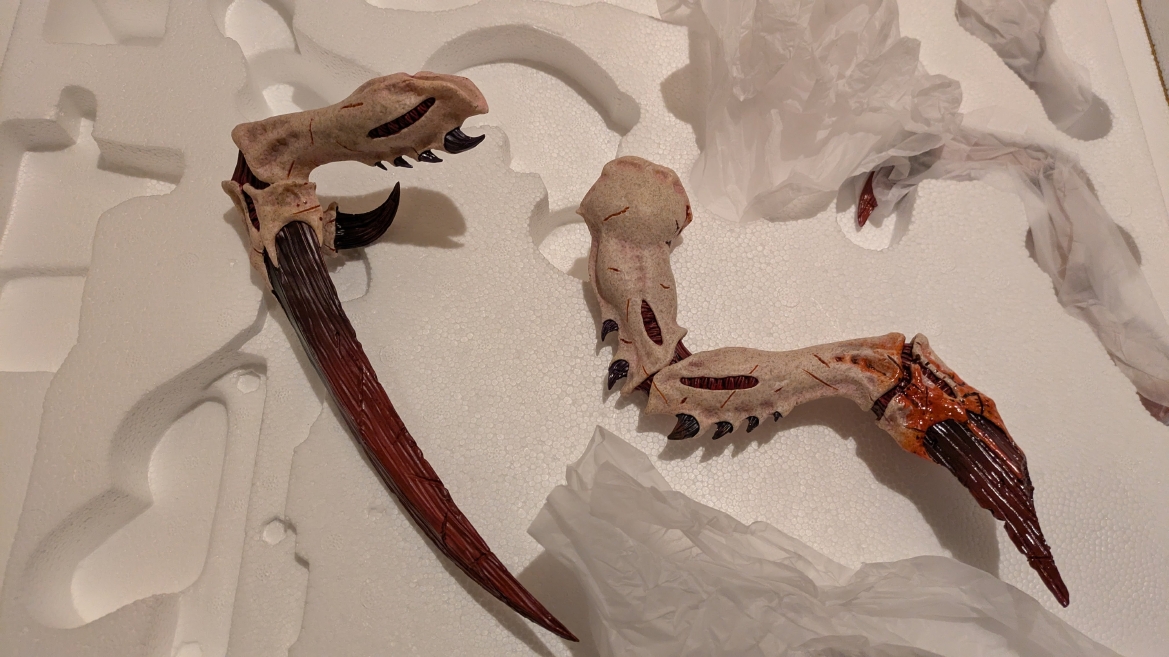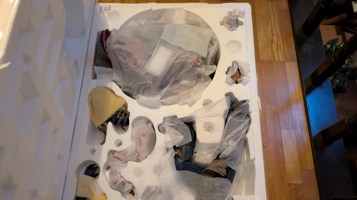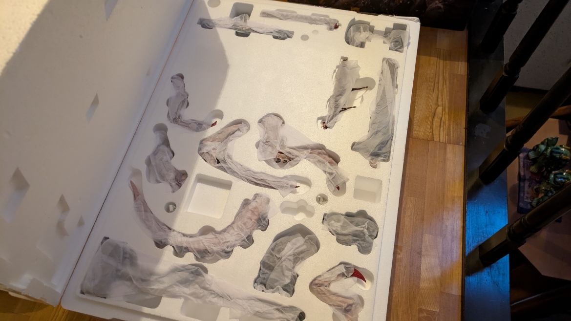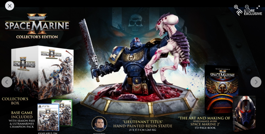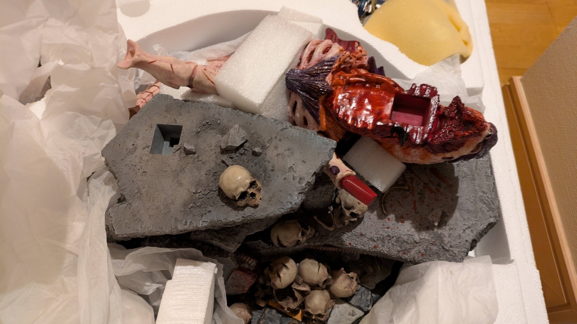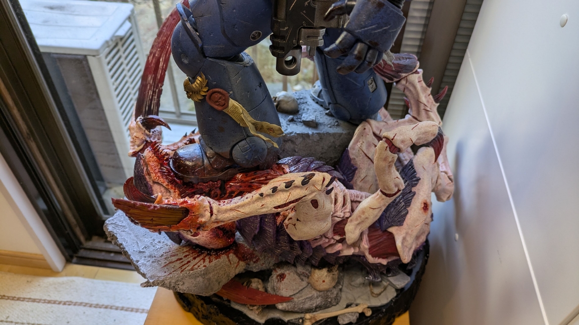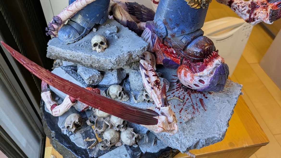 スペースマリーン2 ![]() パソコンやプレイステーション5にて昨年発売されるや全世界で大ヒットとなったタイトルです。 ウォーハンマーホビーが根付いているイギリスやアメリカでも、 このゲームの影響で本家GWのミニチュア(特にスペースマリーン)が飛ぶように売れて専門店の棚が空になるほどの販売促進に影響したと話題にもなりましたね。 昨今飛躍的にウォーハンマーの知名度が高まっている日本においても、元からのファンだけでなく一般のゲーマーからもかなり評判良かったようで、 ウォーハンマーの人気定着にかなり貢献してくれたタイトルになったんじゃないでしょうか。 スペースマリーン2、10年くらい前に発売されたスペースマリーンの正式な続編であり、主人公もタイタスその人ということもあり、 前作にかなりのめり込んでハマった身としては発売を心待ちにしていました。 ![]() もう、予告映像を見た時の感動は忘れられません。 サンダーホークから降り立ったスペースマリーンがそのメットを外し、タイタスの顔があった時の感動と言ったら。 前作のネタバレにはなりますが、部下からケイオスへの汚染の疑いを告発され、異端審問庁に囚われるという衝撃のエンディング。 その後のタイタス中隊長の行方は公式から明らかにされることがなく、 (続編開発のニュースも何度かあって、タイタスは生きているという話もちらほらありましたが)いつかタイタスの活躍をまた見たいと願っていたのでした。 それだけに正式な予告編で、タイタスがウルトラマリーンの戦線に復帰したあのシーンを見れて目頭が熱くなってしまったのでした。 最近、妙に冷めているというか、フィクションに対してあまり真剣になれないというか、40kに対してもプライマリス登場以降、どんどん置き換わっていく帝国軍の常識に、 ちょっとついていけない自分がいました。 でも、タイタスが生きていた、この予告編を見た時の感動はなんか胸に刺さりました。 やっぱり夢中になって何度も死地を共に潜り抜けたタイタスというキャラクターには自分の分身のような思い入れがあったんでしょうね。 それだけに異端審問庁にとらわれたまま行方不明というのは本当に心が苦しくなるトラウマエンディングでした。 ![]() 予告編が公開されたその後、当初の発売予定日の直前に開発延長が発表され、発売が1年先送りになったことも驚きましたが、 その当時はまだPS5本体が品薄ということもあり、1年延長はちょっとホッとしたところでもありました。 で、現時点でも結局PS5は買ってないんですよね。どうも現在の生活の中でTVゲームを遊ぶ時間を確保することは難しい雰囲気で、 高額なゲーム機を買うとそれはそれで色々と妻に追及されそうで(「あんた独りでゲームして、自分の時間がたっぷりあっていいですね?」とか嫌味を言われるやつ)、 PS5はあえて買わない選択肢をとっています。今のところは… さて、スペースマリーン2にはタイタス(上半身のみ)とティラニッドの攻防を立体化したスタチューが付属した限定版も海外では販売されていました。 ![]() これがもうカッコイイ。欲しいなぁって思ってましたが、なかなか手に入れるきっかけが無いので、これはもう上半身しかないし、まぁいいか、と自分の中で諦めを付けていました。 ![]() それはそれとして、 スペースマリーン2の発売前からロードオブザリングの小物やジオラマやスタチューの製造で有名なWeta Workshop社とGWがコラボして、 スペースマリーン2のタイタスが立体化されるとニュースになっていました。 予約開始の告知ビデオがまたかっこいい! ![]() https://www.youtube.com/watch?v=EU8Y4tgz13E ![]() https://www.wetanz.com/us/lieutenant-titus-limited-edition ものすごく素晴らしすぎる出来栄えです。欲しい。これは欲しい!! とは思ったものの、ゲームやってないしなぁ、っていうかもう置く場所も無いしなぁ、と悶々とすること約半年。 実際にゲームが発売されて、遊ぶことはできませんでしたが、深夜にYouTubeのプレイ中継やストーリーを追いかける動画を見させてもらって、 タイタスの熱い活躍に触れ、もう居ても立っても居られず、購入ボタンをポチったのでした。 (一括払いはキツかったので3か月の分割払いにしました笑) 非常に大きい荷物なので送料だけでも6万くらい請求されてゲって感じでしたが、さらに関税の通知が。 ![]() なんかすごいうげぇって感じでした。 しかもカード払いが何故か弾かれて支払いできませんってなって、どうしようかと。 2日経っても空港に留め置きとなってるので、電話して着払いしますとお伝えしてようやく発送処理が進みだしてホッとしました。 で、注文から3か月。届きました。 ![]() イメージとしては洗濯機のサイズ。 重さはたぶん25キロくらい?2個口で届いたガブリエルアンジェロスよりは軽い感じですが、流石に重い。 2階のウォーハンマー部屋に運ぶだけでヒィヒィなりました。 ![]() 段ボールを開封するとルーテナント・タイタス(タイタス