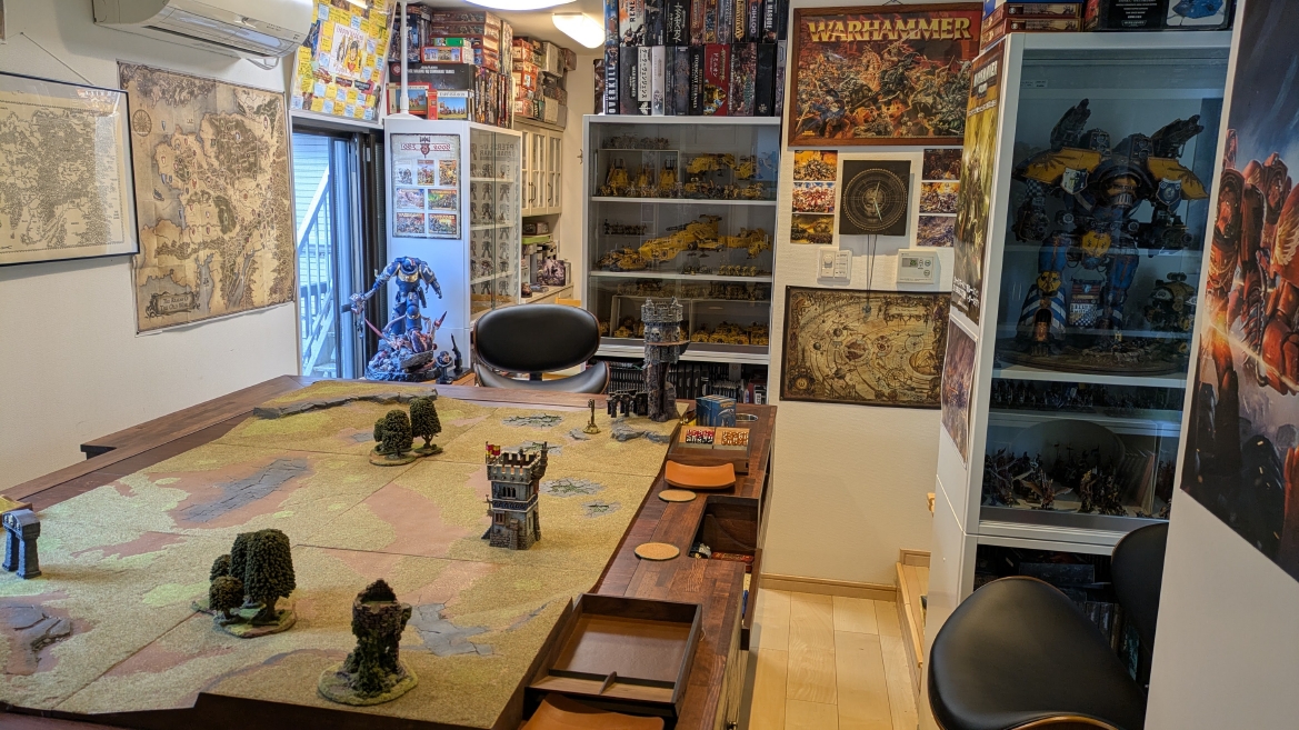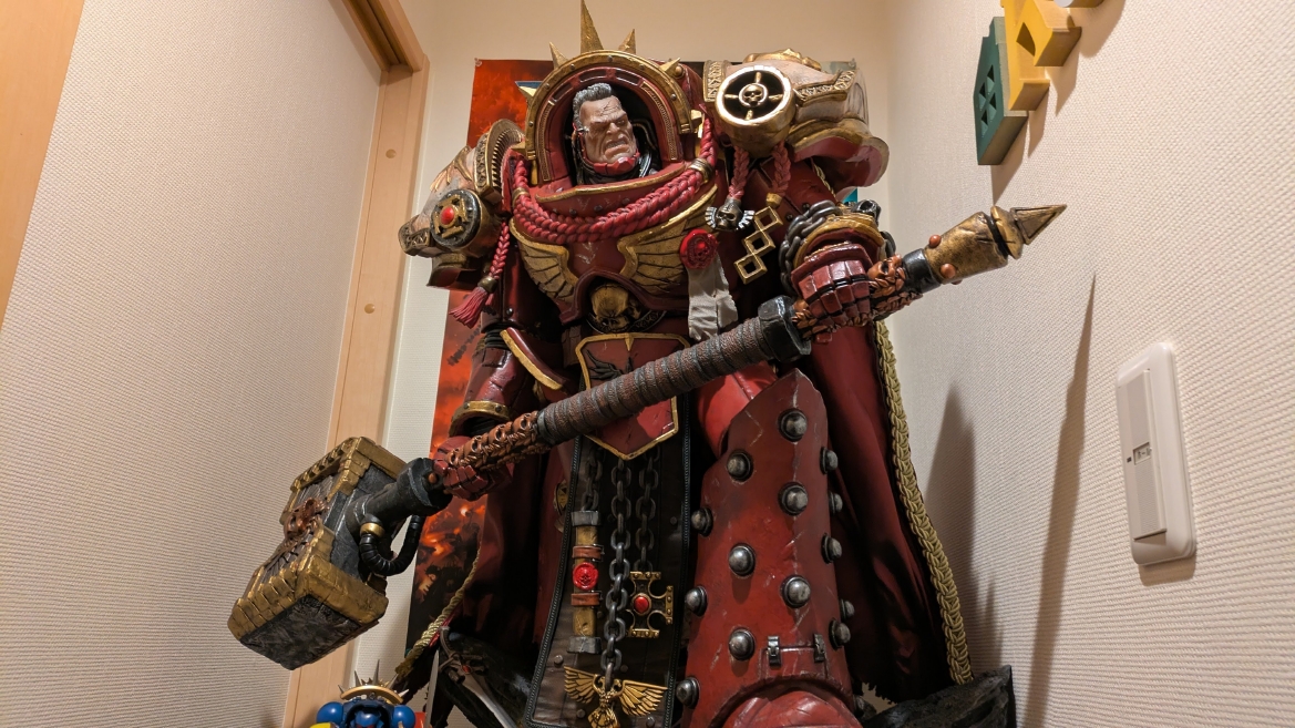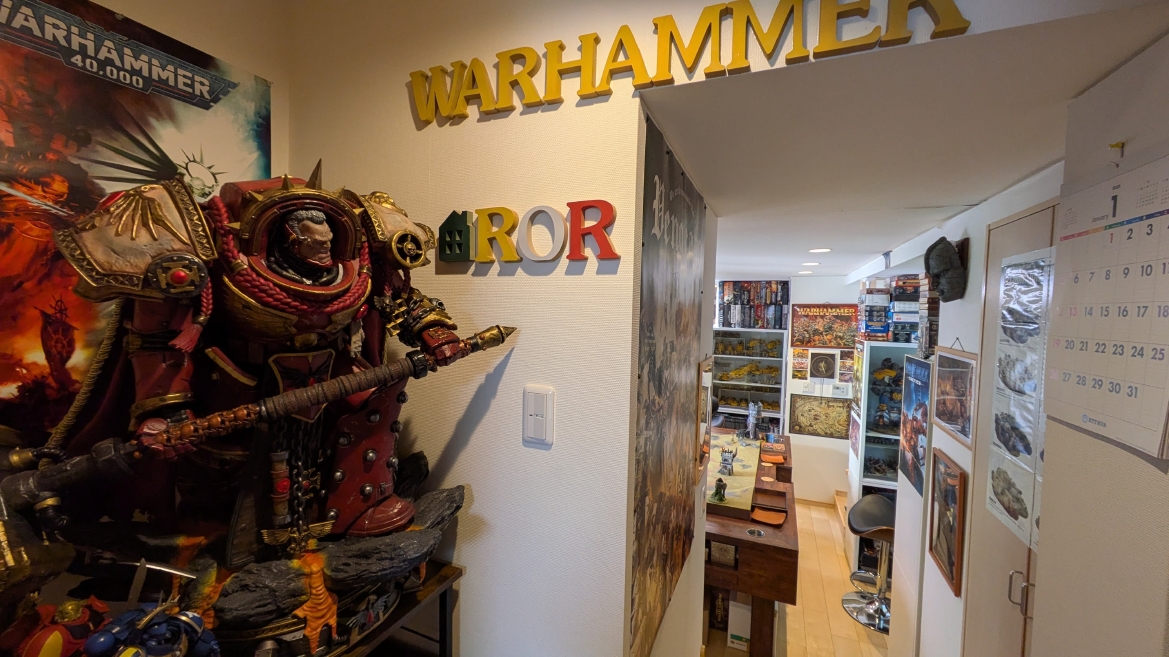 ウォーハンマーカフェTOKYOにも飾ってあるそうですが、これは本当に一見の価値ありの逸品です。 サイズもアンジェロス閣下ほどではなくて程よいボリュームなので、お部屋のワンポイントに導入すると間違いなく幸せになれますよ! もう早くも2025年ベストバイのアイテムとなりました。 ![]() アンジェロス閣下にはタイタス副官に場所を譲っていただいたので、お部屋の入口に移動させました。 重さ40キロのスタチューを移動させるのはホントにしんどかったです。1回バラしたんですけども、土台がすさまじい重量で腕パンパンになりましたよ。 いやしかし、でかい。こちらはずっと1/6サイズと思い込んでたのですが、1/4サイズだそうです。どうりでデカいわけです。 ![]() 僕のウォーハンマー部屋の入口の両脇にスタチュー。 さながらお寺の入口とかに鎮座する仁王像のごとき存在感です。すごい圧がありますね。これは。 ![]() アンジェロス閣下に対面するように配置されたのは日本ではほとんど観測されていないHMO製グィリマン閣下であります。 これもすごい良い出来栄えなので、僕のウォーハンマールームの一つの目玉アイテムであります。 ![]() 3体の大型スタチューが配置された我がウォーハンマールーム。 将来ウォーハンマーミュージアムYAMAGUCHIをオープンするための準備が着々と進んでいるといったところでしょうか(笑)。 まぁ、でも今回は何とか配置できましたが、次は流石にもう置き場所が厳しいのでこれ以上は増やせそうにないところが悩みではあります。 Weta社からはアバドン・ザ・デスポイラーや聖セレスティアンのスタチューも発売されましたので、欲しいのは欲しいんですけどねぇ… ![]() いずれ、この部屋以外の部屋もしっかりウォーハンマーを遊べるように整えて、 日本全国から趣味人をお招きしてコーヒー片手にゆったりゲームしながら過ごせるウォーハンマーミュージアムカフェやまぐちを開きたいなと夢描いているところです。 まぁ大袈裟なんですけどね。 子供が小学生ということで、まだまだ週末の自由時間確保は難しい状況ですので、10年単位の少し先の話ですが、 もうウォーハンマーは僕の人生みたいなものなので、その時が来るまで準備を怠らず、かつマイペースに楽しんでいきます。 いつか趣味人の皆さんをお招きするのが楽しみです! |