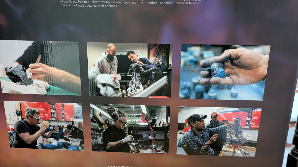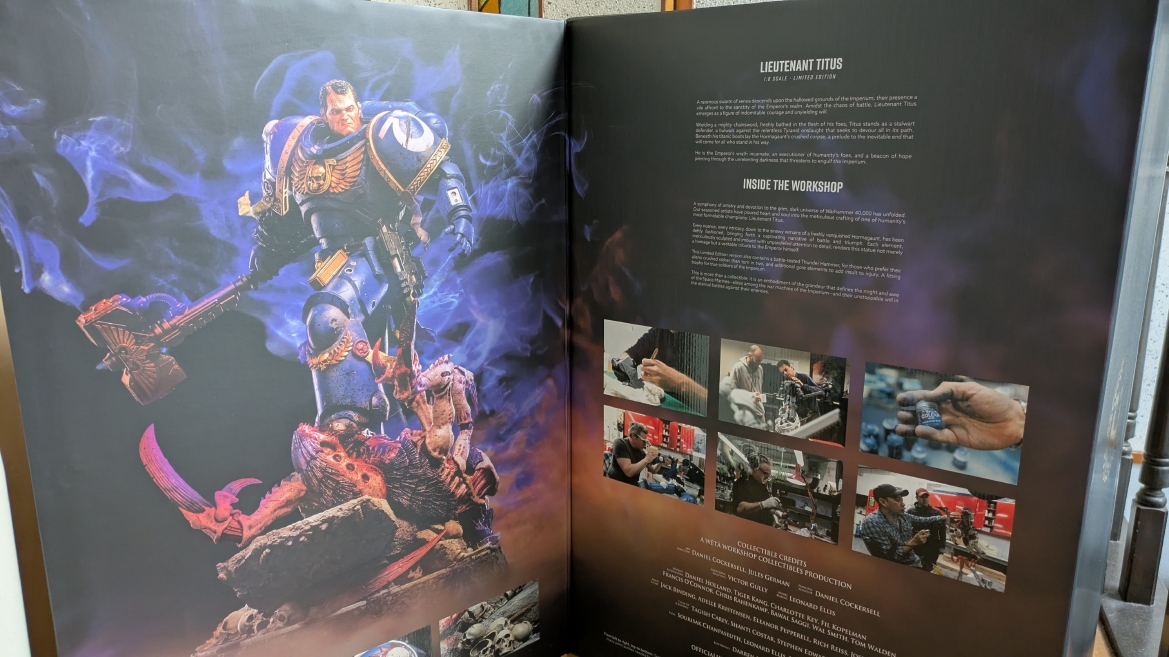 僕が購入したのはバトルダメージ塗装と武装オプションが付属された限定版です。全世界1300個のうちの1つ。 ところで、1300個も売れるんでしょうか、こういうアイテムって。 ![]() 何と化粧箱は磁石仕込みで扉絵付き!凝ってる! ![]() 中には作品の解説と美麗な写真がどーんと飾られていました。 凄い豪華ですね!中身だけでなく、ボックスにもここまで拘っているのを見ると、丁寧に作られたプロダクトであることが伝わってきます。 ![]() このボックス、良いものなんですが、物理的な事情でいずれは処分しなければいけないため、この記事に写真載せて読み返せるようにしておきます。 ![]() 制作風景の写真も素敵ですね。工場で大量生産ではなく、職人がしっかり制作していることがわかります。 シタデルカラーも使ってるんでしょうか。 ![]() 係わったスタッフ一覧。素晴らしい仕事をされたと思います。もうすでに凄い製品であることが伝わってきますからね! ![]() 限定版の特徴である交換用武器のスタンドとサンダーハンマー、チェーンソードは血液ほとばしるエフェクト版が付属しています。 ![]() ゲーム版スペースマリーンの特徴でもある肩パッドのリム部分の精緻な彫も完全に再現され、さらに緻密なペイントが施されています。 細部までクオリティ高そうで楽しみですねぇ。 ![]() 中身を引っ張り出しました。いつもの発泡スチロール的な。 ![]() それなりに高額商品ですので、きっちり丁寧な梱包です。 ![]() クオリティ高すぎる!!肌の質感、本物感がすごい!! ![]() 限定版だけのサンダーハンマーも非常に美しい仕上がり!金色の輝きがメッキっぽくてカッコイイです。 ![]() 2段仕込みで、タイタスや土台がドーンと。 あ、でも説明書が入ってないですね、これ。今まで買ったスタチューは一応写真付きの組み立て説明書が入ってましたのでちょっと残念でした。 まぁ、間違えて組むようなこともないでしょうけどね…。 ![]() 土台のティラニッドの作り込みが実はかなり凄いです。おまけのレベルじゃなく、タイタスとティラニッドのスタチューなのですね。 ![]() 僕の限定版は552番目の製品でした。 思ったよりけっこう売れてますね!(失礼)こりゃほんとに1300個作られるのかもしれませんね? ![]() ポリストーン製のタイタス副官!けっこうな重さです。ガブリエル・アンジェロスの大きさに慣れているので、驚くほどの重さではありませんが… ![]() 腕もこの重厚な造り。二度と見ることが無さそうな肩パッドの裏も写真に残しておきましょう。 ![]() 塗装が素晴らしいです。重みのあるブルー。汚しやダメージ表現も非常にリアルです。まさにスペースマリーンが実在するなら、これぞ、という雰囲気があります。 ![]() 胸当ての見事な彫刻。金色の塗装がまた重厚さと輝きのベストな仕上がりでとにかく美しい! ![]() ピューリティーシールの書き込みもリアル!! ![]() 本物感が素晴らしいです。 来たぞタイタス副官!! ![]() どひゃー!!かっこいいぃぃぃぃいい!!! もう本物の閣下にしか見えない。 ![]() ヘルメット装備しても最高だぁぁ!!