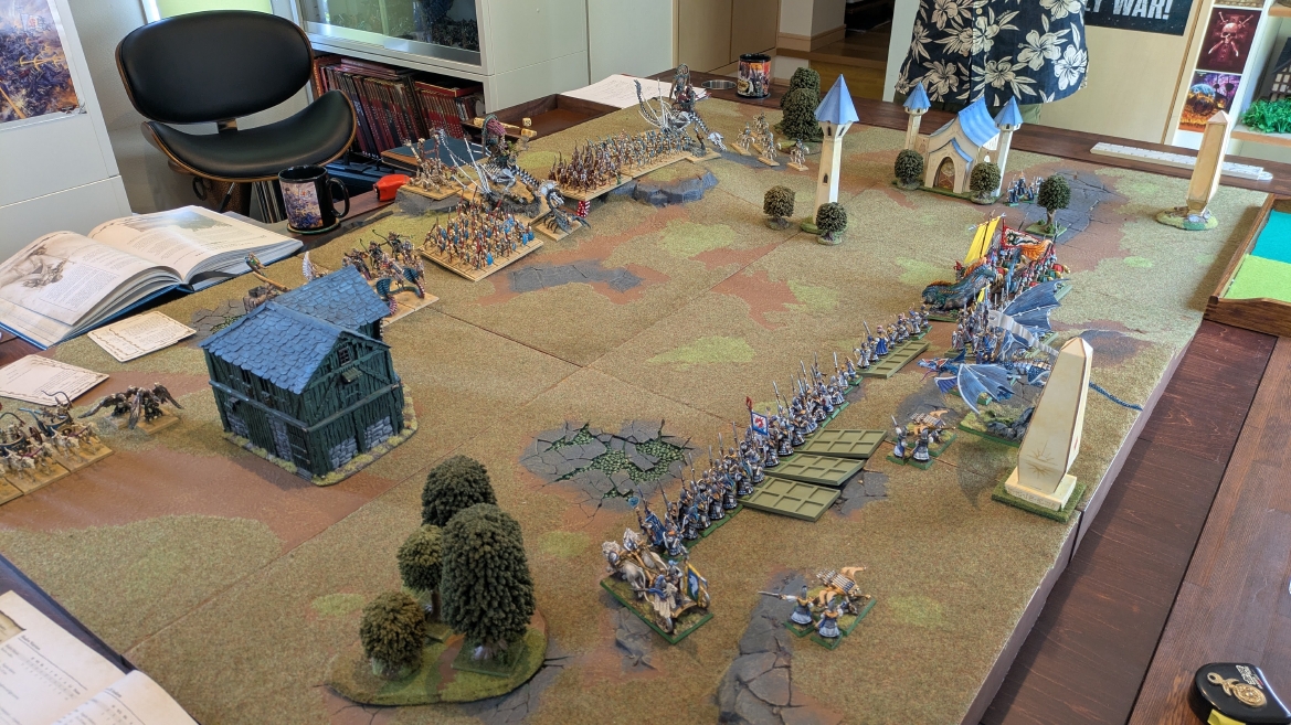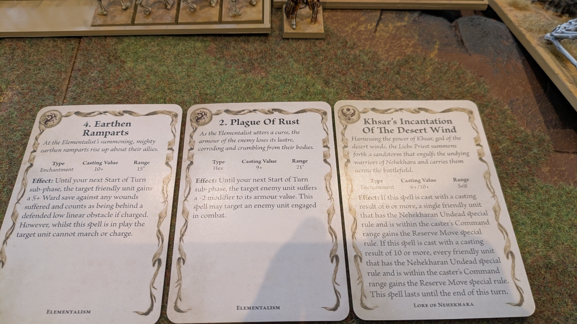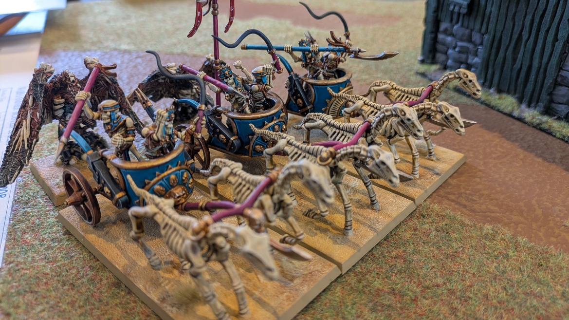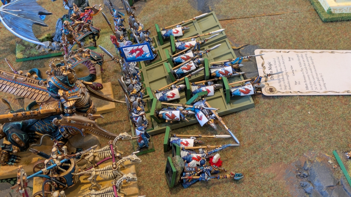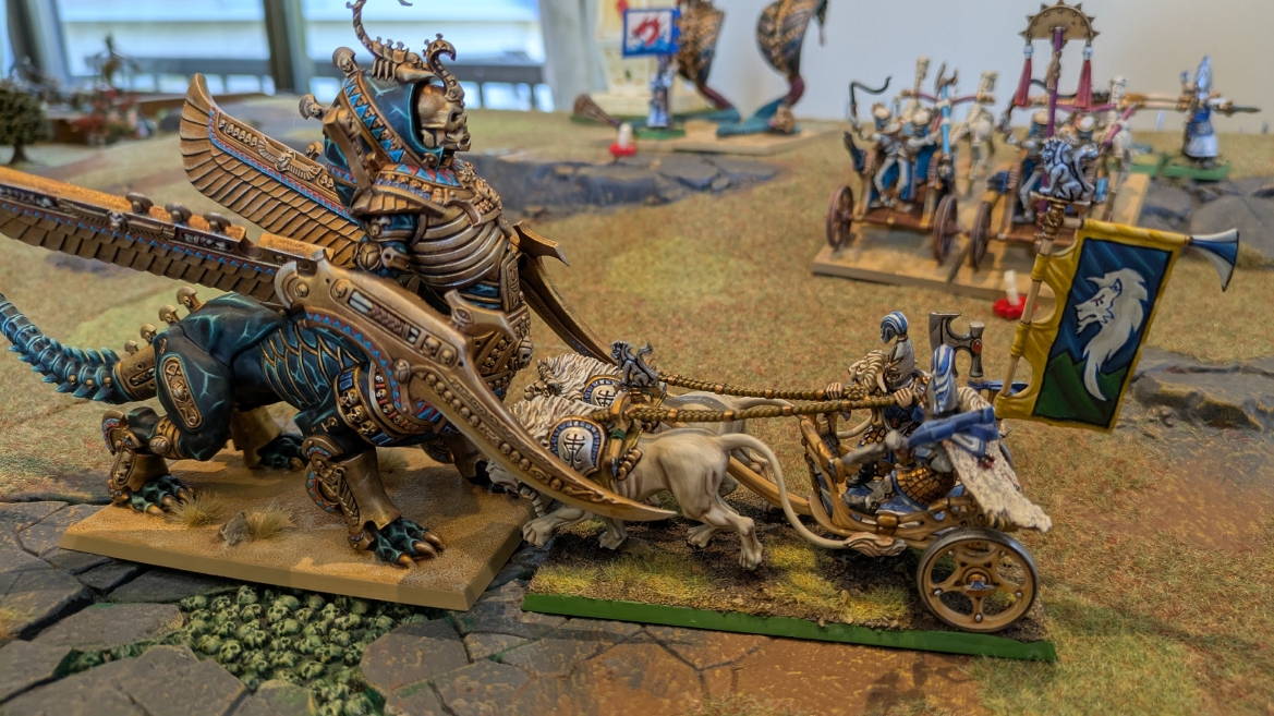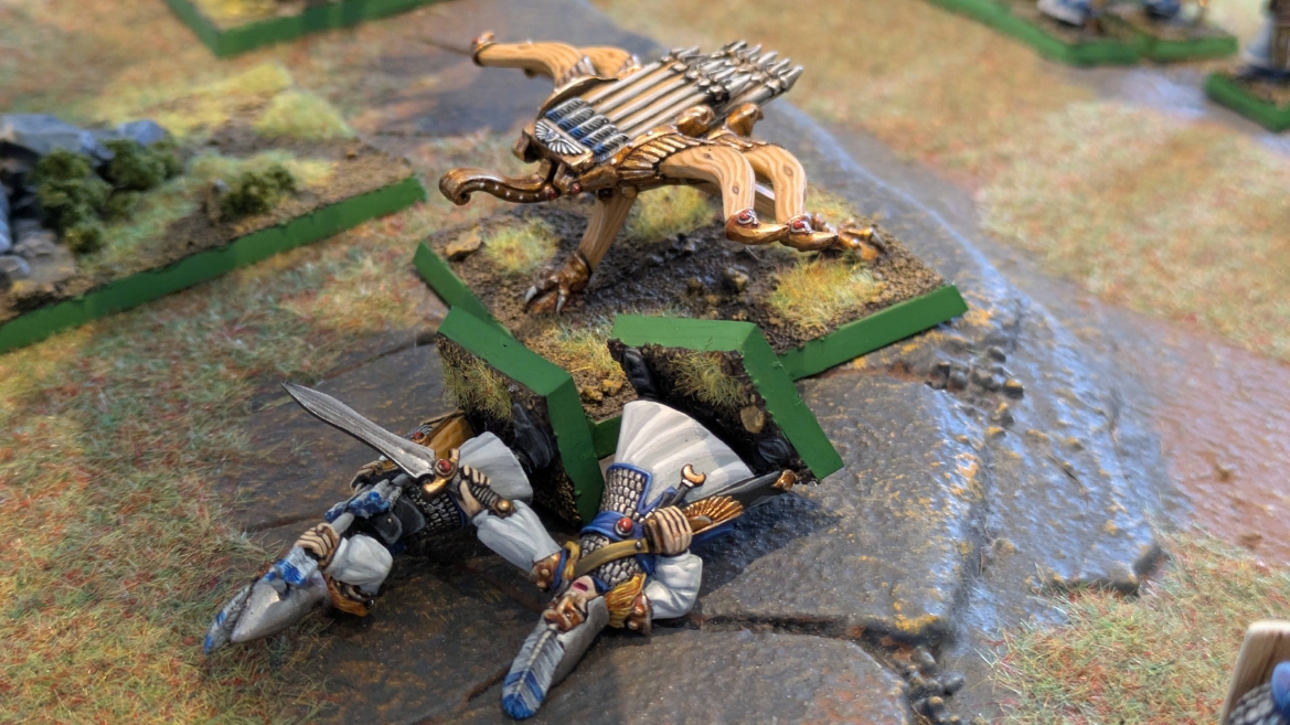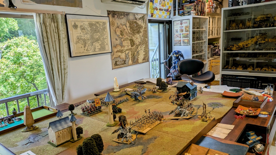 | ハイエロファントが取得した魔法はこの3つ。 バトル開始です。 ![]() ハイエルフが先行!矢の雨を降らせる!! ![]() 何と!S3の矢でトゥームスコーピオンを討ち取りました。ブレトニアのペザントボウマンの矢とは精度が違う!! うひょお! ![]() BS5もあるシャドウウォーリアーの弓はかなりの確率で当たります。5体でもけっこう活躍できるかも。 ![]() 軽騎兵2体討ち取りました。 ![]() ボルトスロアー3機がそれぞれ威力の強い単発ボルトを放つ! ![]() ヒットロールで3台中2台失敗という不甲斐なさ!1発は当たるもダメージ1点!あるぇ!?こんなはずでは。 (予定ではこのターンにスフィンクス轟沈だったんですが)(見積もりが甘い) ![]() トゥームキングの後半戦が始まります。 ![]() ![]() 躊躇なく迫りくるトゥームキングの軍勢! ![]() 射撃フェイズ。スクリーミングスカルカタパルトはミスファイア。 もはや定番の出来事になった感すらありますね(笑)。クルー1体死亡です。 ![]() スケルトンチャリオットが放つ矢が侮れない。 ![]() シーガード4体も死亡!? ![]() しかも追加移動までしてくるので、かなりの機動力を見せつけられます。 昔のトゥームキングの格言に「チャリオットを制するものはトゥームキングを制する」とありましたが(ほんとに公式の出版物に書いてあった)、 こういうことだよなぁって何か実感がありますね。 ![]() グレイトボウから放たれる巨大な矢が狙うはボルトスロアー。 ![]() いとも簡単にボルトスロアー1機轟沈。うわ〜これはつらい。 ![]() 丘の上から降り注ぐアーサプの矢。 ![]() アーマーの無いアーチャーは2体死亡にとどまりました。これはむしろラッキーでしたかね。 これにてお昼になりましたの昼食です。 ![]() 近所のお蕎麦屋さん兎屋にてお蕎麦を頂きました。いつ来ても美味しいですね。御馳走様でした。 ![]() アークメイジがファイアリーコンボケーションを放つ! ![]() 昔のかっこいいテンプレートを使ってみました。まぁダメージには繋がりませんでしたが…(笑) ![]() シーガードが射撃します。ここがダイスいっぱい振れて楽しいですね。 ![]() チャリオット一機撃沈! ![]() イーグルクロウ頑張れ! ![]() 全然当たりません。おかしい。 こんなはずでは(予定ではネクロスフィンクスとネクロポリスナイトは消滅しているはずだったが…)んなわけないか‥ ![]() 2ターン目後半戦、一気に盤面が動いてまいります。 ![]() と、その前にこの光景が素晴らしいですね。我がウォーハンマールームでオールドワールドは実に雰囲気が良いです。 最高のゲーム空間と言っても過言ではないと自画自賛したくなりますね、これは。 ![]() などと余裕こいてる場合ではなく、突撃きまりました。 やばいです。 ![]() さらにチャリオットまで追い打ちかけてきました。これは流石に厳しい!! ![]() スクリーミングスカルカタパルト、今度は頑張ってくださいね〜と余裕こいていたら… ![]() ドラゴンプリンス直撃!おっとぉおお!これは… ![]() 精鋭3体が血祭りに。うわぁ大戦果じゃないですか。 ![]() アーチャーのボウがけっこうプレッシャーではあります。 ![]() まぁ、ボウなんてこんなもんです、本来は。 ![]() しかしウシャブティのグレイトボウが放つ矢の威力はあなどれません! ![]() またイーグルクロウ轟沈。やばい。 ![]() 圧倒的殺戮が始まります。 ![]() テクリス風アークメイジ瞬殺! ![]() アララララ・・・・ まぁ、そうなりますよね的な。 ![]() ブレイクテストで奇跡の奮闘を見せるわけもなく、ブレイクです。 ![]() そしてネクロポリスナイトに追いつかれ全滅しました。うわぁ〜ん。 ![]() いや〜なんか厳しい展開ですね。はやくも。 ![]() 一気に戦局が傾いてしまった気もしますが、まだまだチャンスはある! ![]() しかし、こちらの戦線は敵との距離が遠く、攻めあぐねてしまいます。 ![]() 位置的に突撃されるぐらいなら、自分からするしかないとばかりにライオンチャリオット、ネクロスフィンクに突撃してみましたが果たして。 ![]() 普通に返り討ちに。まぁそうですよね… ![]() チャリオットの追撃に巻き込まれていたイーグルクロウもあっさり破壊され、我が軍の虎の子であったウォーマシン、何の成果もあげられないまま全滅です! ぎゃふん。 ![]() 3ターン後半戦、一気に攻めてくる骨の軍勢。 ![]() ![]() 何と高い移動力を駆使してトゥームキングはドラゴンプリンスの側面に降臨。 うわぁ、やばい雰囲気しかしない。 ![]() ボーンドラゴン、ブレスも吐いてきます。 ![]() がっつりブレス喰らってますがこれは厚いアーマーのおかげで1人死亡で済みました。 ![]() ネクロスフィンクス無双が始まってます。いやぁ、ブレトニアでいつも最初に倒せてるからちょっと感覚麻痺してました。 普通にグロい強さですこいつ。 ![]() 4ターン目前半! なんか中途半端に前に出過ぎて突撃できる相手がスケルトンしかいなくなっちゃったプリンス、突撃です。 ほんとはボーンドラゴン討伐にいきたかった〜〜〜〜 ![]() 盤面中央では大激突が始まりました