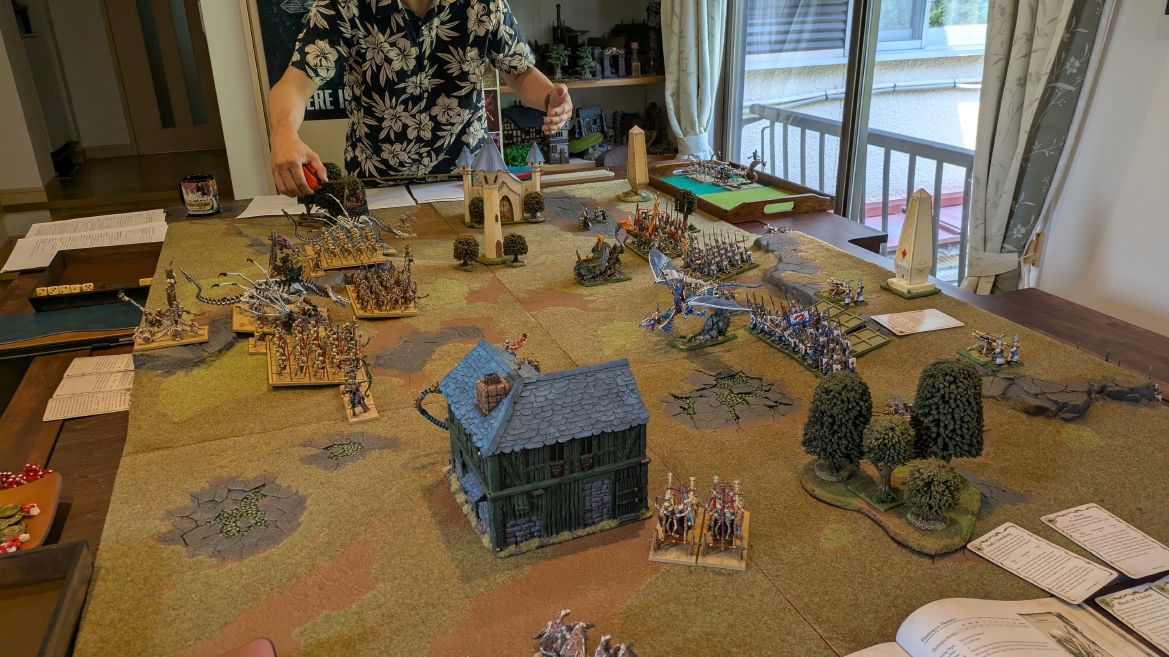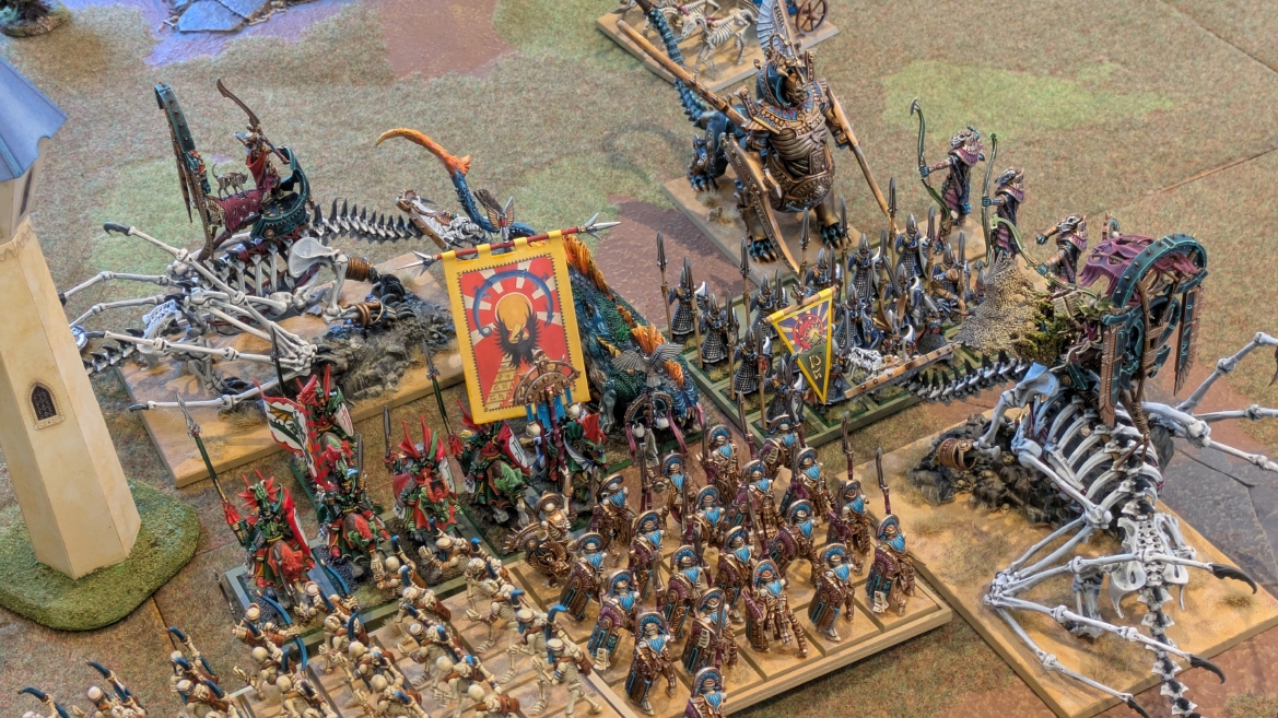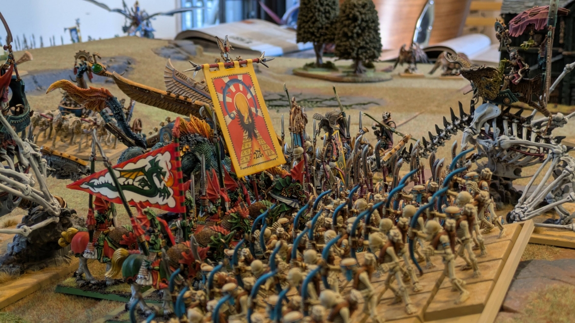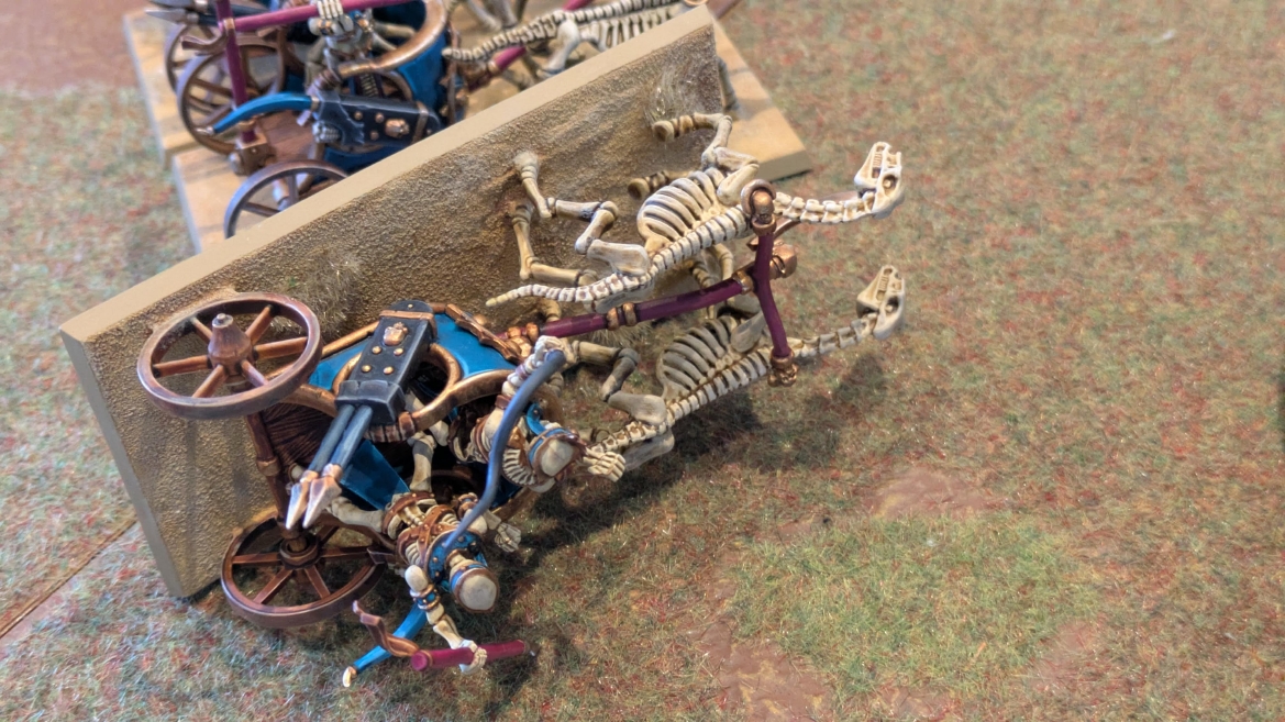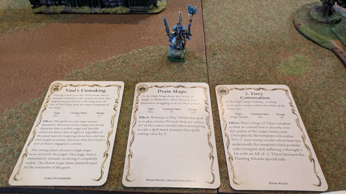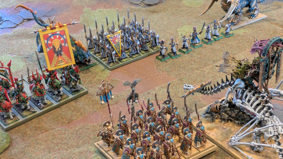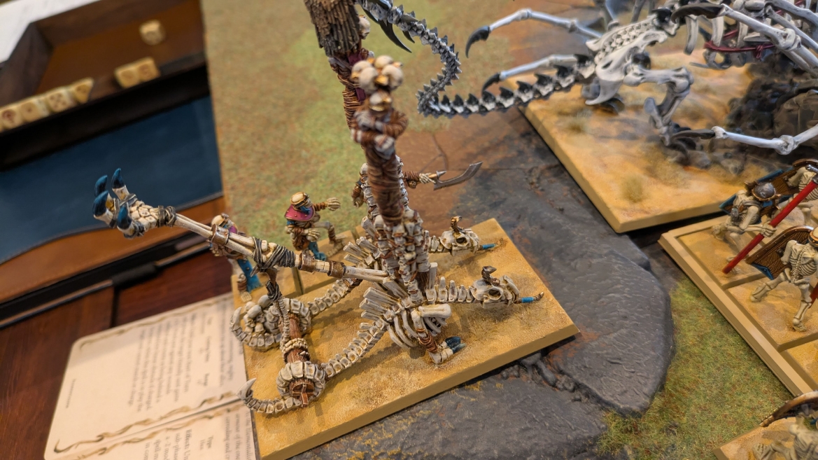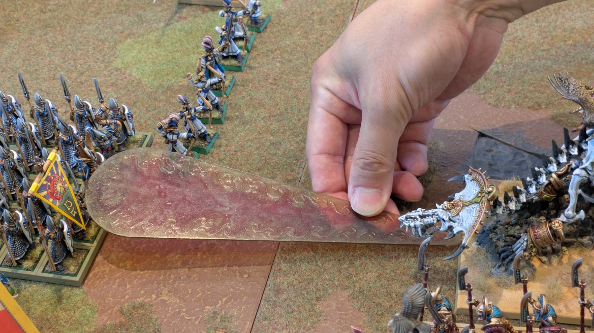 | ハイエロファントが取得した魔法はこの3つ。 バトル開始です。 ![]() ハイエルフが先行!矢の雨を降らせる!! ![]() 何と!S3の矢でトゥームスコーピオンを討ち取りました。ブレトニアのペザントボウマンの矢とは精度が違う!! うひょお! ![]() BS5もあるシャドウウォーリアーの弓はかなりの確率で当たります。5体でもけっこう活躍できるかも。 ![]() 軽騎兵2体討ち取りました。 ![]() ボルトスロアー3機がそれぞれ威力の強い単発ボルトを放つ! ![]() ヒットロールで3台中2台失敗という不甲斐なさ!1発は当たるもダメージ1点!あるぇ!?こんなはずでは。 (予定ではこのターンにスフィンクス轟沈だったんですが)(見積もりが甘い) ![]() トゥームキングの後半戦が始まります。 ![]() ![]() 躊躇なく迫りくるトゥームキングの軍勢! ![]() 射撃フェイズ。スクリーミングスカルカタパルトはミスファイア。 もはや定番の出来事になった感すらありますね(笑)。クルー1体死亡です。 ![]() スケルトンチャリオットが放つ矢が侮れない。 ![]() シーガード4体も死亡!? ![]() しかも追加移動までしてくるので、かなりの機動力を見せつけられます。 昔のトゥームキングの格言に「チャリオットを制するものはトゥームキングを制する」とありましたが(ほんとに公式の出版物に書いてあった)、 こういうことだよなぁって何か実感がありますね。 ![]() グレイトボウから放たれる巨大な矢が狙うはボルトスロアー。 ![]() いとも簡単にボルトスロアー1機轟沈。うわ〜これはつらい。 ![]() 丘の上から降り注ぐアーサプの矢。 ![]() アーマーの無いアーチャーは2体死亡にとどまりました。これはむしろラッキーでしたかね。 これにてお昼になりましたの昼食です。 ![]() 近所のお蕎麦屋さん兎屋にてお蕎麦を頂きました。いつ来ても美味しいですね。御馳走様でした。 ![]() アークメイジがファイアリーコンボケーションを放つ! ![]() 昔のかっこいいテンプレートを使ってみました。まぁダメージには繋がりませんでしたが…(笑) ![]() シーガードが射撃します。ここがダイスいっぱい振れて楽しいですね。 ![]() チャリオット一機撃沈! ![]() イーグルクロウ頑張れ! ![]() 全然当たりません。おかしい。 こんなはずでは(予定ではネクロスフィンクスとネクロポリスナイトは消滅しているはずだったが…)んなわけないか‥ ![]() 2ターン目後半戦、一気に盤面が動いてまいります。 ![]() と、その前にこの光景が素晴らしいですね。我がウォーハンマールームでオールドワールドは実に雰囲気が良いです。 最高のゲーム空間と言っても過言ではないと自画自賛したくなりますね、これは。 ![]() などと余裕こいてる場合ではなく、突撃きまりました。 やばいです。 ![]() さらにチャリオットまで追い打ちかけてきました。これは流石に厳しい!! ![]() スクリーミングスカルカタパルト、今度は頑張ってくださいね〜と余裕こいていたら… ![]() ドラゴンプリンス直撃!おっとぉおお!これは… ![]() 精鋭3体が血祭りに。うわぁ大戦果じゃないですか。 ![]() アーチャーのボウがけっこうプレッシャーではあります。 ![]() まぁ、ボウなんてこんなもんです、本来は。 ![]() しかしウシャブティのグレイトボウが放つ矢の威力はあなどれません! ![]() またイーグルクロウ轟沈。やばい。 ![]() 圧倒的殺戮が始まります。 ![]() テクリス風アークメイジ瞬殺! ![]() アララララ・・・・ まぁ、そうなりますよね的な。 ![]() ブレイクテストで奇跡の奮闘を見せるわけもなく、ブレイクです。 ![]() そしてネクロポリスナイトに追いつかれ全滅しました。うわぁ〜ん。 ![]() いや〜なんか厳しい展開ですね。はやくも。 ![]() 一気に戦局が傾いてしまった気もしますが、まだまだチャンスはある! ![]() しかし、こちらの戦線は敵との距離が遠く、攻めあぐねてしまいます。 ![]() 位置的に突撃されるぐらいなら、自分からするしかないとばかりにライオンチャリオット、ネクロスフィンクに突撃してみましたが果たして。 ![]() 普通に返り討ちに。まぁそうですよね… ![]() チャリオットの追撃に巻き込まれていたイーグルクロウもあっさり破壊され、我が軍の虎の子であったウォーマシン、何の成果もあげられないまま全滅です! ぎゃふん。 ![]() 3ターン後半戦、一気に攻めてくる骨の軍勢。 ![]() ![]() 何と高い移動力を駆使してトゥームキングはドラゴンプリンスの側面に降臨。 うわぁ、やばい雰囲気しかしない。 ![]() ボーンドラゴン、ブレスも吐いてきます。 ![]() がっつりブレス喰らってますがこれは厚いアーマーのおかげで1人死亡で済みました。 ![]() ネクロスフィンクス無双が始まってます。いやぁ、ブレトニアでいつも最初に倒せてるからちょっと感覚麻痺してました。 普通にグロい強さですこいつ。 ![]() 4ターン目前半! なんか中途半端に前に出過ぎて突撃できる相手がスケルトンしかいなくなっちゃったプリンス、突撃です。 ほんとはボーンドラゴン討伐にいきたかった〜〜〜〜 ![]() 盤面中央では大激突が始まりました