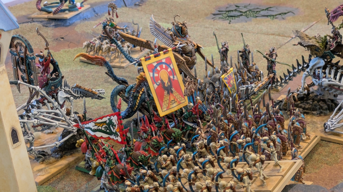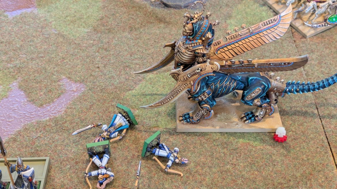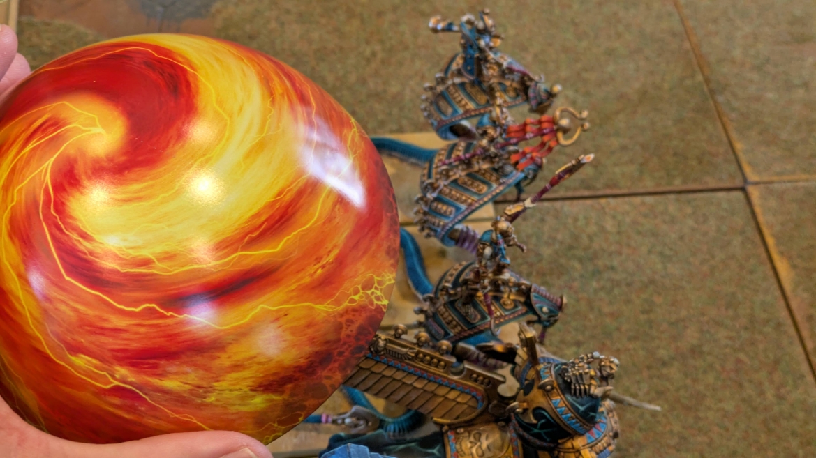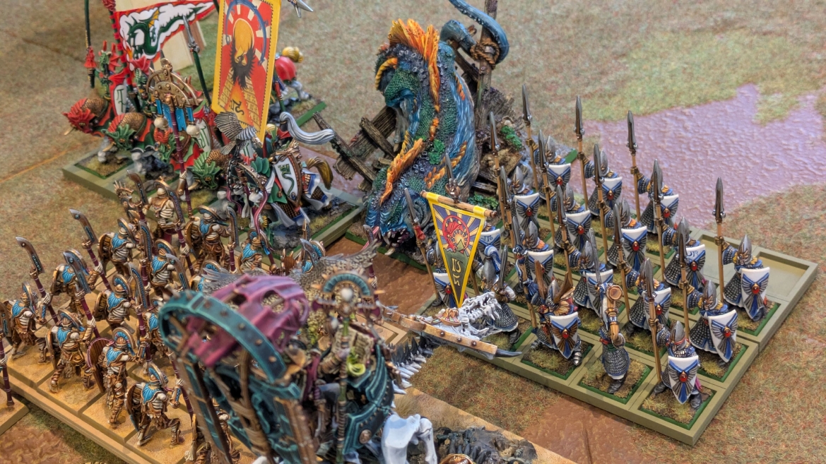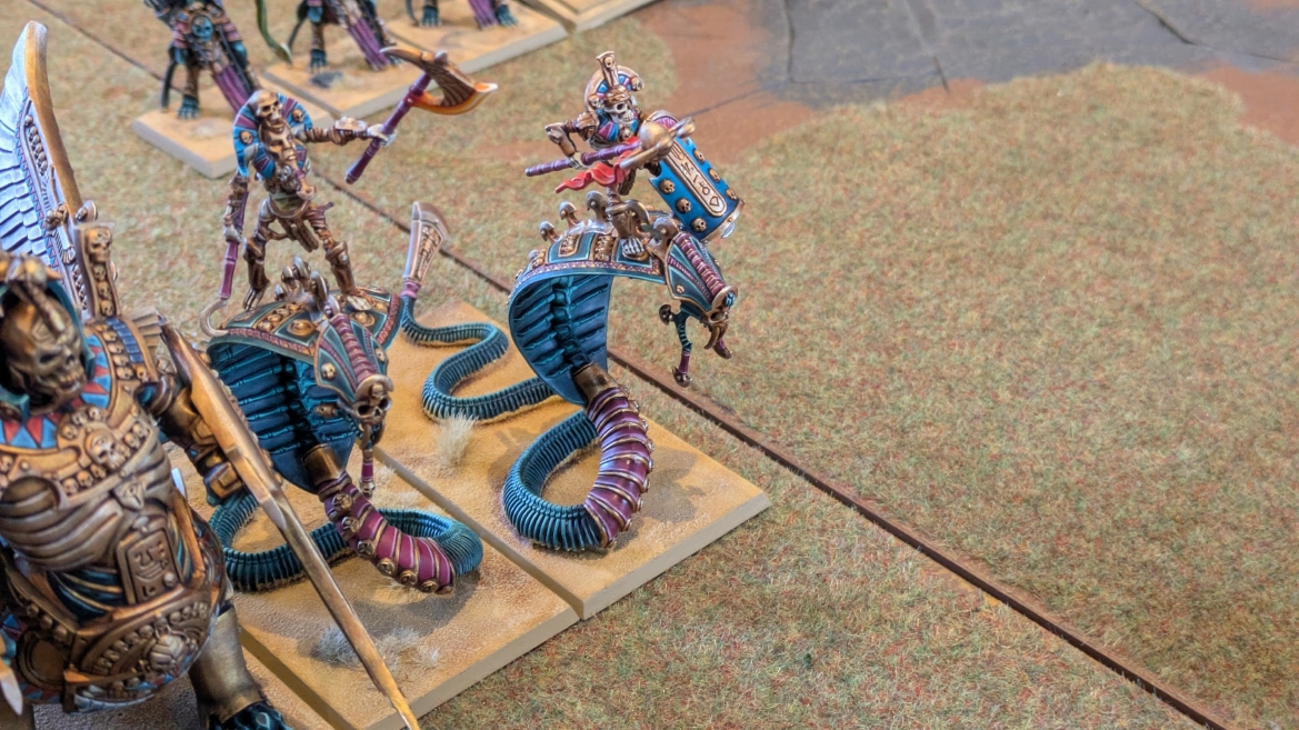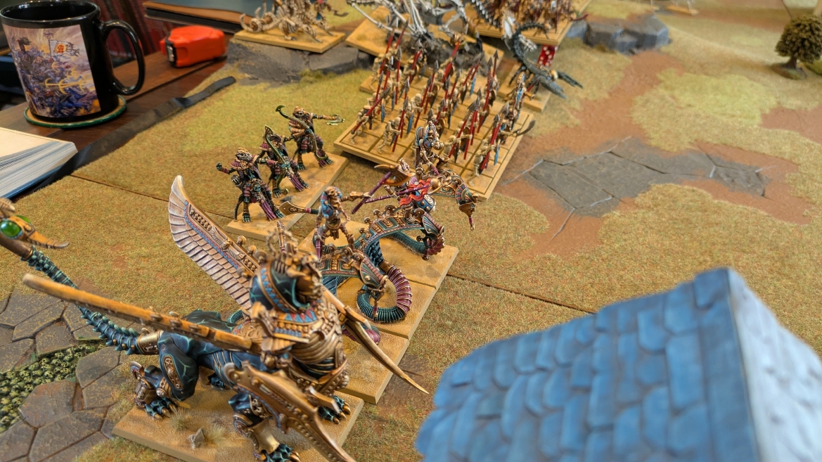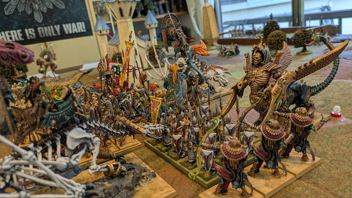 | ハイエロファントが取得した魔法はこの3つ。 バトル開始です。 ![]() ハイエルフが先行!矢の雨を降らせる!! ![]() 何と!S3の矢でトゥームスコーピオンを討ち取りました。ブレトニアのペザントボウマンの矢とは精度が違う!! うひょお! ![]() BS5もあるシャドウウォーリアーの弓はかなりの確率で当たります。5体でもけっこう活躍できるかも。 ![]() 軽騎兵2体討ち取りました。 ![]() ボルトスロアー3機がそれぞれ威力の強い単発ボルトを放つ! ![]() ヒットロールで3台中2台失敗という不甲斐なさ!1発は当たるもダメージ1点!あるぇ!?こんなはずでは。 (予定ではこのターンにスフィンクス轟沈だったんですが)(見積もりが甘い) ![]() トゥームキングの後半戦が始まります。 ![]() ![]() 躊躇なく迫りくるトゥームキングの軍勢! ![]() 射撃フェイズ。スクリーミングスカルカタパルトはミスファイア。 もはや定番の出来事になった感すらありますね(笑)。クルー1体死亡です。 ![]() スケルトンチャリオットが放つ矢が侮れない。 ![]() シーガード4体も死亡!? ![]() しかも追加移動までしてくるので、かなりの機動力を見せつけられます。 昔のトゥームキングの格言に「チャリオットを制するものはトゥームキングを制する」とありましたが(ほんとに公式の出版物に書いてあった)、 こういうことだよなぁって何か実感がありますね。 ![]() グレイトボウから放たれる巨大な矢が狙うはボルトスロアー。 ![]() いとも簡単にボルトスロアー1機轟沈。うわ〜これはつらい。 ![]() 丘の上から降り注ぐアーサプの矢。 ![]() アーマーの無いアーチャーは2体死亡にとどまりました。これはむしろラッキーでしたかね。 これにてお昼になりましたの昼食です。 ![]() 近所のお蕎麦屋さん兎屋にてお蕎麦を頂きました。いつ来ても美味しいですね。御馳走様でした。 ![]() アークメイジがファイアリーコンボケーションを放つ! ![]() 昔のかっこいいテンプレートを使ってみました。まぁダメージには繋がりませんでしたが…(笑) ![]() シーガードが射撃します。ここがダイスいっぱい振れて楽しいですね。 ![]() チャリオット一機撃沈! ![]() イーグルクロウ頑張れ! ![]() 全然当たりません。おかしい。 こんなはずでは(予定ではネクロスフィンクスとネクロポリスナイトは消滅しているはずだったが…)んなわけないか‥ ![]() 2ターン目後半戦、一気に盤面が動いてまいります。 ![]() と、その前にこの光景が素晴らしいですね。我がウォーハンマールームでオールドワールドは実に雰囲気が良いです。 最高のゲーム空間と言っても過言ではないと自画自賛したくなりますね、これは。 ![]() などと余裕こいてる場合ではなく、突撃きまりました。 やばいです。 ![]() さらにチャリオットまで追い打ちかけてきました。これは流石に厳しい!! ![]() スクリーミングスカルカタパルト、今度は頑張ってくださいね〜と余裕こいていたら… ![]() ドラゴンプリンス直撃!おっとぉおお!これは… ![]() 精鋭3体が血祭りに。うわぁ大戦果じゃないですか。 ![]() アーチャーのボウがけっこうプレッシャーではあります。 ![]() まぁ、ボウなんてこんなもんです、本来は。 ![]() しかしウシャブティのグレイトボウが放つ矢の威力はあなどれません! ![]() またイーグルクロウ轟沈。やばい。 ![]() 圧倒的殺戮が始まります。 ![]() テクリス風アークメイジ瞬殺! ![]() アララララ・・・・ まぁ、そうなりますよね的な。 ![]() ブレイクテストで奇跡の奮闘を見せるわけもなく、ブレイクです。 ![]() そしてネクロポリスナイトに追いつかれ全滅しました。うわぁ〜ん。 ![]() いや〜なんか厳しい展開ですね。はやくも。 ![]() 一気に戦局が傾いてしまった気もしますが、まだまだチャンスはある! ![]() しかし、こちらの戦線は敵との距離が遠く、攻めあぐねてしまいます。 ![]() 位置的に突撃されるぐらいなら、自分からするしかないとばかりにライオンチャリオット、ネクロスフィンクに突撃してみましたが果たして。 ![]() 普通に返り討ちに。まぁそうですよね… ![]() チャリオットの追撃に巻き込まれていたイーグルクロウもあっさり破壊され、我が軍の虎の子であったウォーマシン、何の成果もあげられないまま全滅です! ぎゃふん。 ![]() 3ターン後半戦、一気に攻めてくる骨の軍勢。 ![]() ![]() 何と高い移動力を駆使してトゥームキングはドラゴンプリンスの側面に降臨。 うわぁ、やばい雰囲気しかしない。 ![]() ボーンドラゴン、ブレスも吐いてきます。 ![]() がっつりブレス喰らってますがこれは厚いアーマーのおかげで1人死亡で済みました。 ![]() ネクロスフィンクス無双が始まってます。いやぁ、ブレトニアでいつも最初に倒せてるからちょっと感覚麻痺してました。 普通にグロい強さですこいつ。 ![]() 4ターン目前半! なんか中途半端に前に出過ぎて突撃できる相手がスケルトンしかいなくなっちゃったプリンス、突撃です。 ほんとはボーンドラゴン討伐にいきたかった〜〜〜〜 ![]() 盤面中央では大激突が始まりました