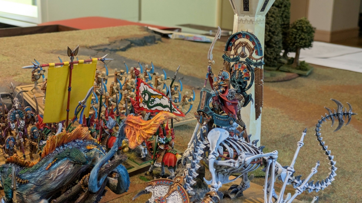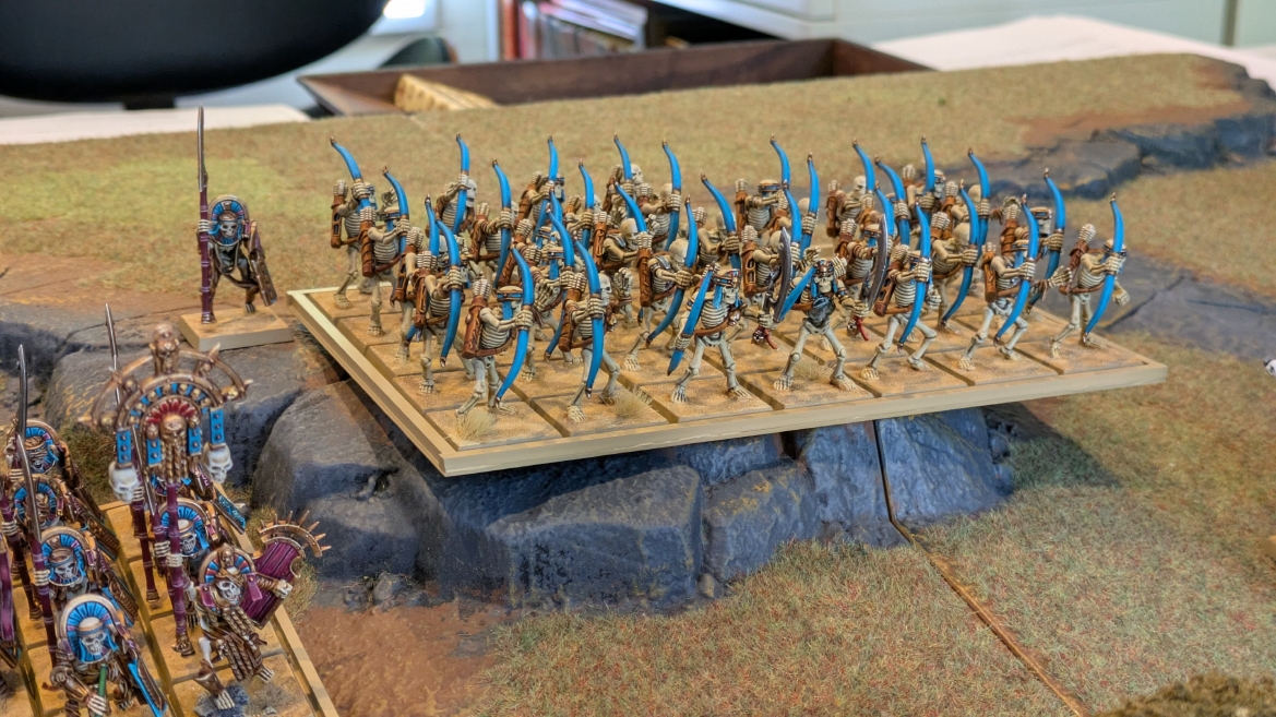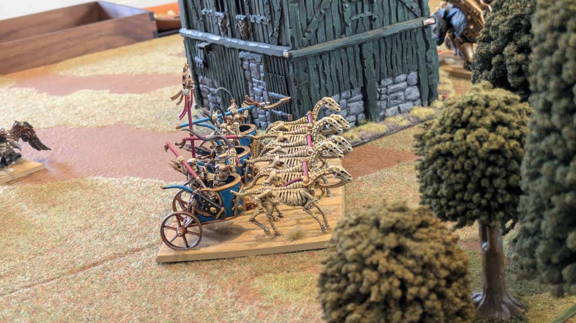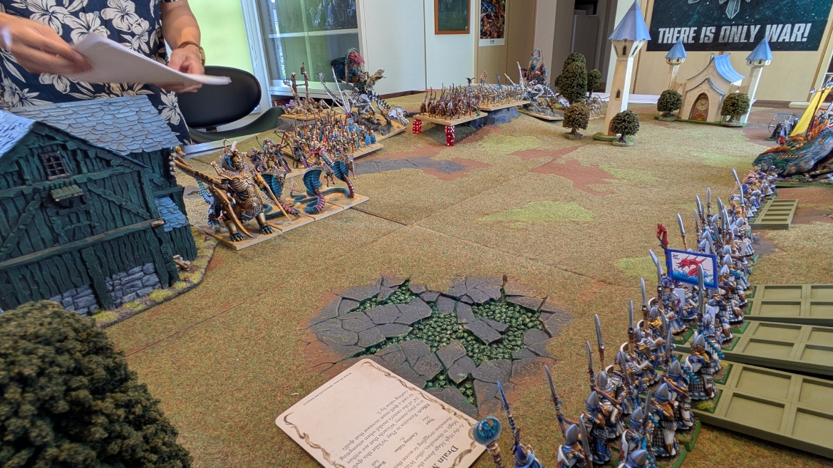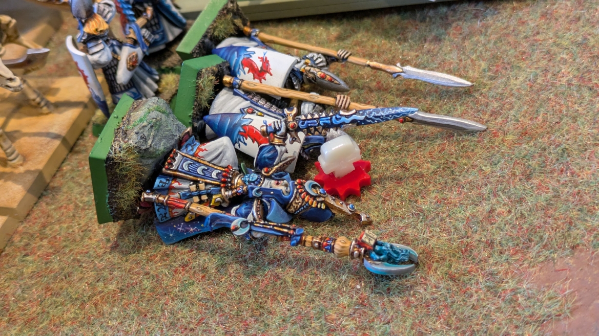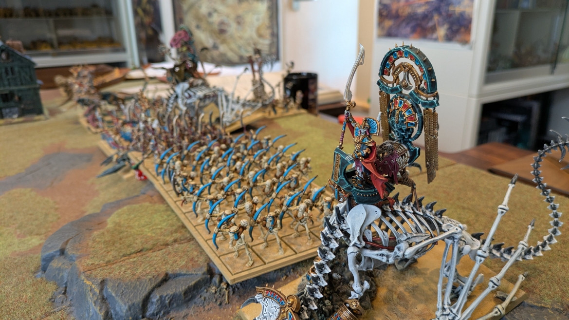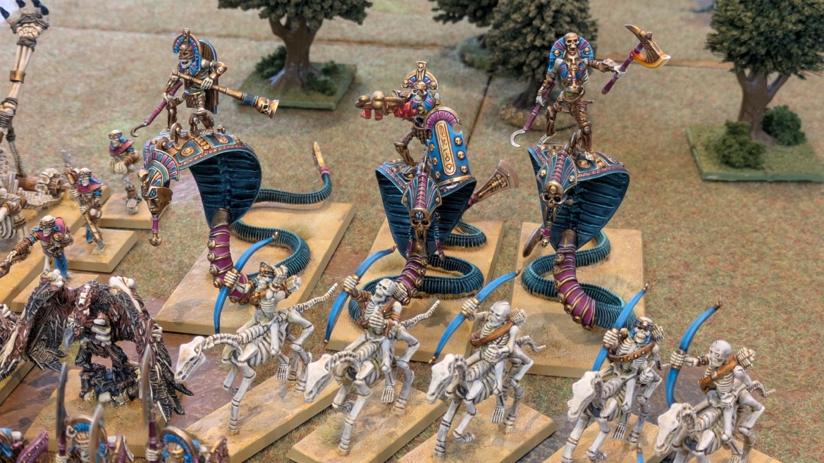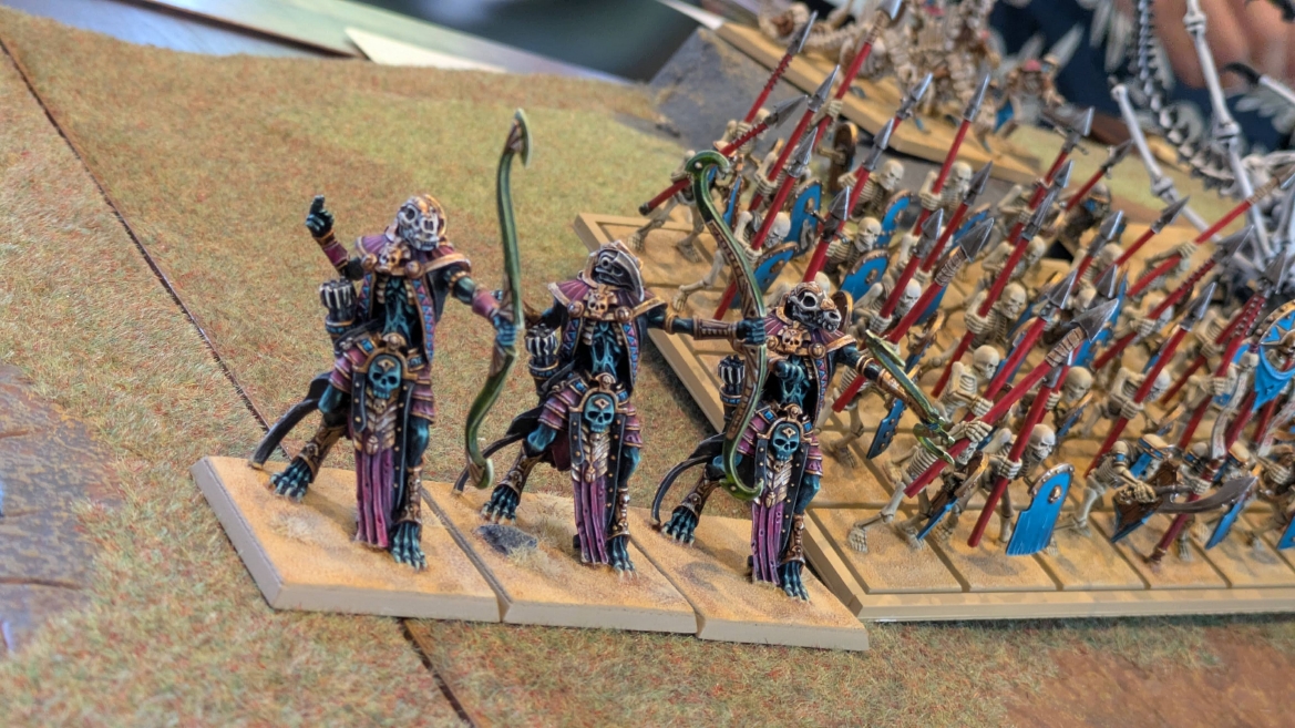 | ハイエロファントが取得した魔法はこの3つ。 バトル開始です。 ![]() ハイエルフが先行!矢の雨を降らせる!! ![]() 何と!S3の矢でトゥームスコーピオンを討ち取りました。ブレトニアのペザントボウマンの矢とは精度が違う!! うひょお! ![]() BS5もあるシャドウウォーリアーの弓はかなりの確率で当たります。5体でもけっこう活躍できるかも。 ![]() 軽騎兵2体討ち取りました。 ![]() ボルトスロアー3機がそれぞれ威力の強い単発ボルトを放つ! ![]() ヒットロールで3台中2台失敗という不甲斐なさ!1発は当たるもダメージ1点!あるぇ!?こんなはずでは。 (予定ではこのターンにスフィンクス轟沈だったんですが)(見積もりが甘い) ![]() トゥームキングの後半戦が始まります。 ![]() ![]() 躊躇なく迫りくるトゥームキングの軍勢! ![]() 射撃フェイズ。スクリーミングスカルカタパルトはミスファイア。 もはや定番の出来事になった感すらありますね(笑)。クルー1体死亡です。 ![]() スケルトンチャリオットが放つ矢が侮れない。 ![]() シーガード4体も死亡!? ![]() しかも追加移動までしてくるので、かなりの機動力を見せつけられます。 昔のトゥームキングの格言に「チャリオットを制するものはトゥームキングを制する」とありましたが(ほんとに公式の出版物に書いてあった)、 こういうことだよなぁって何か実感がありますね。 ![]() グレイトボウから放たれる巨大な矢が狙うはボルトスロアー。 ![]() いとも簡単にボルトスロアー1機轟沈。うわ〜これはつらい。 ![]() 丘の上から降り注ぐアーサプの矢。 ![]() アーマーの無いアーチャーは2体死亡にとどまりました。これはむしろラッキーでしたかね。 これにてお昼になりましたの昼食です。 ![]() 近所のお蕎麦屋さん兎屋にてお蕎麦を頂きました。いつ来ても美味しいですね。御馳走様でした。 ![]() アークメイジがファイアリーコンボケーションを放つ! ![]() 昔のかっこいいテンプレートを使ってみました。まぁダメージには繋がりませんでしたが…(笑) ![]() シーガードが射撃します。ここがダイスいっぱい振れて楽しいですね。 ![]() チャリオット一機撃沈! ![]() イーグルクロウ頑張れ! ![]() 全然当たりません。おかしい。 こんなはずでは(予定ではネクロスフィンクスとネクロポリスナイトは消滅しているはずだったが…)んなわけないか‥ ![]() 2ターン目後半戦、一気に盤面が動いてまいります。 ![]() と、その前にこの光景が素晴らしいですね。我がウォーハンマールームでオールドワールドは実に雰囲気が良いです。 最高のゲーム空間と言っても過言ではないと自画自賛したくなりますね、これは。 ![]() などと余裕こいてる場合ではなく、突撃きまりました。 やばいです。 ![]() さらにチャリオットまで追い打ちかけてきました。これは流石に厳しい!! ![]() スクリーミングスカルカタパルト、今度は頑張ってくださいね〜と余裕こいていたら… ![]() ドラゴンプリンス直撃!おっとぉおお!これは… ![]() 精鋭3体が血祭りに。うわぁ大戦果じゃないですか。 ![]() アーチャーのボウがけっこうプレッシャーではあります。 ![]() まぁ、ボウなんてこんなもんです、本来は。 ![]() しかしウシャブティのグレイトボウが放つ矢の威力はあなどれません! ![]() またイーグルクロウ轟沈。やばい。 ![]() 圧倒的殺戮が始まります。 ![]() テクリス風アークメイジ瞬殺! ![]() アララララ・・・・ まぁ、そうなりますよね的な。 ![]() ブレイクテストで奇跡の奮闘を見せるわけもなく、ブレイクです。 ![]() そしてネクロポリスナイトに追いつかれ全滅しました。うわぁ〜ん。 ![]() いや〜なんか厳しい展開ですね。はやくも。 ![]() 一気に戦局が傾いてしまった気もしますが、まだまだチャンスはある! ![]() しかし、こちらの戦線は敵との距離が遠く、攻めあぐねてしまいます。 ![]() 位置的に突撃されるぐらいなら、自分からするしかないとばかりにライオンチャリオット、ネクロスフィンクに突撃してみましたが果たして。 ![]() 普通に返り討ちに。まぁそうですよね… ![]() チャリオットの追撃に巻き込まれていたイーグルクロウもあっさり破壊され、我が軍の虎の子であったウォーマシン、何の成果もあげられないまま全滅です! ぎゃふん。 ![]() 3ターン後半戦、一気に攻めてくる骨の軍勢。 ![]() ![]() 何と高い移動力を駆使してトゥームキングはドラゴンプリンスの側面に降臨。 うわぁ、やばい雰囲気しかしない。 ![]() ボーンドラゴン、ブレスも吐いてきます。 ![]() がっつりブレス喰らってますがこれは厚いアーマーのおかげで1人死亡で済みました。 ![]() ネクロスフィンクス無双が始まってます。いやぁ、ブレトニアでいつも最初に倒せてるからちょっと感覚麻痺してました。 普通にグロい強さですこいつ。 ![]() 4ターン目前半! なんか中途半端に前に出過ぎて突撃できる相手がスケルトンしかいなくなっちゃったプリンス、突撃です。 ほんとはボーンドラゴン討伐にいきたかった〜〜〜〜 ![]() 盤面中央では大激突が始まりました