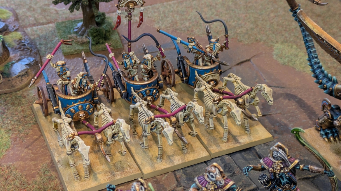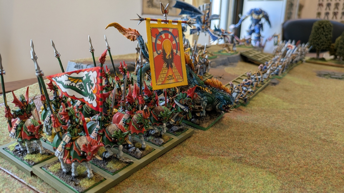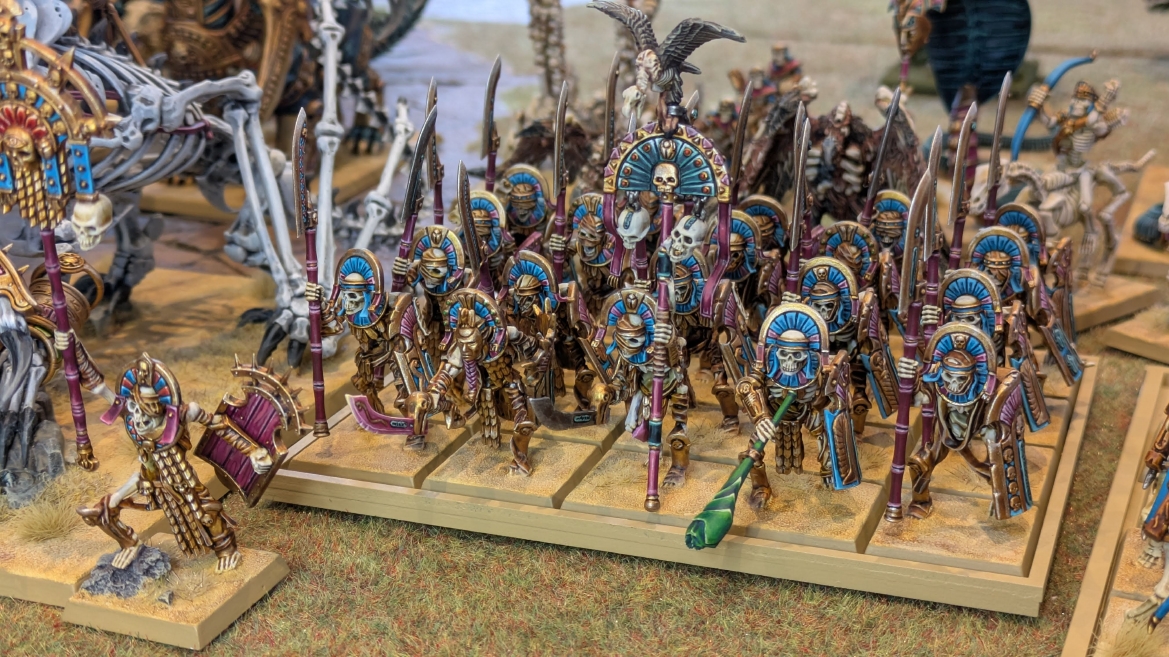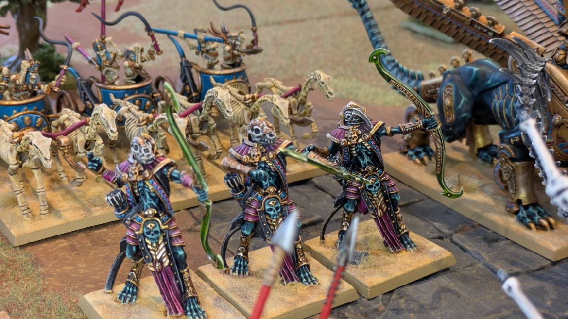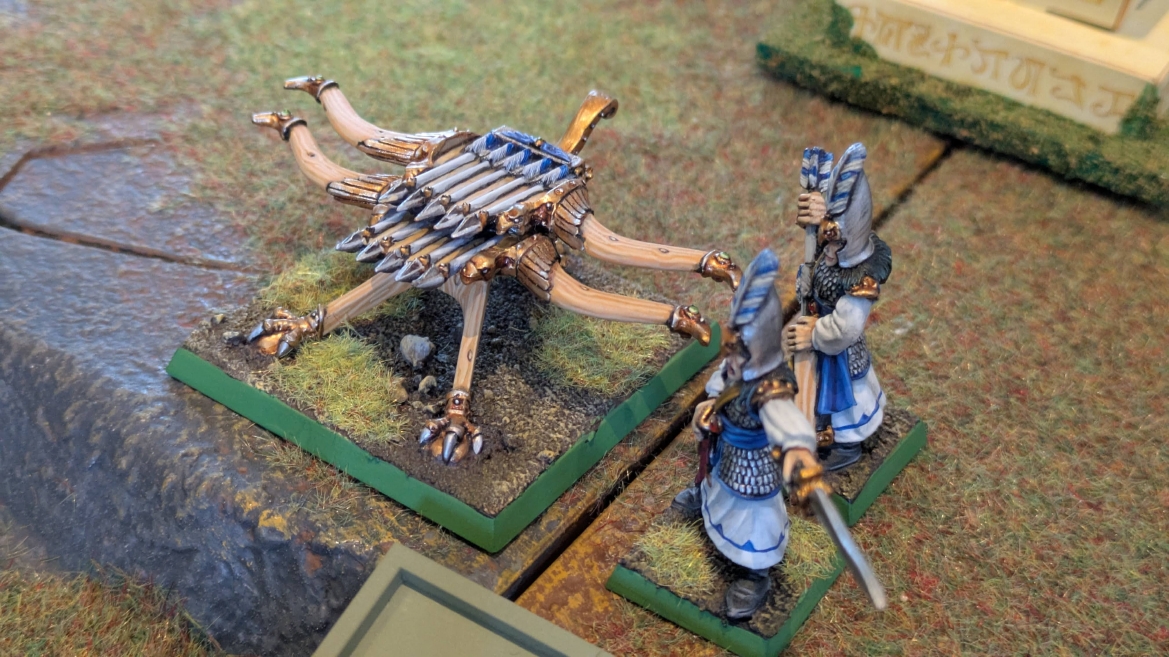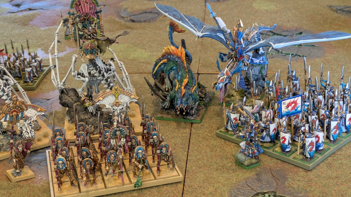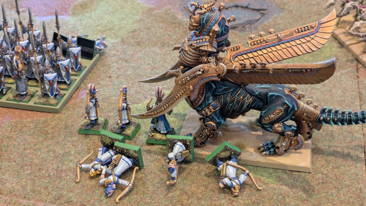 | ハイエロファントが取得した魔法はこの3つ。 バトル開始です。 ![]() ハイエルフが先行!矢の雨を降らせる!! ![]() 何と!S3の矢でトゥームスコーピオンを討ち取りました。ブレトニアのペザントボウマンの矢とは精度が違う!! うひょお! ![]() BS5もあるシャドウウォーリアーの弓はかなりの確率で当たります。5体でもけっこう活躍できるかも。 ![]() 軽騎兵2体討ち取りました。 ![]() ボルトスロアー3機がそれぞれ威力の強い単発ボルトを放つ! ![]() ヒットロールで3台中2台失敗という不甲斐なさ!1発は当たるもダメージ1点!あるぇ!?こんなはずでは。 (予定ではこのターンにスフィンクス轟沈だったんですが)(見積もりが甘い) ![]() トゥームキングの後半戦が始まります。 ![]() ![]() 躊躇なく迫りくるトゥームキングの軍勢! ![]() 射撃フェイズ。スクリーミングスカルカタパルトはミスファイア。 もはや定番の出来事になった感すらありますね(笑)。クルー1体死亡です。 ![]() スケルトンチャリオットが放つ矢が侮れない。 ![]() シーガード4体も死亡!? ![]() しかも追加移動までしてくるので、かなりの機動力を見せつけられます。 昔のトゥームキングの格言に「チャリオットを制するものはトゥームキングを制する」とありましたが(ほんとに公式の出版物に書いてあった)、 こういうことだよなぁって何か実感がありますね。 ![]() グレイトボウから放たれる巨大な矢が狙うはボルトスロアー。 ![]() いとも簡単にボルトスロアー1機轟沈。うわ〜これはつらい。 ![]() 丘の上から降り注ぐアーサプの矢。 ![]() アーマーの無いアーチャーは2体死亡にとどまりました。これはむしろラッキーでしたかね。 これにてお昼になりましたの昼食です。 ![]() 近所のお蕎麦屋さん兎屋にてお蕎麦を頂きました。いつ来ても美味しいですね。御馳走様でした。 ![]() アークメイジがファイアリーコンボケーションを放つ! ![]() 昔のかっこいいテンプレートを使ってみました。まぁダメージには繋がりませんでしたが…(笑) ![]() シーガードが射撃します。ここがダイスいっぱい振れて楽しいですね。 ![]() チャリオット一機撃沈! ![]() イーグルクロウ頑張れ! ![]() 全然当たりません。おかしい。 こんなはずでは(予定ではネクロスフィンクスとネクロポリスナイトは消滅しているはずだったが…)んなわけないか‥ ![]() 2ターン目後半戦、一気に盤面が動いてまいります。 ![]() と、その前にこの光景が素晴らしいですね。我がウォーハンマールームでオールドワールドは実に雰囲気が良いです。 最高のゲーム空間と言っても過言ではないと自画自賛したくなりますね、これは。 ![]() などと余裕こいてる場合ではなく、突撃きまりました。 やばいです。 ![]() さらにチャリオットまで追い打ちかけてきました。これは流石に厳しい!! ![]() スクリーミングスカルカタパルト、今度は頑張ってくださいね〜と余裕こいていたら… ![]() ドラゴンプリンス直撃!おっとぉおお!これは… ![]() 精鋭3体が血祭りに。うわぁ大戦果じゃないですか。 ![]() アーチャーのボウがけっこうプレッシャーではあります。 ![]() まぁ、ボウなんてこんなもんです、本来は。 ![]() しかしウシャブティのグレイトボウが放つ矢の威力はあなどれません! ![]() またイーグルクロウ轟沈。やばい。 ![]() 圧倒的殺戮が始まります。 ![]() テクリス風アークメイジ瞬殺! ![]() アララララ・・・・ まぁ、そうなりますよね的な。 ![]() ブレイクテストで奇跡の奮闘を見せるわけもなく、ブレイクです。 ![]() そしてネクロポリスナイトに追いつかれ全滅しました。うわぁ〜ん。 ![]() いや〜なんか厳しい展開ですね。はやくも。 ![]() 一気に戦局が傾いてしまった気もしますが、まだまだチャンスはある! ![]() しかし、こちらの戦線は敵との距離が遠く、攻めあぐねてしまいます。 ![]() 位置的に突撃されるぐらいなら、自分からするしかないとばかりにライオンチャリオット、ネクロスフィンクに突撃してみましたが果たして。 ![]() 普通に返り討ちに。まぁそうですよね… ![]() チャリオットの追撃に巻き込まれていたイーグルクロウもあっさり破壊され、我が軍の虎の子であったウォーマシン、何の成果もあげられないまま全滅です! ぎゃふん。 ![]() 3ターン後半戦、一気に攻めてくる骨の軍勢。 ![]() ![]() 何と高い移動力を駆使してトゥームキングはドラゴンプリンスの側面に降臨。 うわぁ、やばい雰囲気しかしない。 ![]() ボーンドラゴン、ブレスも吐いてきます。 ![]() がっつりブレス喰らってますがこれは厚いアーマーのおかげで1人死亡で済みました。 ![]() ネクロスフィンクス無双が始まってます。いやぁ、ブレトニアでいつも最初に倒せてるからちょっと感覚麻痺してました。 普通にグロい強さですこいつ。 ![]() 4ターン目前半! なんか中途半端に前に出過ぎて突撃できる相手がスケルトンしかいなくなっちゃったプリンス、突撃です。 ほんとはボーンドラゴン討伐にいきたかった〜〜〜〜 ![]() 盤面中央では大激突が始まりました