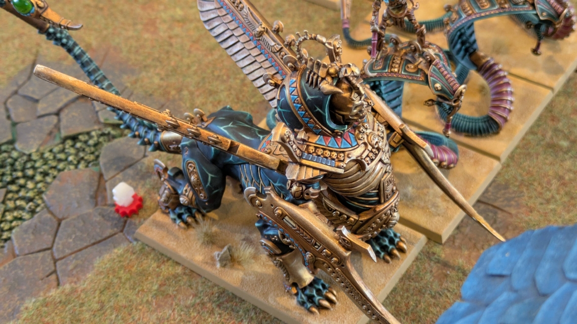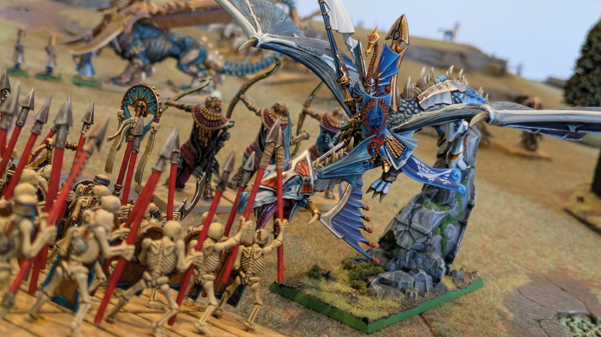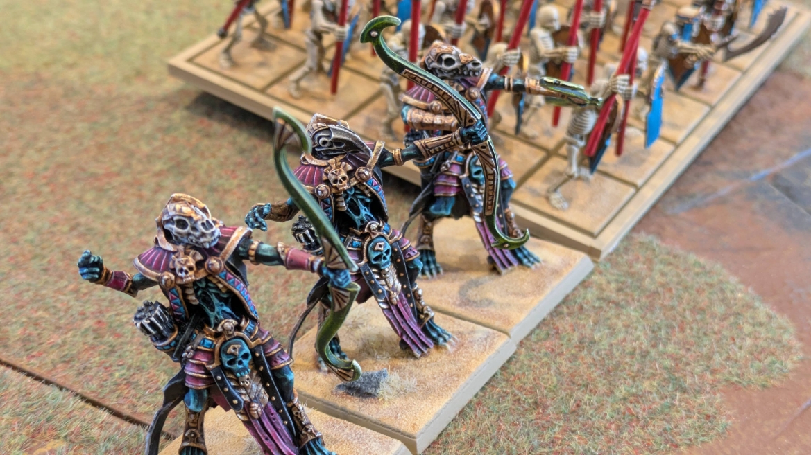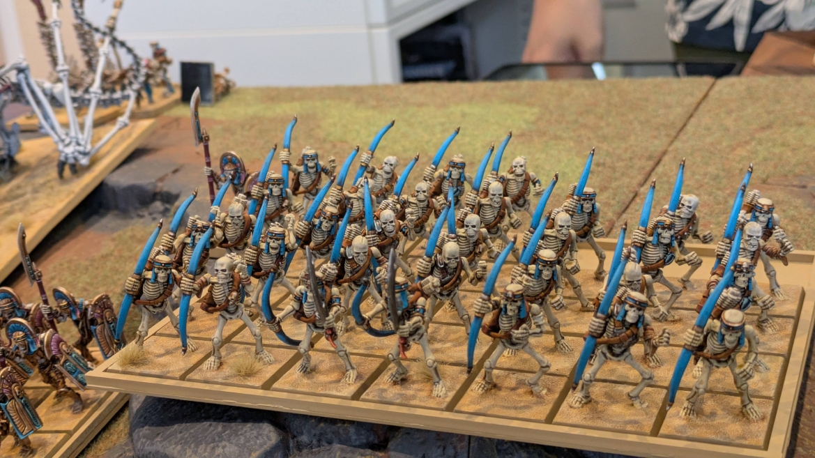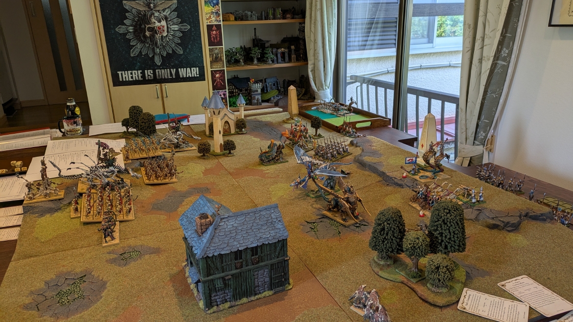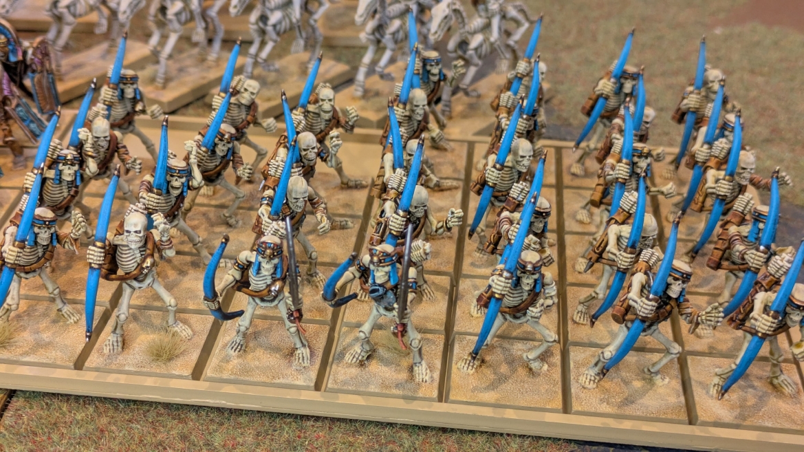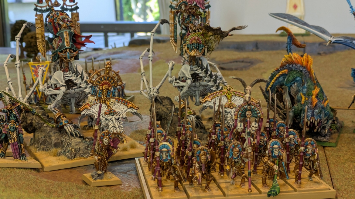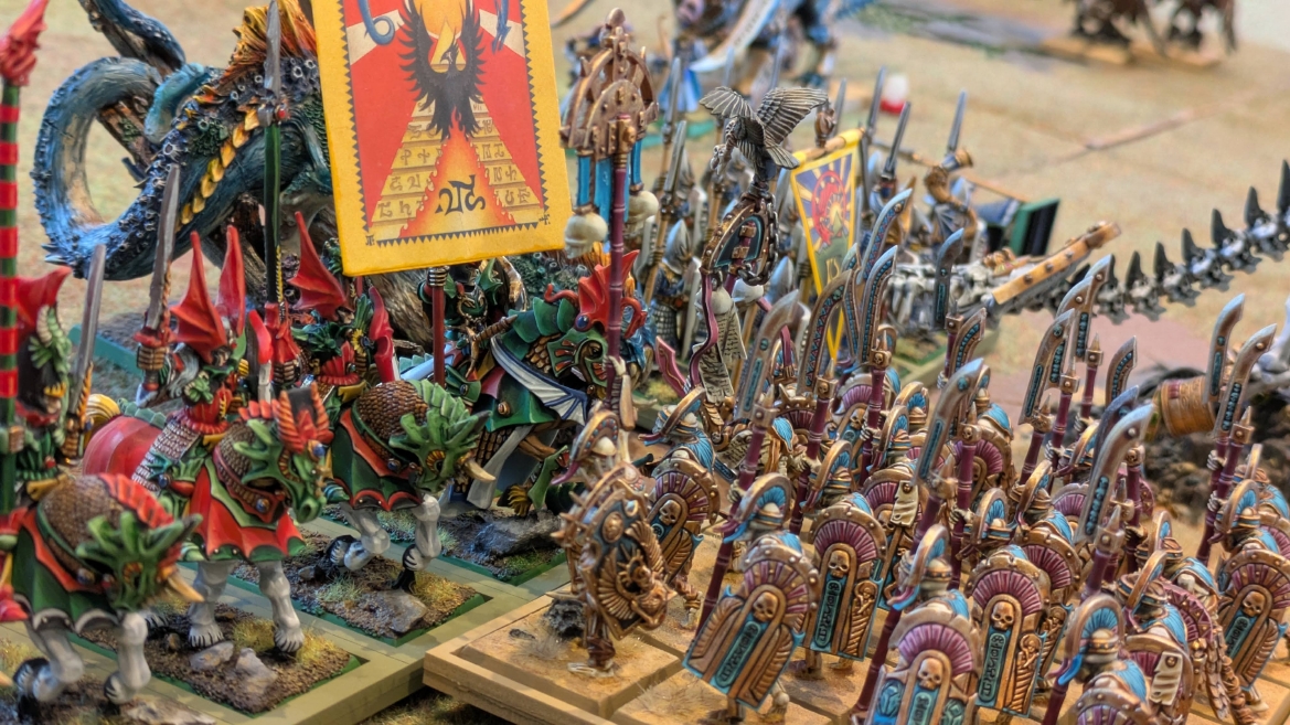 | ハイエロファントが取得した魔法はこの3つ。 バトル開始です。 ![]() ハイエルフが先行!矢の雨を降らせる!! ![]() 何と!S3の矢でトゥームスコーピオンを討ち取りました。ブレトニアのペザントボウマンの矢とは精度が違う!! うひょお! ![]() BS5もあるシャドウウォーリアーの弓はかなりの確率で当たります。5体でもけっこう活躍できるかも。 ![]() 軽騎兵2体討ち取りました。 ![]() ボルトスロアー3機がそれぞれ威力の強い単発ボルトを放つ! ![]() ヒットロールで3台中2台失敗という不甲斐なさ!1発は当たるもダメージ1点!あるぇ!?こんなはずでは。 (予定ではこのターンにスフィンクス轟沈だったんですが)(見積もりが甘い) ![]() トゥームキングの後半戦が始まります。 ![]() ![]() 躊躇なく迫りくるトゥームキングの軍勢! ![]() 射撃フェイズ。スクリーミングスカルカタパルトはミスファイア。 もはや定番の出来事になった感すらありますね(笑)。クルー1体死亡です。 ![]() スケルトンチャリオットが放つ矢が侮れない。 ![]() シーガード4体も死亡!? ![]() しかも追加移動までしてくるので、かなりの機動力を見せつけられます。 昔のトゥームキングの格言に「チャリオットを制するものはトゥームキングを制する」とありましたが(ほんとに公式の出版物に書いてあった)、 こういうことだよなぁって何か実感がありますね。 ![]() グレイトボウから放たれる巨大な矢が狙うはボルトスロアー。 ![]() いとも簡単にボルトスロアー1機轟沈。うわ〜これはつらい。 ![]() 丘の上から降り注ぐアーサプの矢。 ![]() アーマーの無いアーチャーは2体死亡にとどまりました。これはむしろラッキーでしたかね。 これにてお昼になりましたの昼食です。 ![]() 近所のお蕎麦屋さん兎屋にてお蕎麦を頂きました。いつ来ても美味しいですね。御馳走様でした。 ![]() アークメイジがファイアリーコンボケーションを放つ! ![]() 昔のかっこいいテンプレートを使ってみました。まぁダメージには繋がりませんでしたが…(笑) ![]() シーガードが射撃します。ここがダイスいっぱい振れて楽しいですね。 ![]() チャリオット一機撃沈! ![]() イーグルクロウ頑張れ! ![]() 全然当たりません。おかしい。 こんなはずでは(予定ではネクロスフィンクスとネクロポリスナイトは消滅しているはずだったが…)んなわけないか‥ ![]() 2ターン目後半戦、一気に盤面が動いてまいります。 ![]() と、その前にこの光景が素晴らしいですね。我がウォーハンマールームでオールドワールドは実に雰囲気が良いです。 最高のゲーム空間と言っても過言ではないと自画自賛したくなりますね、これは。 ![]() などと余裕こいてる場合ではなく、突撃きまりました。 やばいです。 ![]() さらにチャリオットまで追い打ちかけてきました。これは流石に厳しい!! ![]() スクリーミングスカルカタパルト、今度は頑張ってくださいね〜と余裕こいていたら… ![]() ドラゴンプリンス直撃!おっとぉおお!これは… ![]() 精鋭3体が血祭りに。うわぁ大戦果じゃないですか。 ![]() アーチャーのボウがけっこうプレッシャーではあります。 ![]() まぁ、ボウなんてこんなもんです、本来は。 ![]() しかしウシャブティのグレイトボウが放つ矢の威力はあなどれません! ![]() またイーグルクロウ轟沈。やばい。 ![]() 圧倒的殺戮が始まります。 ![]() テクリス風アークメイジ瞬殺! ![]() アララララ・・・・ まぁ、そうなりますよね的な。 ![]() ブレイクテストで奇跡の奮闘を見せるわけもなく、ブレイクです。 ![]() そしてネクロポリスナイトに追いつかれ全滅しました。うわぁ〜ん。 ![]() いや〜なんか厳しい展開ですね。はやくも。 ![]() 一気に戦局が傾いてしまった気もしますが、まだまだチャンスはある! ![]() しかし、こちらの戦線は敵との距離が遠く、攻めあぐねてしまいます。 ![]() 位置的に突撃されるぐらいなら、自分からするしかないとばかりにライオンチャリオット、ネクロスフィンクに突撃してみましたが果たして。 ![]() 普通に返り討ちに。まぁそうですよね… ![]() チャリオットの追撃に巻き込まれていたイーグルクロウもあっさり破壊され、我が軍の虎の子であったウォーマシン、何の成果もあげられないまま全滅です! ぎゃふん。 ![]() 3ターン後半戦、一気に攻めてくる骨の軍勢。 ![]() ![]() 何と高い移動力を駆使してトゥームキングはドラゴンプリンスの側面に降臨。 うわぁ、やばい雰囲気しかしない。 ![]() ボーンドラゴン、ブレスも吐いてきます。 ![]() がっつりブレス喰らってますがこれは厚いアーマーのおかげで1人死亡で済みました。 ![]() ネクロスフィンクス無双が始まってます。いやぁ、ブレトニアでいつも最初に倒せてるからちょっと感覚麻痺してました。 普通にグロい強さですこいつ。 ![]() 4ターン目前半! なんか中途半端に前に出過ぎて突撃できる相手がスケルトンしかいなくなっちゃったプリンス、突撃です。 ほんとはボーンドラゴン討伐にいきたかった〜〜〜〜 ![]() 盤面中央では大激突が始まりました