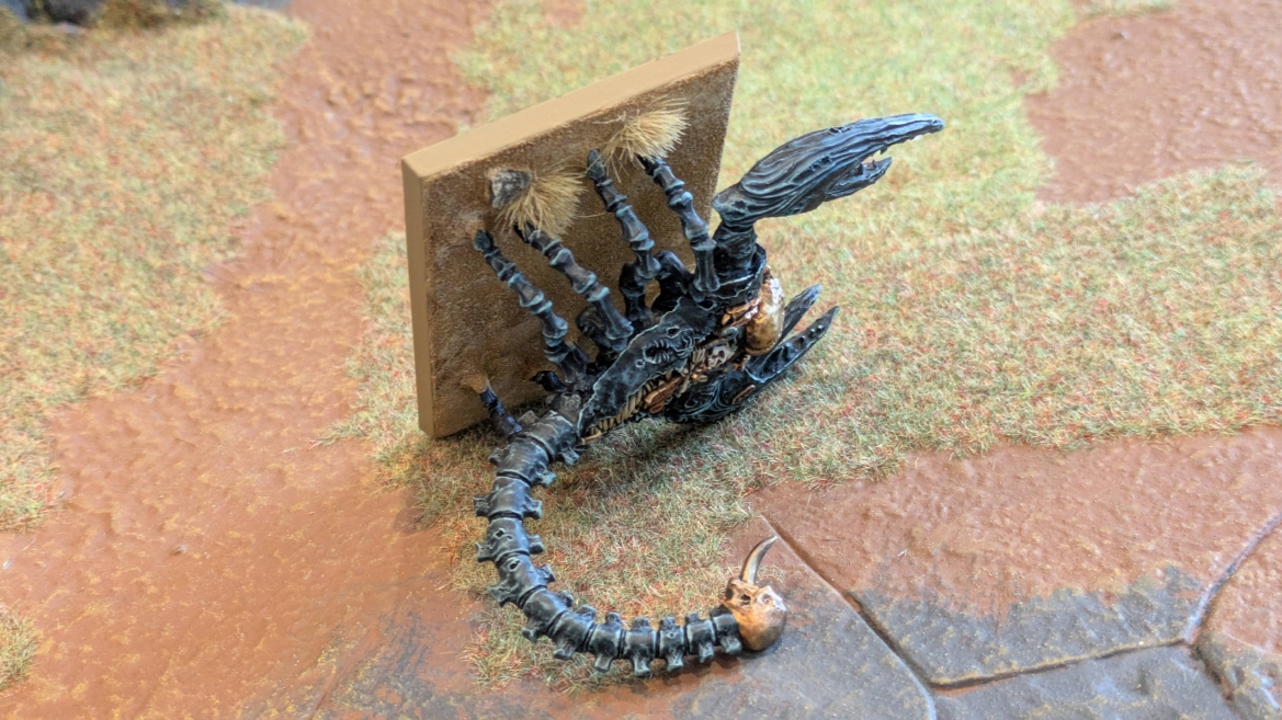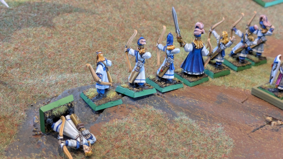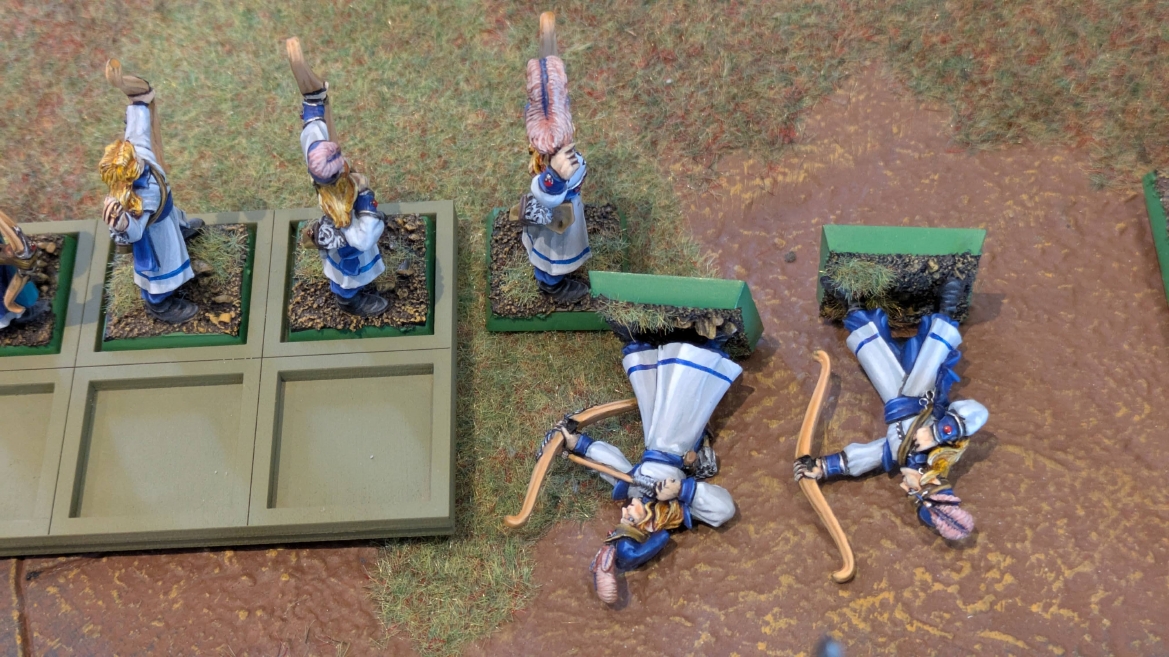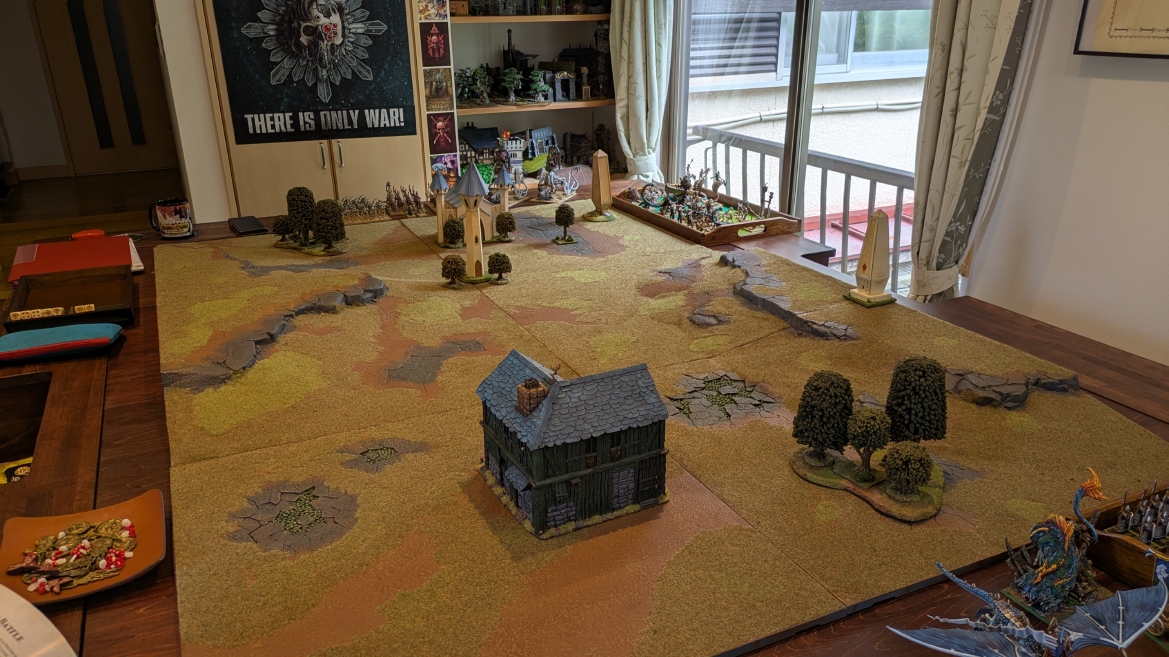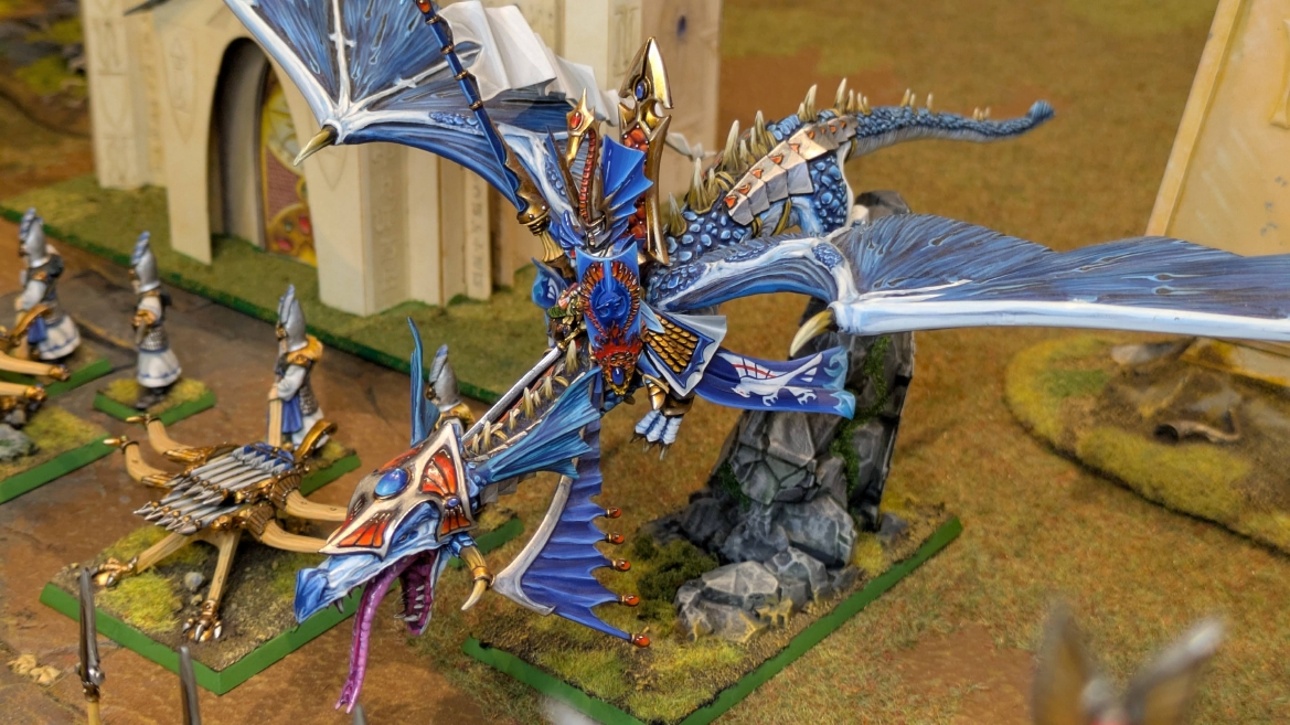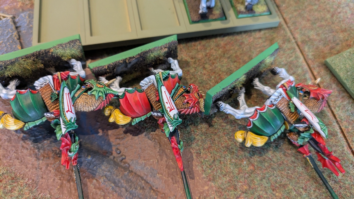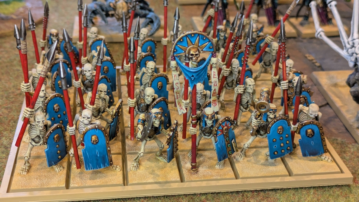 | ハイエロファントが取得した魔法はこの3つ。 バトル開始です。 ![]() ハイエルフが先行!矢の雨を降らせる!! ![]() 何と!S3の矢でトゥームスコーピオンを討ち取りました。ブレトニアのペザントボウマンの矢とは精度が違う!! うひょお! ![]() BS5もあるシャドウウォーリアーの弓はかなりの確率で当たります。5体でもけっこう活躍できるかも。 ![]() 軽騎兵2体討ち取りました。 ![]() ボルトスロアー3機がそれぞれ威力の強い単発ボルトを放つ! ![]() ヒットロールで3台中2台失敗という不甲斐なさ!1発は当たるもダメージ1点!あるぇ!?こんなはずでは。 (予定ではこのターンにスフィンクス轟沈だったんですが)(見積もりが甘い) ![]() トゥームキングの後半戦が始まります。 ![]() ![]() 躊躇なく迫りくるトゥームキングの軍勢! ![]() 射撃フェイズ。スクリーミングスカルカタパルトはミスファイア。 もはや定番の出来事になった感すらありますね(笑)。クルー1体死亡です。 ![]() スケルトンチャリオットが放つ矢が侮れない。 ![]() シーガード4体も死亡!? ![]() しかも追加移動までしてくるので、かなりの機動力を見せつけられます。 昔のトゥームキングの格言に「チャリオットを制するものはトゥームキングを制する」とありましたが(ほんとに公式の出版物に書いてあった)、 こういうことだよなぁって何か実感がありますね。 ![]() グレイトボウから放たれる巨大な矢が狙うはボルトスロアー。 ![]() いとも簡単にボルトスロアー1機轟沈。うわ〜これはつらい。 ![]() 丘の上から降り注ぐアーサプの矢。 ![]() アーマーの無いアーチャーは2体死亡にとどまりました。これはむしろラッキーでしたかね。 これにてお昼になりましたの昼食です。 ![]() 近所のお蕎麦屋さん兎屋にてお蕎麦を頂きました。いつ来ても美味しいですね。御馳走様でした。 ![]() アークメイジがファイアリーコンボケーションを放つ! ![]() 昔のかっこいいテンプレートを使ってみました。まぁダメージには繋がりませんでしたが…(笑) ![]() シーガードが射撃します。ここがダイスいっぱい振れて楽しいですね。 ![]() チャリオット一機撃沈! ![]() イーグルクロウ頑張れ! ![]() 全然当たりません。おかしい。 こんなはずでは(予定ではネクロスフィンクスとネクロポリスナイトは消滅しているはずだったが…)んなわけないか‥ ![]() 2ターン目後半戦、一気に盤面が動いてまいります。 ![]() と、その前にこの光景が素晴らしいですね。我がウォーハンマールームでオールドワールドは実に雰囲気が良いです。 最高のゲーム空間と言っても過言ではないと自画自賛したくなりますね、これは。 ![]() などと余裕こいてる場合ではなく、突撃きまりました。 やばいです。 ![]() さらにチャリオットまで追い打ちかけてきました。これは流石に厳しい!! ![]() スクリーミングスカルカタパルト、今度は頑張ってくださいね〜と余裕こいていたら… ![]() ドラゴンプリンス直撃!おっとぉおお!これは… ![]() 精鋭3体が血祭りに。うわぁ大戦果じゃないですか。 ![]() アーチャーのボウがけっこうプレッシャーではあります。 ![]() まぁ、ボウなんてこんなもんです、本来は。 ![]() しかしウシャブティのグレイトボウが放つ矢の威力はあなどれません! ![]() またイーグルクロウ轟沈。やばい。 ![]() 圧倒的殺戮が始まります。 ![]() テクリス風アークメイジ瞬殺! ![]() アララララ・・・・ まぁ、そうなりますよね的な。 ![]() ブレイクテストで奇跡の奮闘を見せるわけもなく、ブレイクです。 ![]() そしてネクロポリスナイトに追いつかれ全滅しました。うわぁ〜ん。 ![]() いや〜なんか厳しい展開ですね。はやくも。 ![]() 一気に戦局が傾いてしまった気もしますが、まだまだチャンスはある! ![]() しかし、こちらの戦線は敵との距離が遠く、攻めあぐねてしまいます。 ![]() 位置的に突撃されるぐらいなら、自分からするしかないとばかりにライオンチャリオット、ネクロスフィンクに突撃してみましたが果たして。 ![]() 普通に返り討ちに。まぁそうですよね… ![]() チャリオットの追撃に巻き込まれていたイーグルクロウもあっさり破壊され、我が軍の虎の子であったウォーマシン、何の成果もあげられないまま全滅です! ぎゃふん。 ![]() 3ターン後半戦、一気に攻めてくる骨の軍勢。 ![]() ![]() 何と高い移動力を駆使してトゥームキングはドラゴンプリンスの側面に降臨。 うわぁ、やばい雰囲気しかしない。 ![]() ボーンドラゴン、ブレスも吐いてきます。 ![]() がっつりブレス喰らってますがこれは厚いアーマーのおかげで1人死亡で済みました。 ![]() ネクロスフィンクス無双が始まってます。いやぁ、ブレトニアでいつも最初に倒せてるからちょっと感覚麻痺してました。 普通にグロい強さですこいつ。 ![]() 4ターン目前半! なんか中途半端に前に出過ぎて突撃できる相手がスケルトンしかいなくなっちゃったプリンス、突撃です。 ほんとはボーンドラゴン討伐にいきたかった〜〜〜〜 ![]() 盤面中央では大激突が始まりました