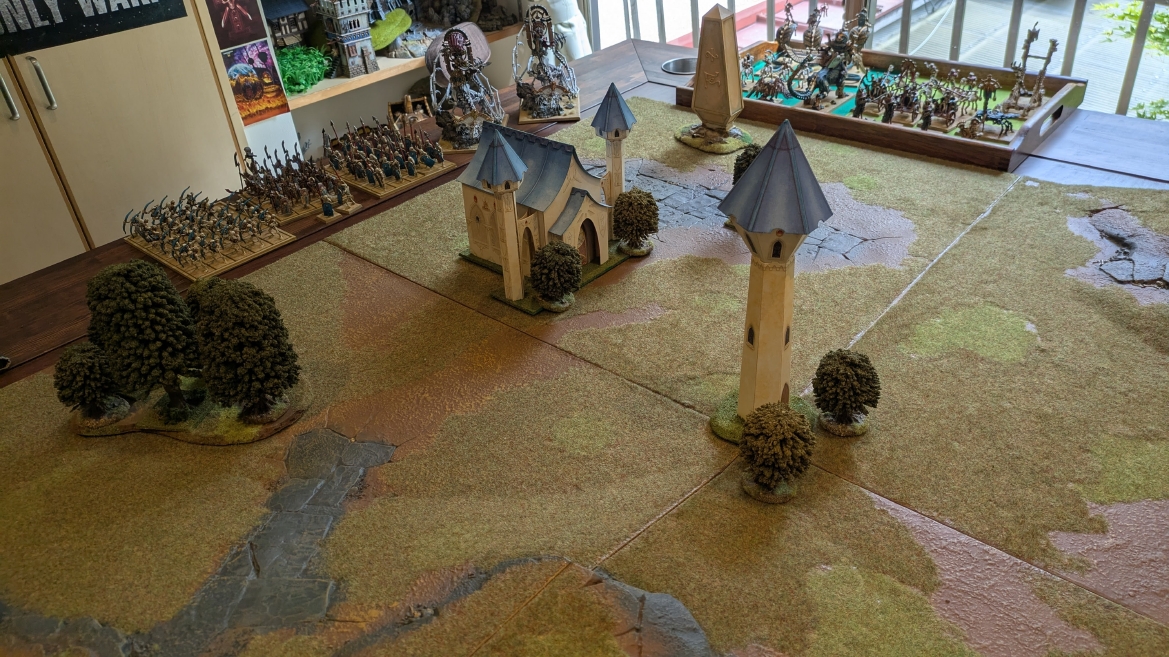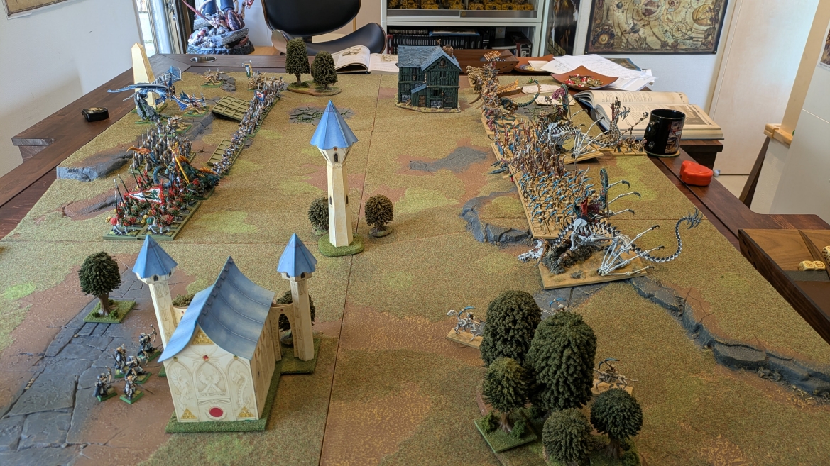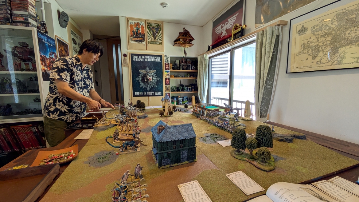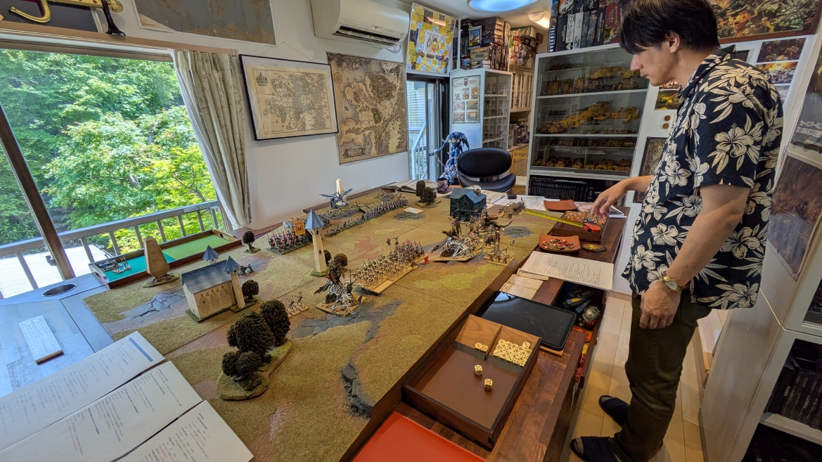 戦場 ![]() 今回はハイエルフ様式の建造物を使ってみました。 ![]() これらの建物はファンタジーバトル5版のころのキャンペーンパックに封入されていたペーパークラフト製のテレインです。 今見てもいい雰囲気というか、ちゃんと組んでやれば紙製でも半永久的に使えるんですよね。 凝ったプラ製テレインキットもありがたいけど、こういう簡単に作れて見栄えもあるペーパークラフト製テレイン、今でも需要あると思うんですけどねぇ〜 ![]() ええ雰囲気なんですよね、この戦場。 ゲームはオールドワールド1.5版とも言えるアップデートに慣れるため、ということでシンプルなピッチバトルとしました。 ![]() 初期配置完了です。 ![]() ![]() 矢の雨を降らせるぞ、とばかりにシーガードをずらり配置。丘の上にもボルトスロアー。1ターン目が楽しみだ。 ![]() プリンスは高みの見物、というか、どこに置いたもんかと、自信なく置いてみました。 ![]() 一回動かしてみないと、どんな感じで戦うのか、いまだピンと来てない感じで配置が進みました。 ブレトニアに慣れ過ぎちゃって、ちょっと普通のアーミーがわからなくなってしまった感じです。 ![]() 丘の上に陣取るアーチャー。 ![]() フルサイズの戦場を横一列でギチギチになるほどの戦力。 2500Pと3000Pって物量自体はもうあんまり変わらないですよね。 ![]() 層が厚い。ハイエルフと比べて。 ![]() 建物の陰から奇襲してきそうな良い感じの配置。 ![]() ほんと、はたさんのトゥームキングの美しさを見ていると、かつて僕がトゥームキングを作っていた時に理想だった光景なんですよね。 僕はここまでには到達できなかったので、単純に対戦相手としてだけでなく、かつての憧れの具現化という二重の嬉しさがあります。 ![]() そして持ち寄ったアーミーの初期配置が終わったこの瞬間がやっぱり至高の時間であります。 このまま1日置いて、お酒でも飲みながら語りたい、みたいな気持ち。分かっていただけるでしょうか。 ![]() ハイエルフのアークメイジが取得した魔法はこの3つです。 ![]() |