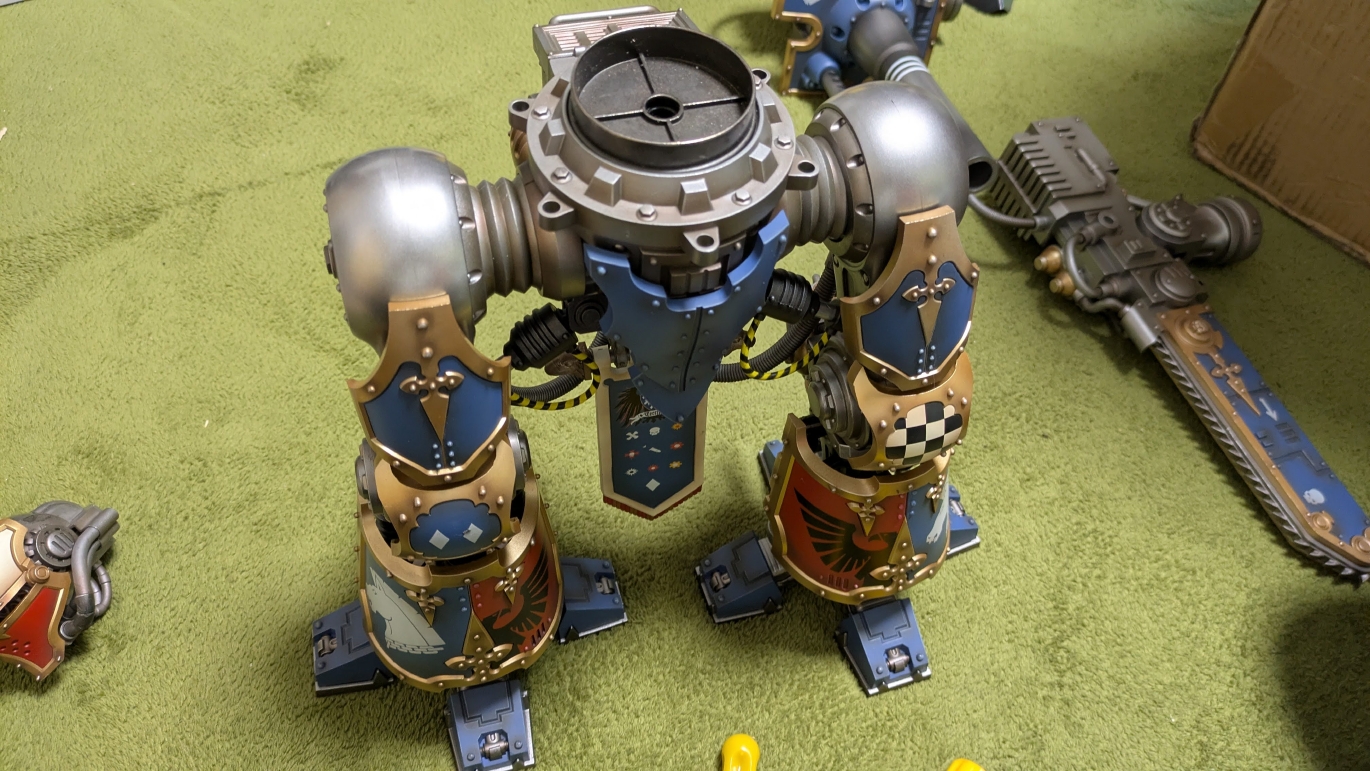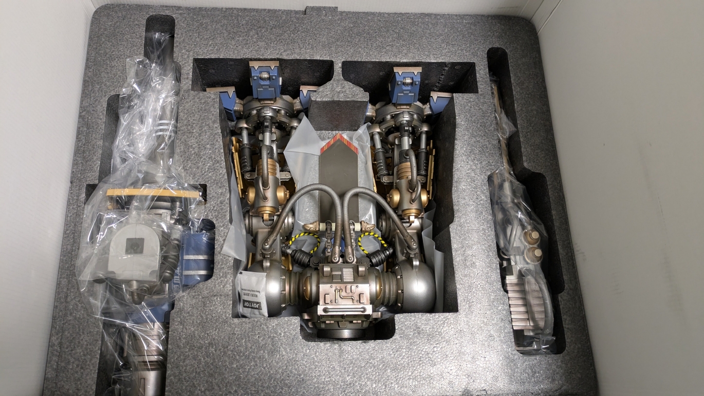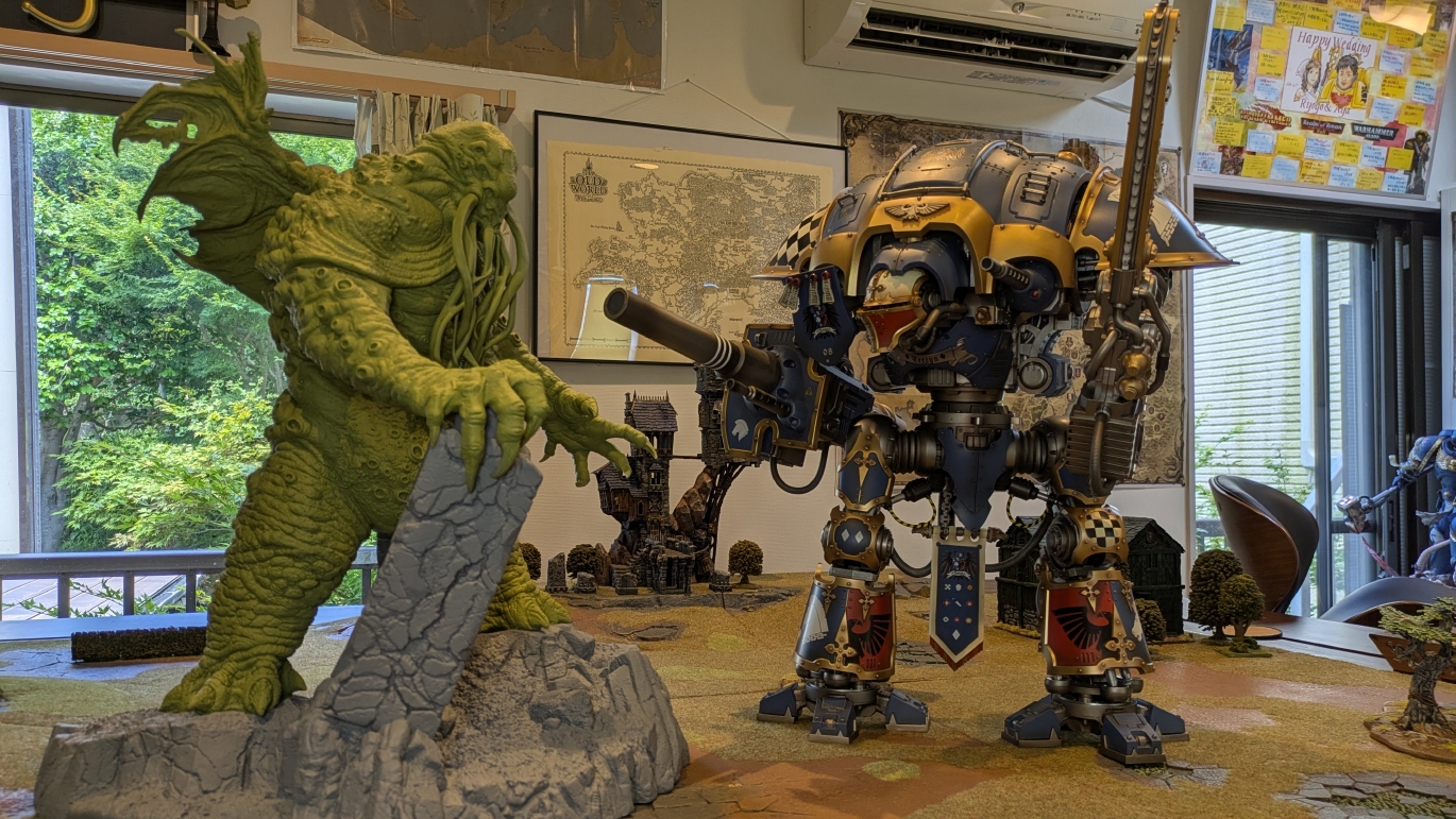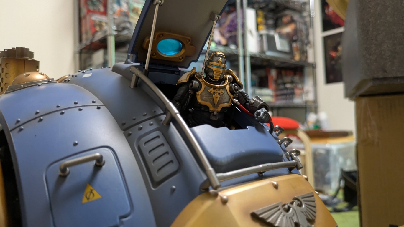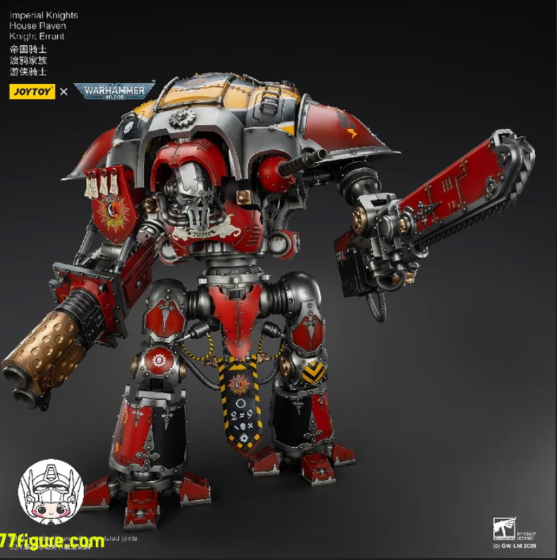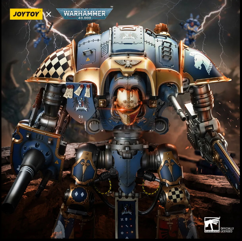 | やけに出来が良く、その上、短いスパンで新作アクションフィギュアを量産するメーカーJoyToy、 ウォーハンマー40Kのインペリアルナイトを1/18で出すというニュースに2022年は仰天したものでした。 ![]() いやいや、本気かと。 大きさ、40Kスケールのウォーロードタイタンクラスじゃなかろうか。 こんな巨大な完成品のフィギュアを売っちゃうってちょっと中々聞かないというか、(知らないだけかもだけど) ネタにしてもすごいド派手やなと。 勢いのあるJOYTOYなら本気で作るかも、とは思って期待感は高まっていたわけですが、 開発が難航して(支えが無いと直立できないとか、耐久性に難があったようで)発売が延期されたりとか、ホントに発売できるのだろうか、と懐疑的な感じは漂っていましたね。 ![]() しかし、2024年年末になって予約も開始され、ホントに発売されるんだなぁ・・・と改めて驚きつつ、 これほどにエピックなプロダクトはウォーハンマーファンとして触れておきたいと思い、勢い予約をしたのでした。 こんな酔狂な製品、今後ウォーハンマーがどれだけ発展しても中々見られないアイテムになるのではないか、という気もしましたし。 ちなみに例によって77figureさんにて予約しました。 ![]() そして去る2025年7月、届きました。でかい段ボールが。 ![]() でかい、これはおもちゃの箱としては異常なでかさ。写真じゃ伝わらないでしょうけど、まぁ家電製品とかのイメージですね。 でも、思ったよりは軽い。この大きさのスタチューを何個か買った経験でいえば数十キロの重さではない感じ。 ![]() 箱を開けると化粧箱もばっちりです。 スケール1/18の表記が改めてヤバ過ぎる。 ![]() この狂ったプロダクトは今後も続くウォーハンマーホビーの中でもひと際狂ったオフィシャル製品として多くのファンの記憶に残ることでしょう。 いっそこのかっちょいい化粧箱から出さずに保存しておきたい気もしましたが、まぁ、我慢できませんよね。 ![]() ちなみにJOYTOYマリーンでお得意のカラー変更で売りまくるやつ、ぜひともインペリアルナイトでもやって欲しいですねぇ。 テリン宗家も大好きですが、やはりホークシュラウド宗家のナイトもこうなってくると欲しいんですよねぇ(なお置く場所問題はあるけども) ![]() この巨大サイズの製品にもしっかりとした化粧箱用意してくれて、すごいなぁと感心してしまいます。 さあ開けるぞ! ![]() おお〜専用設計の発泡スチロールでがっつりガードされていますね。 ![]() ペイントは他のJOYTOYと同様、文句のないものです。 ほんと、ペイントクオリティ高くて、もう自分で塗るのもシンドイし、JOYTOYでいいかなってなっちゃう人が増えるんじゃないか心配になるレベルです。 まぁ、JOYTOYではウォーハンマーは遊べないので、そこだけは完全な代替えには成りえないんですけどね。 ![]() 次の段はこんな感じに収まってました。 このサイズ、この銀色のフレーム、なんか見覚えあるなぁって、そう、これまんまウォーロードタイタンのサイズなんですよねぇ。 ![]() 箱から出しただけで、このサイズとペイント完成品としての見栄え、良いものを買った満足感が一瞬で満たされるのやばい。 腰と胴のところは金属製になっています。 ![]() ボディからも太い金属軸が突き出ており、これを下半身に差し込むことでガッチリと連結されます。 ![]() 頭も腕も全部装着させました。 ウホッホ、これはすごい。全高53センチの巨大さ。ちょっと新生児くらいのサイズはあります。 足の関節や腕などの可動部には金属を使っているようで、武器や上半身の加重に負けないホールド性を誇っています。 ![]() クルーも付属してます。ちゃんと乗れます。これがすごい。 ![]() じゃじゃ〜〜〜ん!! いや〜これはすごい、よくやったなJOYTOY!マジでデカい。かっこいい! これが6万ちょっとで買えるの、何かが狂っている、とさえ思う出来栄え。 ちなみに手前のタイタス副官とカストードも1/18サイズのJOYTOY製品です。 ![]() インペリアルナイトのパイロットも完全立体化されています。顔もマスク有り無しを選べます。 よくも悪くもGW製のナイトをまんま巨大化させたデザインで、デカくなった分ディテールが増している、とかは無いのがJOYTOYらしいと言えばらしいところ。 ![]() ちょっとあおり気味で写真撮るだけでどちゃくそカッコイイ!!! 関節はけっこう硬めなため、しっかりポーズを維持できるのも凄いです。この辺りの調整に難航したんじゃないかと想像するところです。 ![]() ある意味、この1/18サイズのナイトの醍醐味といえば、この操縦席周りじゃないでしょうか。 ここにちゃんとパイロットを乗せられる、これにワクワクしない男の子はいないでしょう!って感じ。 ![]() うひょおおおお〜たまらないですねぇ。 パイロットを乗りこませたり下ろしたりしてると、楽しい。やっぱり、買って良かったなぁ〜としみじみ思いました。 さて、 40K版ウォーロードタイタンと並べてみました。 ![]() やっぱりほ