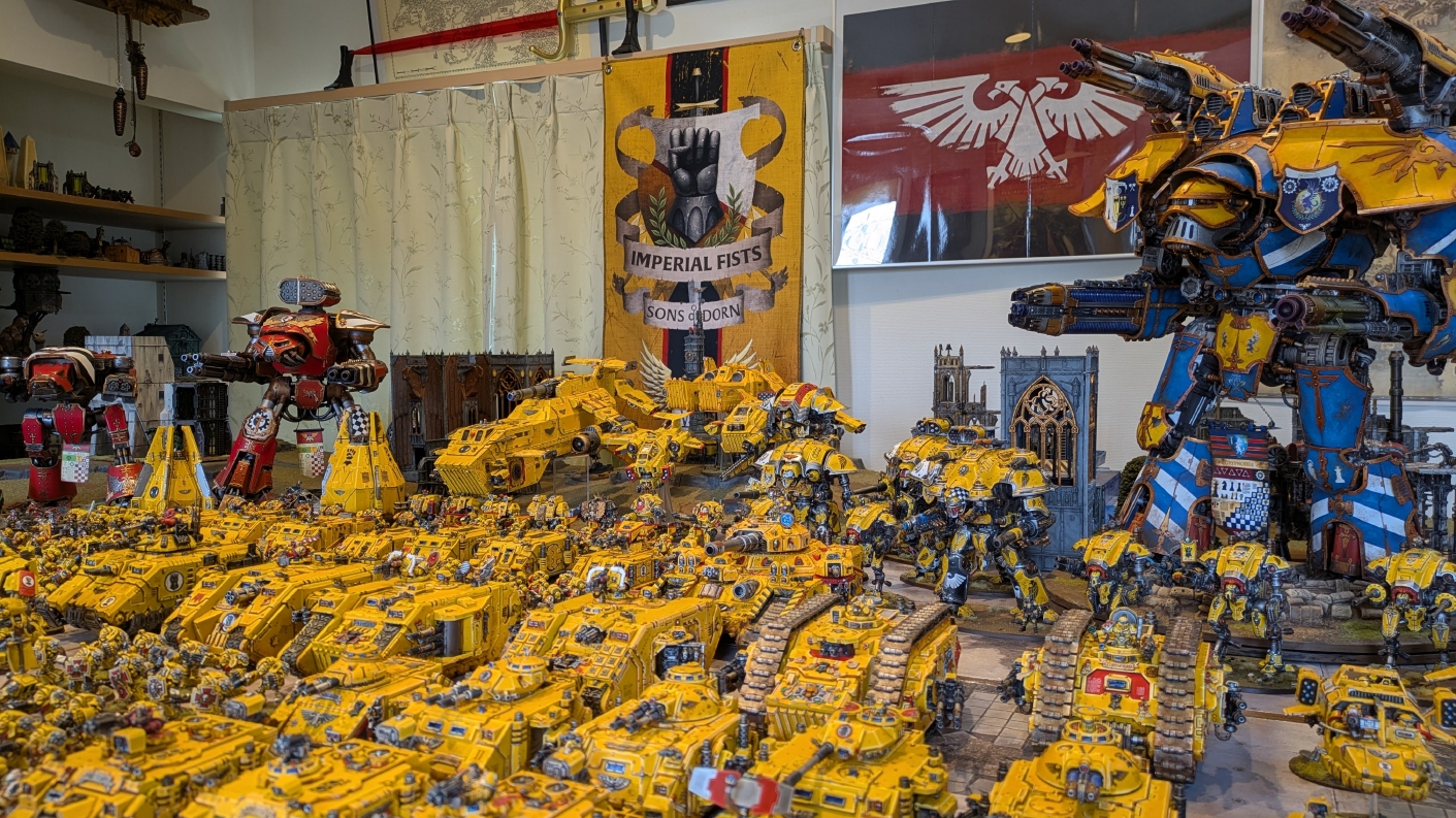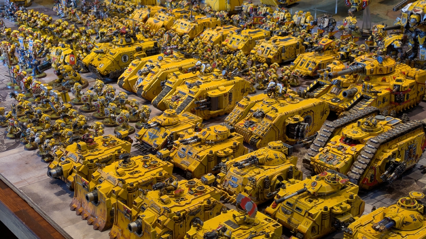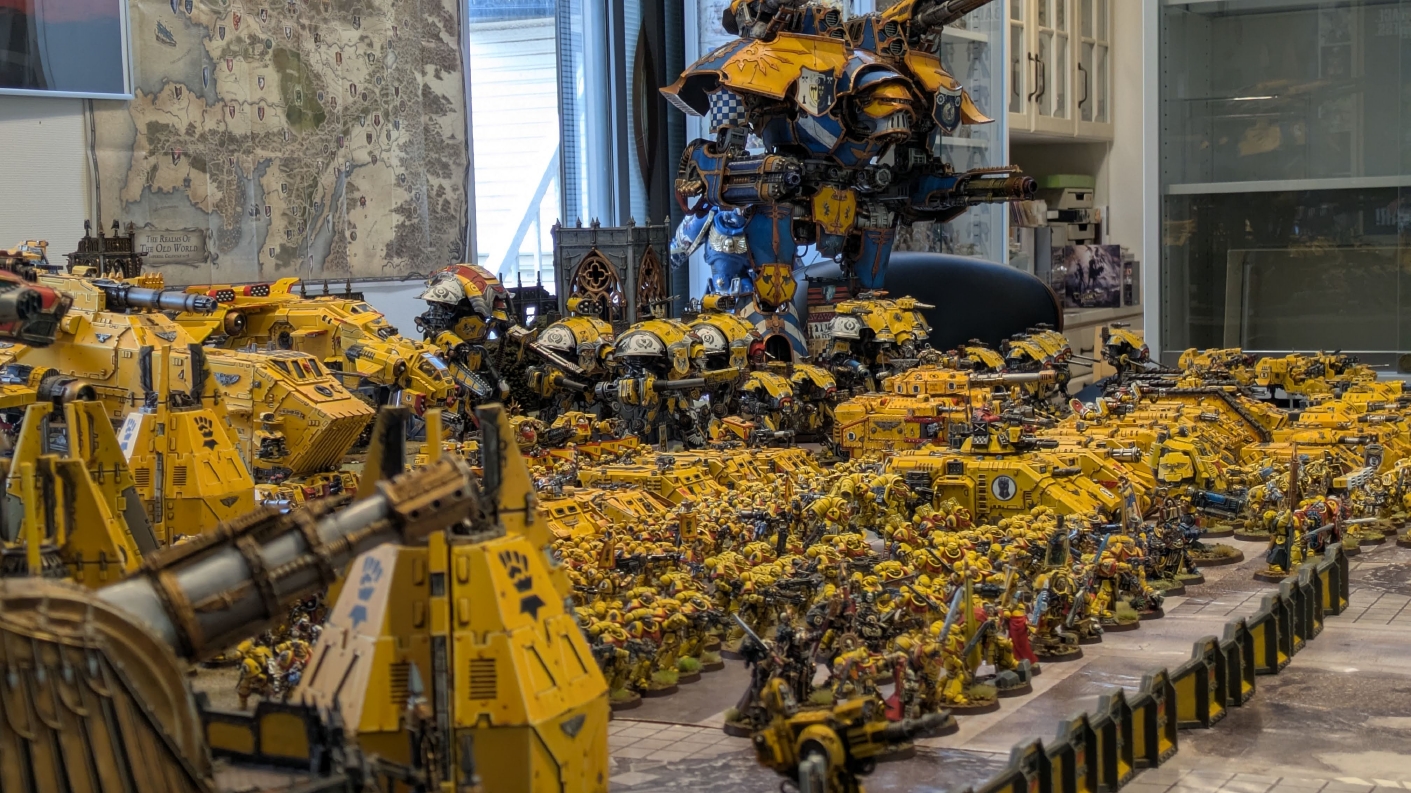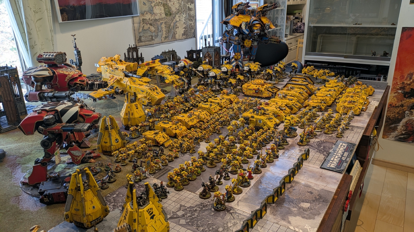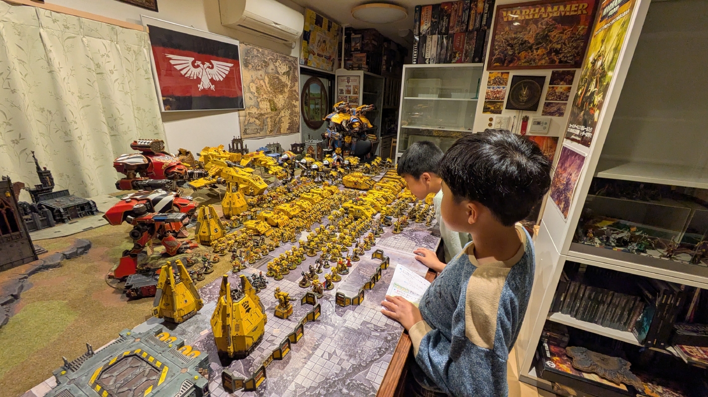 寄せられたコメントもほとんどが好意的なもので、関連するポストも合わせたら500件近く頂けて、更になんとこのポスト以降2日ほどでフォロワーが2000人近く増えてしまったのでした。 流石に色々すごい。 2011年からツイッターやってて、フォロワーがこんなに急激に増えたのは初めてだったので、これはもう自動翻訳機能搭載のおかげ間違いなしだし、 何かしらのポストの表示優先順位のアルゴリズムに変更があって、日本人のポストが多数海外に届くようになったのかもしれません。 同じようにプチバズ状態になっている日本趣味人も多数いらっしゃった印象です。 ![]() いや〜正直言って、ツイッター社がイーロン・マスクに買収され、Xになってから、いらん改変ばっかりするし、広告鬱陶しすぎて広告減らすために課金するハメになったし、 そもそもツイッターって言いたかったし、ツイートって言いたかったし、Xとかポストとか言わないように心がける程度には、イーロン・マスクってさぁ…とか思ってたんですが、 こうなってしまったら話は別です。 いや〜X凄いわ、ポストが世界に届く! 世界中の趣味人とこんなに繋がることが出来て、もうXは最高のSNSじゃん!ってなるくらいにはイーロン・マスクのファンになってしまいました。 いやほんと、GW本社もXでの広報やめちゃってますけど、戻ってきて欲しいですねぇ。 ![]() それにしても海外趣味人、ウォーハンマーへの熱量がすごい。 あらためて日本語に翻訳される趣味人同士の議論とか言い合いを見てると、いろんなタイプが居るのは日本と同様でも、その振り幅がでかい。 熱々になっている人もいれば、たぶんあまり関心がない人まで、いろんな背景を持った人ががんがんポストしてて、昔の掲示板(BBS)で見たことがある光景というか、そういう雰囲気を感じました。 日本とは比較にならないくらいに幅広い年代でこのホビーが受け入れられていることをヒシヒシと感じましたね。 あと、すごい気軽にリプライ入れてくれるのも楽しくなりますね。 ついついXの画面をスクロールするのに夢中になり過ぎてペイントの時間を奪われがちなので、そろそろ加減して付き合っていかないと、とは思います。 ![]() というわけで、僕のインペリアルフィストが凄まじい勢いで拡散されたのは大変名誉なことでしたので、 インペリアルフィストの写真とそのきっかけになったX自動翻訳機能搭載の思い出をこの記事に残しておきたいと思いました。 もともとは、はたさんのティラニッドとの激熱巨大バトルの後に、せっかくでかい戦場を置いてある内に現時点でのインペリアルフィストを並べてみるかな、という感じでした。 それとX自動翻訳機能搭載のタイミングがたまたま一致した感じでした。いや〜嬉しかったです。 まぁ、過去にも何度か並べてますし、ファーストボーンのマリーンが多く、10年前以上前に作ったモデルがほとんどの中で、 このネタ何回やるんや!?、って思ってる日本の趣味人の方もいらっしゃるとは思いますが(笑)、いやぁ、僕も今回は予想外の展開だったんですよ、ほんと。 でもって、味をしめたので、これからも1年に1回くらいは自宅アーミーズオンパレードをやりたいな、と思った次第です(笑)。 ![]() いや〜マジでかっこいい、黄色いタンクがズラリ並ぶと最高ですね。 11版でコデックスが更新されたら、もしかしてライノ系シャーシのタンクは全部グラブ系タンクにとって代わられるかも、とか、 ランドレイダーもそろそろモデルチェンジしそうだなぁとか、色々と懸念はあるものの、もうここまで作っちゃったら、ゲームは関係ないです。 コレクションとしてこれからも大切にしていきたいと思っています! かつてツイッターで趣味人の方が、 「形あるものいつかは崩れる、永年コレクションしてきたフィギュアも太陽光と熱、そして湿気による劣化は避けられない、加水分解とかね…」 というようなツイートをされていたのを見た時に、軽くショックを受けた覚えがあります。 そうだよなぁ、これは一生もののコレクションて思ってても、実際は一生ものじゃなくいつかは崩れ去るものなんだなぁ…って。 でもそのツイートを見てから軽く7〜8年は経ちますが今の所、塗装面の劣化も色の退色も見受けられないですし、 今もって自信満々のコレクションであり続けてくれるこのインペリアルフィストを、このたび改めて誇らしく思ったものでした。 まぁ、気にするだけ無駄というか、ここまで来たらとことん増強してやろう、とキチガイじみた決意を新たにしたところです。 ![]() ちなみにこのRoRにて人気の記事「ウォーロードタイタン制作記」も今回のプチバズの中で便乗して宣伝したところ、こちらも反響大きくて改めて嬉しくなりました。 ![]() まだ見てない人は見てくださいね!ウォーロードタイタンが作りたくなっても責任はとれませんよ!(笑) ![]() リーヴァータイタンの制作記もあります。こちらも未読の方はぜひご覧になってくだ