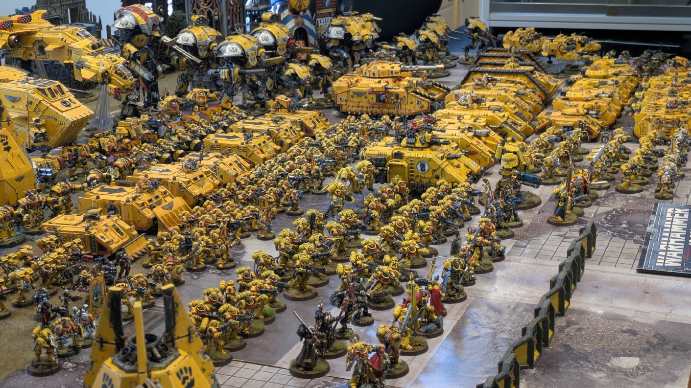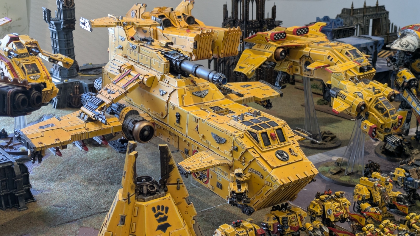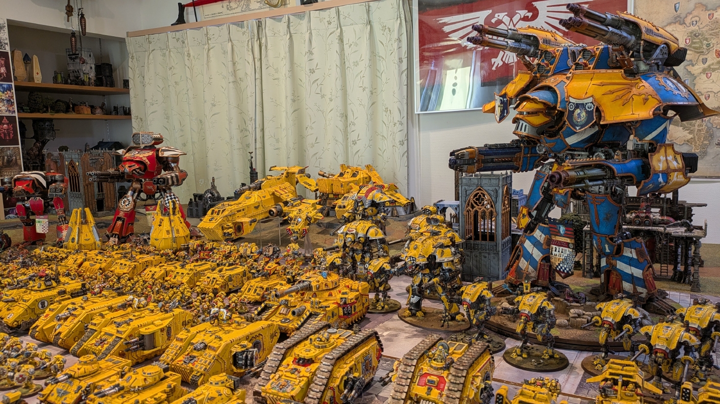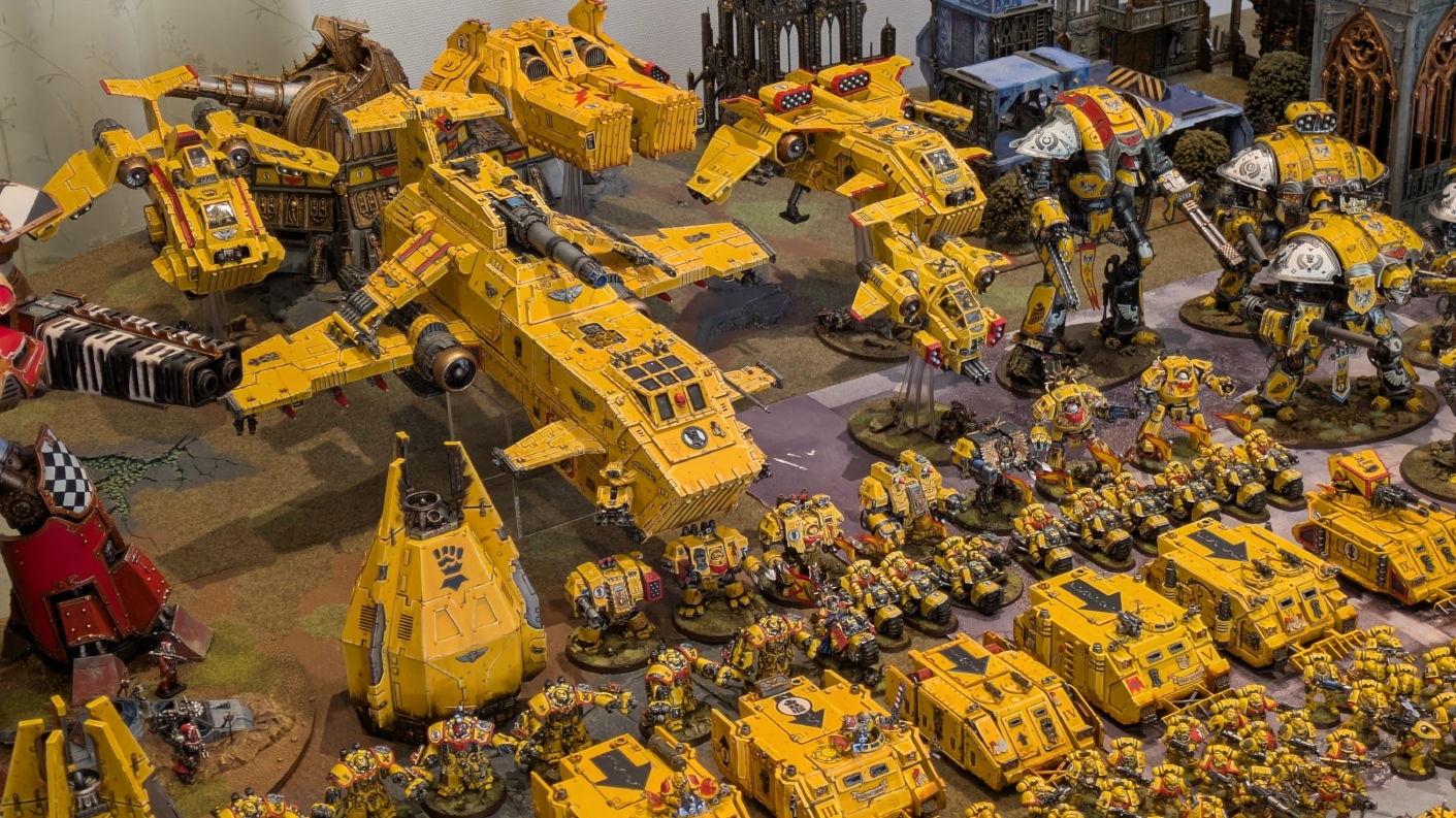 寄せられたコメントもほとんどが好意的なもので、関連するポストも合わせたら500件近く頂けて、更になんとこのポスト以降2日ほどでフォロワーが2000人近く増えてしまったのでした。 流石に色々すごい。 2011年からツイッターやってて、フォロワーがこんなに急激に増えたのは初めてだったので、これはもう自動翻訳機能搭載のおかげ間違いなしだし、 何かしらのポストの表示優先順位のアルゴリズムに変更があって、日本人のポストが多数海外に届くようになったのかもしれません。 同じようにプチバズ状態になっている日本趣味人も多数いらっしゃった印象です。 ![]() いや〜正直言って、ツイッター社がイーロン・マスクに買収され、Xになってから、いらん改変ばっかりするし、広告鬱陶しすぎて広告減らすために課金するハメになったし、 そもそもツイッターって言いたかったし、ツイートって言いたかったし、Xとかポストとか言わないように心がける程度には、イーロン・マスクってさぁ…とか思ってたんですが、 こうなってしまったら話は別です。 いや〜X凄いわ、ポストが世界に届く! 世界中の趣味人とこんなに繋がることが出来て、もうXは最高のSNSじゃん!ってなるくらいにはイーロン・マスクのファンになってしまいました。 いやほんと、GW本社もXでの広報やめちゃってますけど、戻ってきて欲しいですねぇ。 ![]() それにしても海外趣味人、ウォーハンマーへの熱量がすごい。 あらためて日本語に翻訳される趣味人同士の議論とか言い合いを見てると、いろんなタイプが居るのは日本と同様でも、その振り幅がでかい。 熱々になっている人もいれば、たぶんあまり関心がない人まで、いろんな背景を持った人ががんがんポストしてて、昔の掲示板(BBS)で見たことがある光景というか、そういう雰囲気を感じました。 日本とは比較にならないくらいに幅広い年代でこのホビーが受け入れられていることをヒシヒシと感じましたね。 あと、すごい気軽にリプライ入れてくれるのも楽しくなりますね。 ついついXの画面をスクロールするのに夢中になり過ぎてペイントの時間を奪われがちなので、そろそろ加減して付き合っていかないと、とは思います。 ![]() というわけで、僕のインペリアルフィストが凄まじい勢いで拡散されたのは大変名誉なことでしたので、 インペリアルフィストの写真とそのきっかけになったX自動翻訳機能搭載の思い出をこの記事に残しておきたいと思いました。 もともとは、はたさんのティラニッドとの激熱巨大バトルの後に、せっかくでかい戦場を置いてある内に現時点でのインペリアルフィストを並べてみるかな、という感じでした。 それとX自動翻訳機能搭載のタイミングがたまたま一致した感じでした。いや〜嬉しかったです。 まぁ、過去にも何度か並べてますし、ファーストボーンのマリーンが多く、10年前以上前に作ったモデルがほとんどの中で、 このネタ何回やるんや!?、って思ってる日本の趣味人の方もいらっしゃるとは思いますが(笑)、いやぁ、僕も今回は予想外の展開だったんですよ、ほんと。 でもって、味をしめたので、これからも1年に1回くらいは自宅アーミーズオンパレードをやりたいな、と思った次第です(笑)。 ![]() いや〜マジでかっこいい、黄色いタンクがズラリ並ぶと最高ですね。 11版でコデックスが更新されたら、もしかしてライノ系シャーシのタンクは全部グラブ系タンクにとって代わられるかも、とか、 ランドレイダーもそろそろモデルチェンジしそうだなぁとか、色々と懸念はあるものの、もうここまで作っちゃったら、ゲームは関係ないです。 コレクションとしてこれからも大切にしていきたいと思っています! かつてツイッターで趣味人の方が、 「形あるものいつかは崩れる、永年コレクションしてきたフィギュアも太陽光と熱、そして湿気による劣化は避けられない、加水分解とかね…」 というようなツイートをされていたのを見た時に、軽くショックを受けた覚えがあります。 そうだよなぁ、これは一生もののコレクションて思ってても、実際は一生ものじゃなくいつかは崩れ去るものなんだなぁ…って。 でもそのツイートを見てから軽く7〜8年は経ちますが今の所、塗装面の劣化も色の退色も見受けられないですし、 今もって自信満々のコレクションであり続けてくれるこのインペリアルフィストを、このたび改めて誇らしく思ったものでした。 まぁ、気にするだけ無駄というか、ここまで来たらとことん増強してやろう、とキチガイじみた決意を新たにしたところです。 ![]() ちなみにこのRoRにて人気の記事「ウォーロードタイタン制作記」も今回のプチバズの中で便乗して宣伝したところ、こちらも反響大きくて改めて嬉しくなりました。 ![]() まだ見てない人は見てくださいね!ウォーロードタイタンが作りたくなっても責任はとれませんよ!(笑) ![]() リーヴァータイタンの制作記もあります。こちらも未読の方はぜひご覧になってくだ
