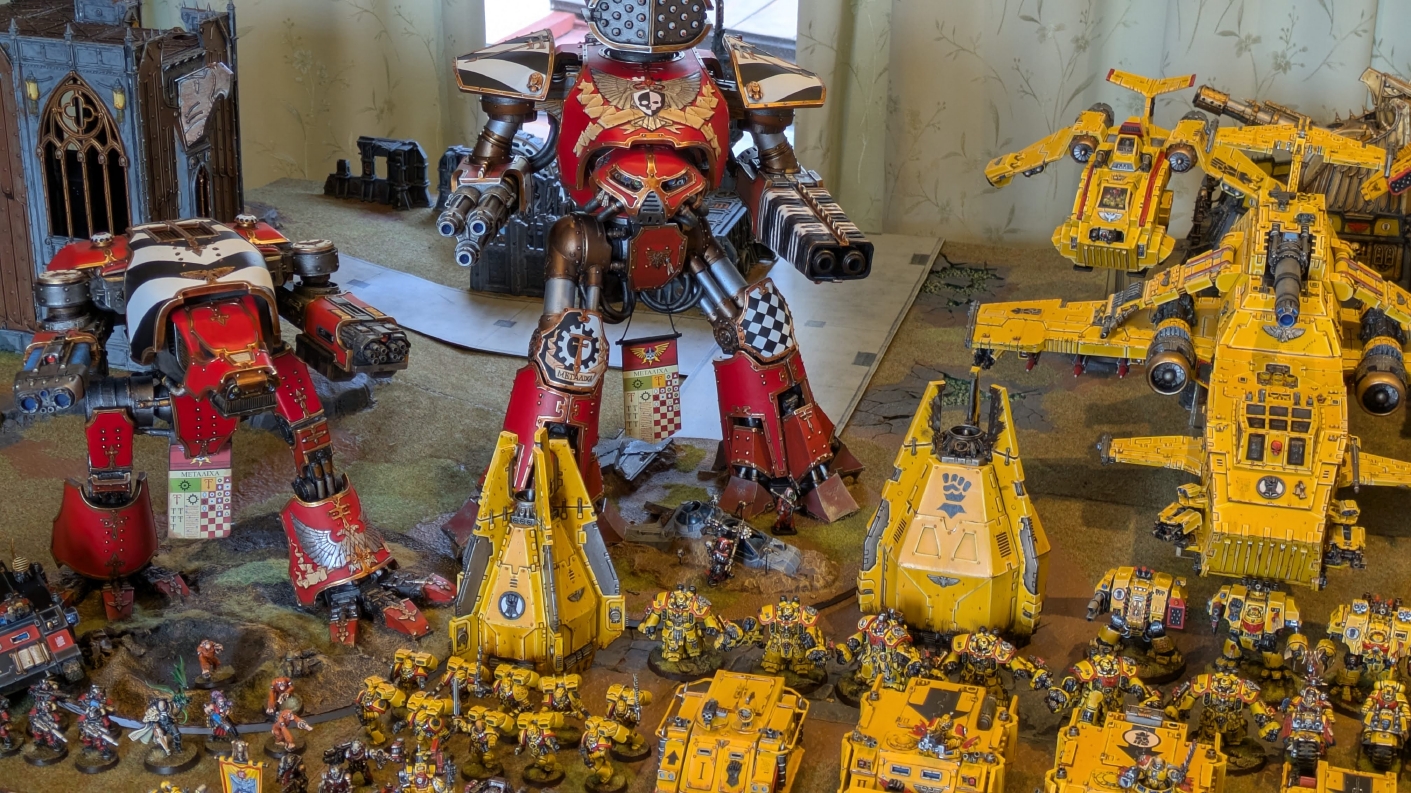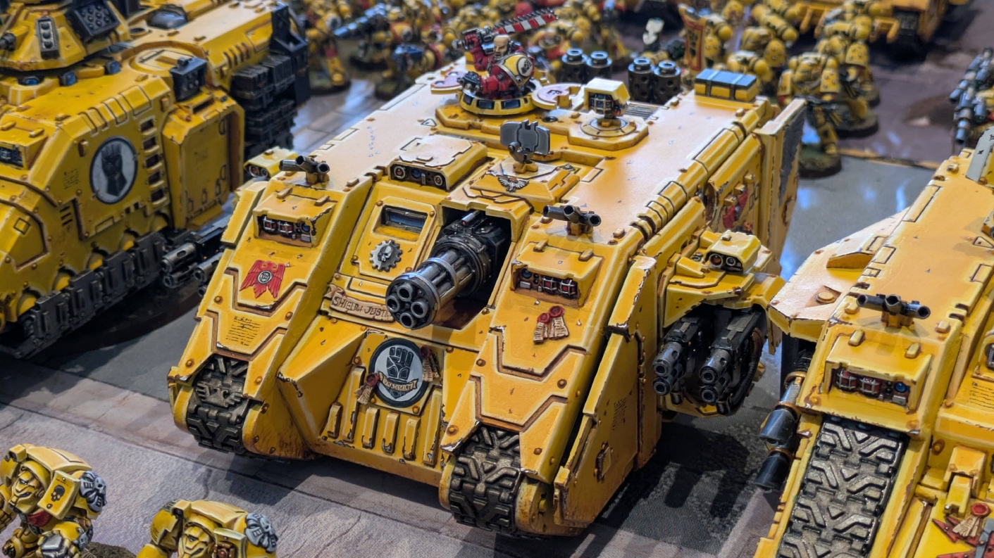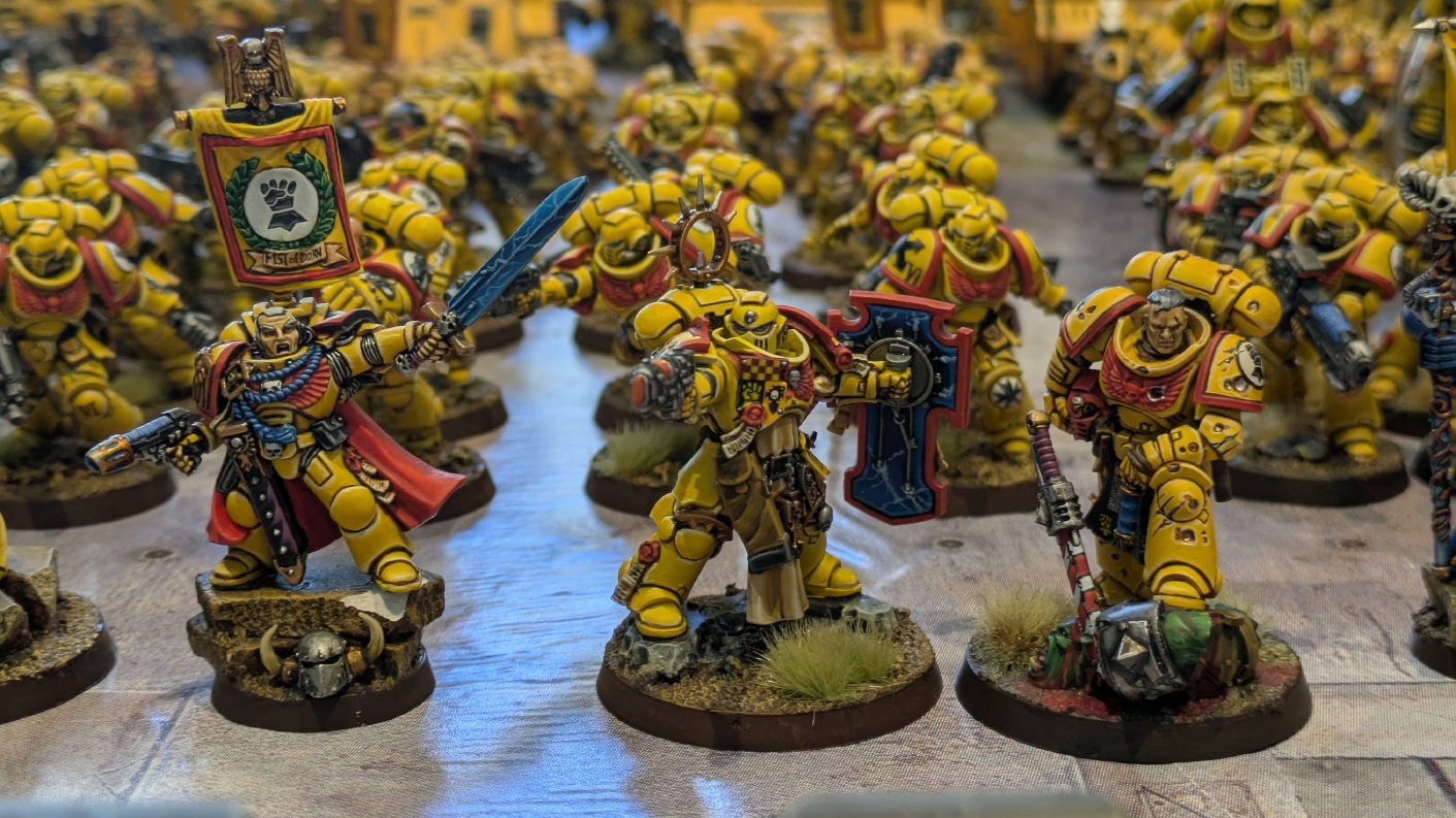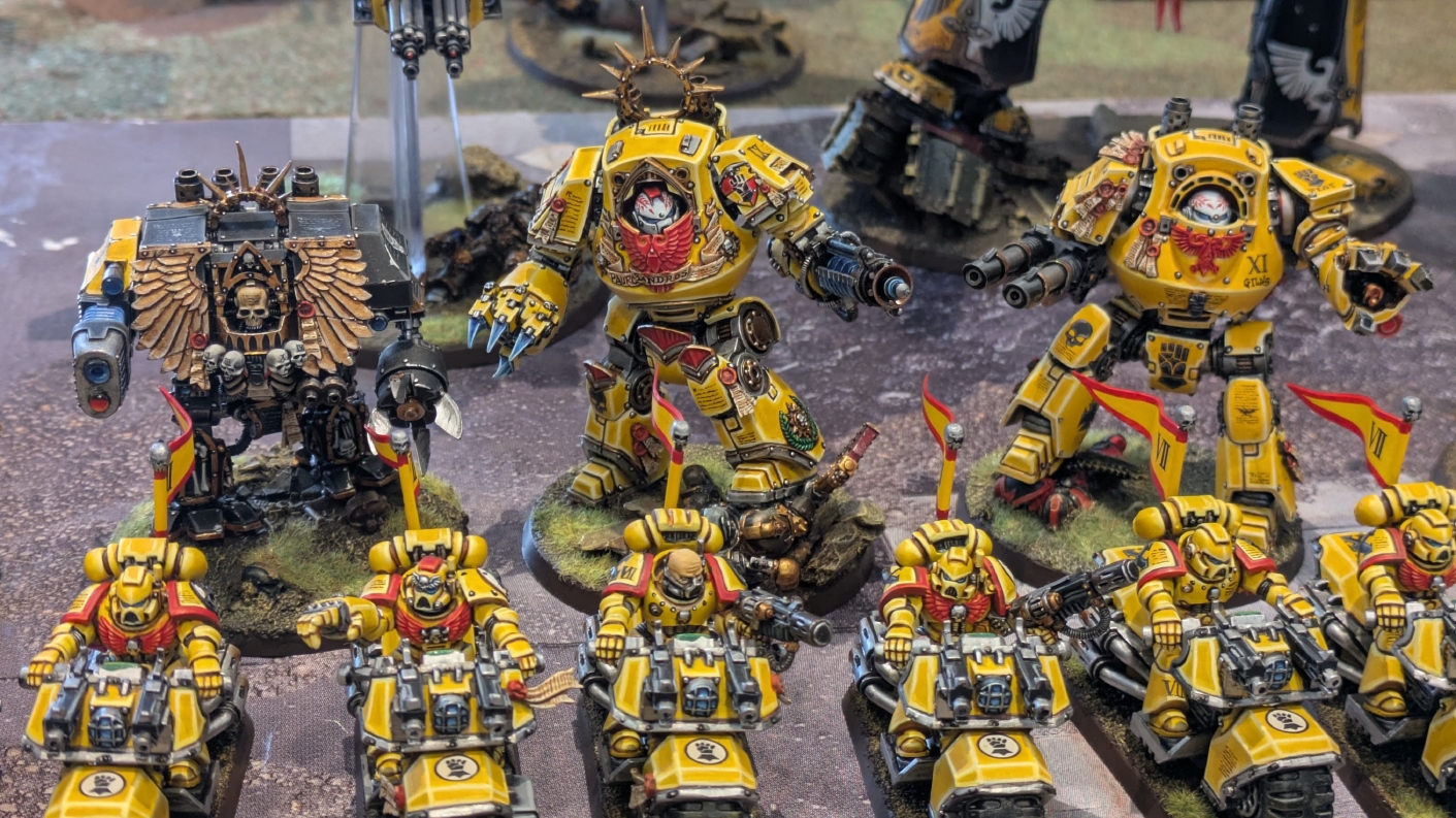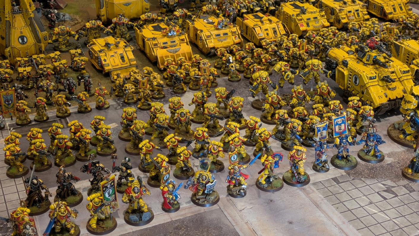 寄せられたコメントもほとんどが好意的なもので、関連するポストも合わせたら500件近く頂けて、更になんとこのポスト以降2日ほどでフォロワーが2000人近く増えてしまったのでした。 流石に色々すごい。 2011年からツイッターやってて、フォロワーがこんなに急激に増えたのは初めてだったので、これはもう自動翻訳機能搭載のおかげ間違いなしだし、 何かしらのポストの表示優先順位のアルゴリズムに変更があって、日本人のポストが多数海外に届くようになったのかもしれません。 同じようにプチバズ状態になっている日本趣味人も多数いらっしゃった印象です。 ![]() いや〜正直言って、ツイッター社がイーロン・マスクに買収され、Xになってから、いらん改変ばっかりするし、広告鬱陶しすぎて広告減らすために課金するハメになったし、 そもそもツイッターって言いたかったし、ツイートって言いたかったし、Xとかポストとか言わないように心がける程度には、イーロン・マスクってさぁ…とか思ってたんですが、 こうなってしまったら話は別です。 いや〜X凄いわ、ポストが世界に届く! 世界中の趣味人とこんなに繋がることが出来て、もうXは最高のSNSじゃん!ってなるくらいにはイーロン・マスクのファンになってしまいました。 いやほんと、GW本社もXでの広報やめちゃってますけど、戻ってきて欲しいですねぇ。 ![]() それにしても海外趣味人、ウォーハンマーへの熱量がすごい。 あらためて日本語に翻訳される趣味人同士の議論とか言い合いを見てると、いろんなタイプが居るのは日本と同様でも、その振り幅がでかい。 熱々になっている人もいれば、たぶんあまり関心がない人まで、いろんな背景を持った人ががんがんポストしてて、昔の掲示板(BBS)で見たことがある光景というか、そういう雰囲気を感じました。 日本とは比較にならないくらいに幅広い年代でこのホビーが受け入れられていることをヒシヒシと感じましたね。 あと、すごい気軽にリプライ入れてくれるのも楽しくなりますね。 ついついXの画面をスクロールするのに夢中になり過ぎてペイントの時間を奪われがちなので、そろそろ加減して付き合っていかないと、とは思います。 ![]() というわけで、僕のインペリアルフィストが凄まじい勢いで拡散されたのは大変名誉なことでしたので、 インペリアルフィストの写真とそのきっかけになったX自動翻訳機能搭載の思い出をこの記事に残しておきたいと思いました。 もともとは、はたさんのティラニッドとの激熱巨大バトルの後に、せっかくでかい戦場を置いてある内に現時点でのインペリアルフィストを並べてみるかな、という感じでした。 それとX自動翻訳機能搭載のタイミングがたまたま一致した感じでした。いや〜嬉しかったです。 まぁ、過去にも何度か並べてますし、ファーストボーンのマリーンが多く、10年前以上前に作ったモデルがほとんどの中で、 このネタ何回やるんや!?、って思ってる日本の趣味人の方もいらっしゃるとは思いますが(笑)、いやぁ、僕も今回は予想外の展開だったんですよ、ほんと。 でもって、味をしめたので、これからも1年に1回くらいは自宅アーミーズオンパレードをやりたいな、と思った次第です(笑)。 ![]() いや〜マジでかっこいい、黄色いタンクがズラリ並ぶと最高ですね。 11版でコデックスが更新されたら、もしかしてライノ系シャーシのタンクは全部グラブ系タンクにとって代わられるかも、とか、 ランドレイダーもそろそろモデルチェンジしそうだなぁとか、色々と懸念はあるものの、もうここまで作っちゃったら、ゲームは関係ないです。 コレクションとしてこれからも大切にしていきたいと思っています! かつてツイッターで趣味人の方が、 「形あるものいつかは崩れる、永年コレクションしてきたフィギュアも太陽光と熱、そして湿気による劣化は避けられない、加水分解とかね…」 というようなツイートをされていたのを見た時に、軽くショックを受けた覚えがあります。 そうだよなぁ、これは一生もののコレクションて思ってても、実際は一生ものじゃなくいつかは崩れ去るものなんだなぁ…って。 でもそのツイートを見てから軽く7〜8年は経ちますが今の所、塗装面の劣化も色の退色も見受けられないですし、 今もって自信満々のコレクションであり続けてくれるこのインペリアルフィストを、このたび改めて誇らしく思ったものでした。 まぁ、気にするだけ無駄というか、ここまで来たらとことん増強してやろう、とキチガイじみた決意を新たにしたところです。 ![]() ちなみにこのRoRにて人気の記事「ウォーロードタイタン制作記」も今回のプチバズの中で便乗して宣伝したところ、こちらも反響大きくて改めて嬉しくなりました。 ![]() まだ見てない人は見てくださいね!ウォーロードタイタンが作りたくなっても責任はとれませんよ!(笑) ![]() リーヴァータイタンの制作記もあります。こちらも未読の方はぜひご覧になってくだ