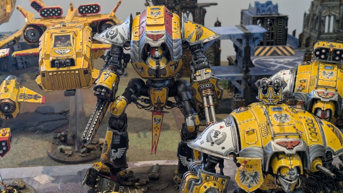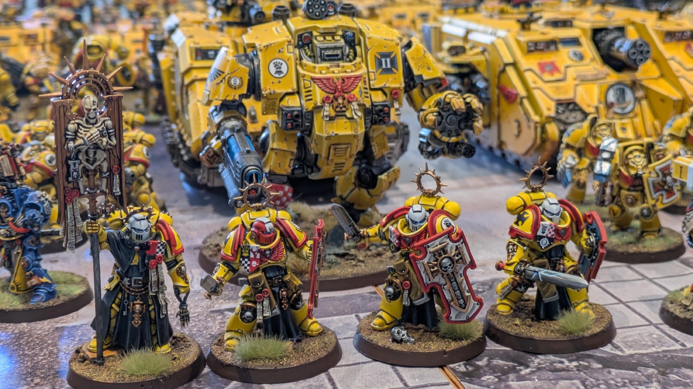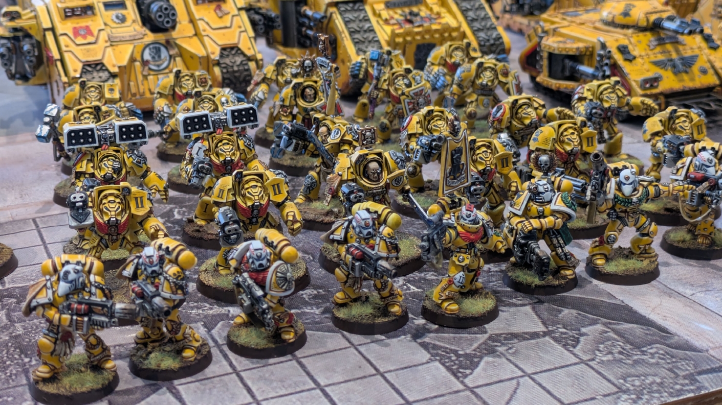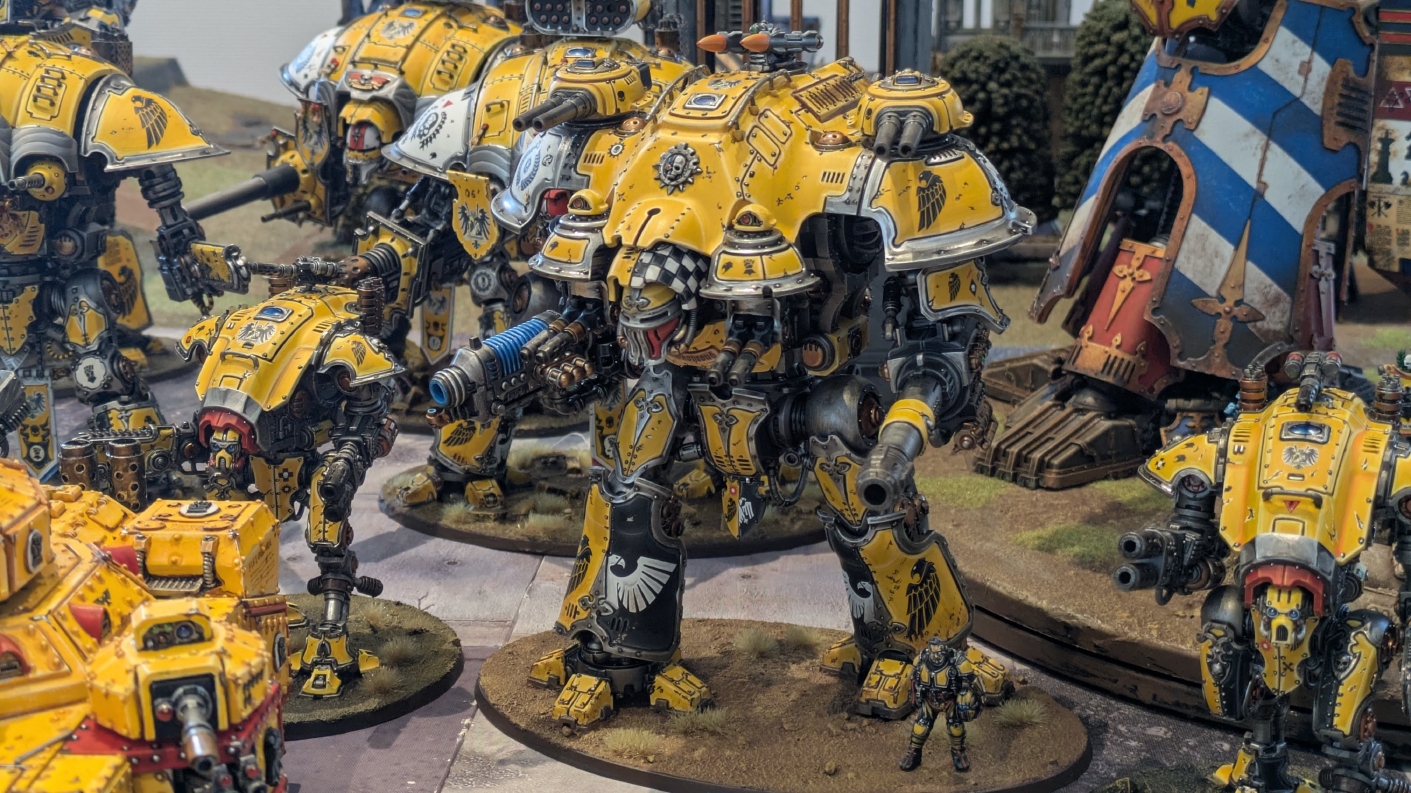 寄せられたコメントもほとんどが好意的なもので、関連するポストも合わせたら500件近く頂けて、更になんとこのポスト以降2日ほどでフォロワーが2000人近く増えてしまったのでした。 流石に色々すごい。 2011年からツイッターやってて、フォロワーがこんなに急激に増えたのは初めてだったので、これはもう自動翻訳機能搭載のおかげ間違いなしだし、 何かしらのポストの表示優先順位のアルゴリズムに変更があって、日本人のポストが多数海外に届くようになったのかもしれません。 同じようにプチバズ状態になっている日本趣味人も多数いらっしゃった印象です。 ![]() いや〜正直言って、ツイッター社がイーロン・マスクに買収され、Xになってから、いらん改変ばっかりするし、広告鬱陶しすぎて広告減らすために課金するハメになったし、 そもそもツイッターって言いたかったし、ツイートって言いたかったし、Xとかポストとか言わないように心がける程度には、イーロン・マスクってさぁ…とか思ってたんですが、 こうなってしまったら話は別です。 いや〜X凄いわ、ポストが世界に届く! 世界中の趣味人とこんなに繋がることが出来て、もうXは最高のSNSじゃん!ってなるくらいにはイーロン・マスクのファンになってしまいました。 いやほんと、GW本社もXでの広報やめちゃってますけど、戻ってきて欲しいですねぇ。 ![]() それにしても海外趣味人、ウォーハンマーへの熱量がすごい。 あらためて日本語に翻訳される趣味人同士の議論とか言い合いを見てると、いろんなタイプが居るのは日本と同様でも、その振り幅がでかい。 熱々になっている人もいれば、たぶんあまり関心がない人まで、いろんな背景を持った人ががんがんポストしてて、昔の掲示板(BBS)で見たことがある光景というか、そういう雰囲気を感じました。 日本とは比較にならないくらいに幅広い年代でこのホビーが受け入れられていることをヒシヒシと感じましたね。 あと、すごい気軽にリプライ入れてくれるのも楽しくなりますね。 ついついXの画面をスクロールするのに夢中になり過ぎてペイントの時間を奪われがちなので、そろそろ加減して付き合っていかないと、とは思います。 ![]() というわけで、僕のインペリアルフィストが凄まじい勢いで拡散されたのは大変名誉なことでしたので、 インペリアルフィストの写真とそのきっかけになったX自動翻訳機能搭載の思い出をこの記事に残しておきたいと思いました。 もともとは、はたさんのティラニッドとの激熱巨大バトルの後に、せっかくでかい戦場を置いてある内に現時点でのインペリアルフィストを並べてみるかな、という感じでした。 それとX自動翻訳機能搭載のタイミングがたまたま一致した感じでした。いや〜嬉しかったです。 まぁ、過去にも何度か並べてますし、ファーストボーンのマリーンが多く、10年前以上前に作ったモデルがほとんどの中で、 このネタ何回やるんや!?、って思ってる日本の趣味人の方もいらっしゃるとは思いますが(笑)、いやぁ、僕も今回は予想外の展開だったんですよ、ほんと。 でもって、味をしめたので、これからも1年に1回くらいは自宅アーミーズオンパレードをやりたいな、と思った次第です(笑)。 ![]() いや〜マジでかっこいい、黄色いタンクがズラリ並ぶと最高ですね。 11版でコデックスが更新されたら、もしかしてライノ系シャーシのタンクは全部グラブ系タンクにとって代わられるかも、とか、 ランドレイダーもそろそろモデルチェンジしそうだなぁとか、色々と懸念はあるものの、もうここまで作っちゃったら、ゲームは関係ないです。 コレクションとしてこれからも大切にしていきたいと思っています! かつてツイッターで趣味人の方が、 「形あるものいつかは崩れる、永年コレクションしてきたフィギュアも太陽光と熱、そして湿気による劣化は避けられない、加水分解とかね…」 というようなツイートをされていたのを見た時に、軽くショックを受けた覚えがあります。 そうだよなぁ、これは一生もののコレクションて思ってても、実際は一生ものじゃなくいつかは崩れ去るものなんだなぁ…って。 でもそのツイートを見てから軽く7〜8年は経ちますが今の所、塗装面の劣化も色の退色も見受けられないですし、 今もって自信満々のコレクションであり続けてくれるこのインペリアルフィストを、このたび改めて誇らしく思ったものでした。 まぁ、気にするだけ無駄というか、ここまで来たらとことん増強してやろう、とキチガイじみた決意を新たにしたところです。 ![]() ちなみにこのRoRにて人気の記事「ウォーロードタイタン制作記」も今回のプチバズの中で便乗して宣伝したところ、こちらも反響大きくて改めて嬉しくなりました。 ![]() まだ見てない人は見てくださいね!ウォーロードタイタンが作りたくなっても責任はとれませんよ!(笑) ![]() リーヴァータイタンの制作記もあります。こちらも未読の方はぜひご覧になってくだ
