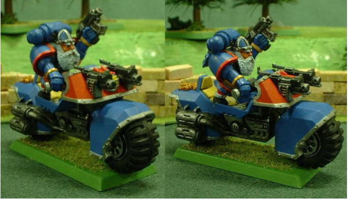 | 天使ササキエルさんのコメント 一スカットファンとしての、GWへの怨念・・・。 もとい、スカット復活への希望を込めて作り上げた、私の40K作品第一号です。 マリーンバイクのアクセル部分を切断・接着して足場を作り、ドワーフ(スカット)でも立ち乗りができるように改造しました。 パーツすげ替えと切断・接着だけの簡単な改造ではありますが、 それでも『宇宙ドワーフ』として通用するものは作れたと思ってます。 今後は、どうやってマリーンとのメカや塗りの差別化を図るかが課題かと思ってます。いかがでしょうか? Rmanのコメント これはもう愛ですね!(笑)。 スカットというマイナーな種族をアーミーまで拡張させようというササキエルさんの酔狂さ(笑)、見事です! 腕が不自然に長く感じなくもないですが、上のドワーフをもう少し40Kのイっちゃってる雰囲気にしてほしかったですね^^。 顔からコードが生えていたり...笑。 |