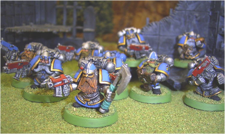 | 天使ササキエルさんのコメント アーミーの屋台骨、タクティカルスコードです。 中に不自然なポーズを取っていたり、武器やバックパックの色合いが違うトルーパーがいますが、 それはよりかっこいいスカットを目指して試行錯誤した結果と受け取ってくださると幸いです。 ちなみに、肩アーマーのマークは、HobbyProducts 社から出ている、 Demonworldというミニチュアゲームのドワーフ用デカールから流用しました。 Rmanのコメント 「スカットへの愛」という一言だけでは片づけられない、努力のあとが感じられる素晴らしいユニットですね。 ここまでやったらもう後は突っ走るだけです! しっかりペイントがされているので、これがまるごとコンバージョンされているとつい忘れてしまいます。 |
