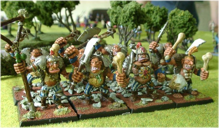 | てーしさんのコメント 何故か突然オウガが作りたくなる病気にかかってしまい、 Realm of Rmanの企画ページにあったオウガを購入、GWで足りないパーツを購入して出来た物です チャンピオンはその時に頂いたドラゴンオウガの上半身とオウガの下半身を 無理矢理くっつけると言うコンバージョンにトライしてみました このレジメントは塗りが簡単だった割りに見栄えがしてハッタリが効くのでお気に入りの一品です 家にはまだ8体同じ物が眠っているんで、そのうち完成させて16体レジメントを作成するのが夢ですね(笑) Rmanのコメント オウガが8体も!!むちゃくちゃド迫力です。てーしさんはこのオウガをケイオスに混ぜて使っていましたが、 元々ケイオスに馴染みやすいユニットですよね。チャンピオンの改造がまたケイオスレベルをあげています! ハッタリ(と言っては何ですが)が効いているのは、やはりベースデコレートにも要因があると思います。 面積の広いベースも岩を配置することで、隙間感を与えていません。 16体レジメント、すご〜く楽しみですね!(もはやオウガアーミーだ) |