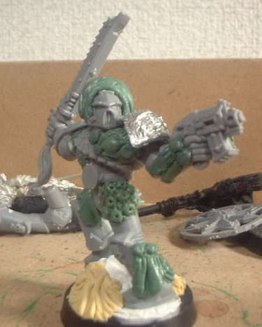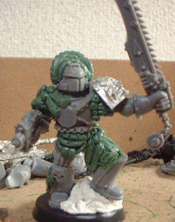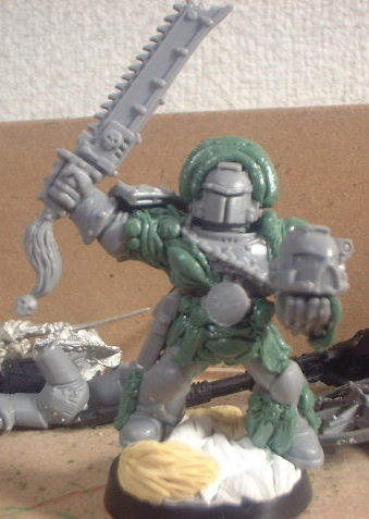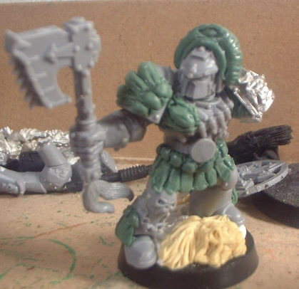 | プラって改造が楽チン。サクサク削れるからね〜。 緑の部分はGW製のとても使いやすいグリーンスタッフ(エポキシパテ)。 黄色の部分はタミヤの速乾タイプのエポキシパテ。 安いが(グリーンスタッフに比べて)使いづらいのでベースデコレート等に使用。 白い部分は石こう粘土。はっきり言ってこのサイズのミニチュアの使用には全く適さないんだけど(たぶん)、 ベースデコレートするときに大雑把な形を決めるには結構便利。 銀、灰色の部分はもちろん、メタルにプラね。 |
