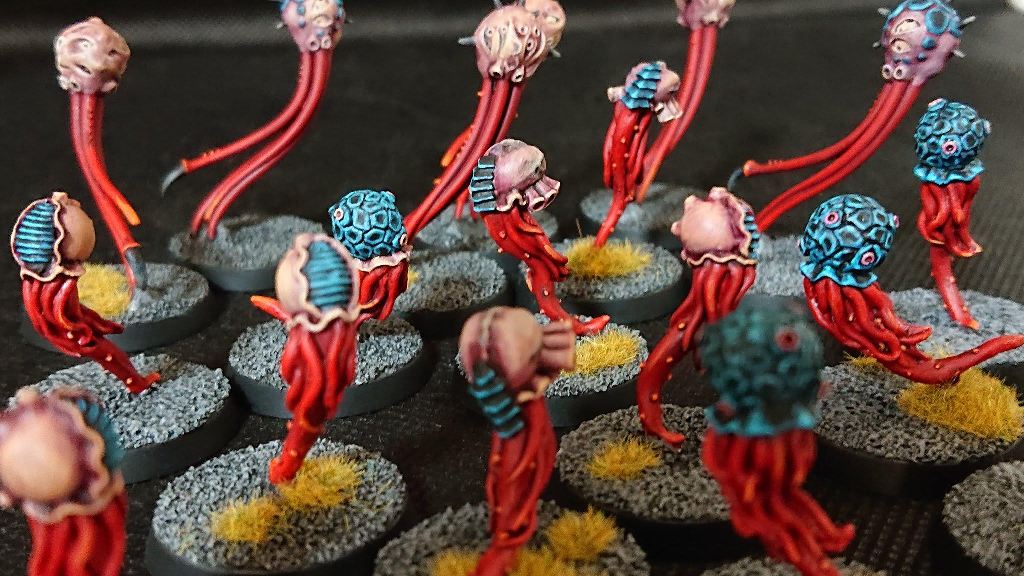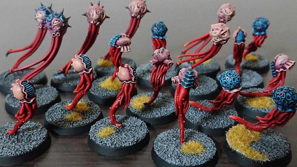 | はたさんのコメント スポアマイン。 塗りながら、ゲーム重視なら塗らないなー。とか、この後ディスプレイケースに入れられたら私以外が見ることは無いんだろうな。とか思ってた。 でも、好きだから丁寧に塗ったで誰かに見て下さい。 ついでにゲームで活躍する方法募集! Rmanのコメント スポアマイン、独特のデザインだし、けっこう個性があって可愛いんですね!?はたさんのティラニッド愛がヒシヒシと伝わってくるというか、 ほんと、丁寧なペイントに舌を巻きます。赤色の触手の色味もちょうどいいグラデーションかかってますし、頭の色味も綺麗な塗り分け。 この前のゲームでも大量のスポアマインが一気に爆発してモノリスを轟沈させるという、とんでもないドラマを起こしてくれましたね! アレはシビれました。 2021.11.3 |