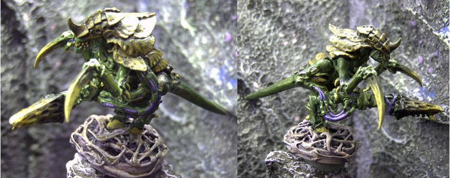 Rmanのコメント ウォーリアーっぽいゴーントとは謎の生物ですが(笑)、塗装は文句無しに格好いいですね! 緑ベースに不思議な色合いが綺麗です。甲羅の色なんか、いかにも生物っぽい感じがでてますね。 ベースデコレートも不気味なかんじで格好いい! ティラニッドはモンスター作成ルールもありますし、いざとなったらゴーントウォーリアーとして使いましょう! |