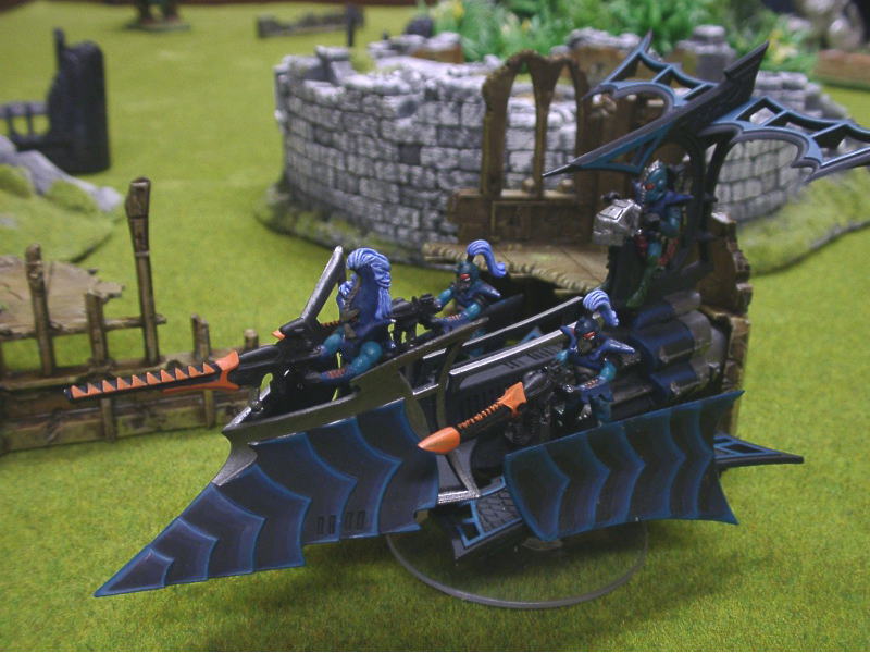 | V1ALさんのコメント 僕が知る限り、攻撃力と防御力が最もアンバランスなビーグルです。そこが魅力なのでしょうが・・・。 攻撃を受けると、グランシングヒットでも半分の確率で壊れます。アーマーも11しかないし。 攻撃すればマリーンの1ユニットくらい壊滅させますが。 一撃も受けちゃいけないんだろうなぁ。もっと運用を研究しなきゃなぁ。 塗りは僕にしては珍しくグラデを5段階くらいしています。が、その効果はあまり出てないようです。 難しいですなぁ。 Rmanのコメント いかにもダークっぽいデザインが良いですよね〜。とがっている感じが攻撃力重視っぽくて。 僕のケイオス精鋭部隊もこいつの攻撃により壊滅してしまいました(笑) このヴィークルのグラデーションはこれくらいに抑えておくのが自然で良いかも? |