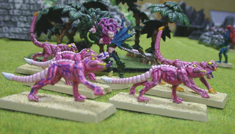 | V1ALさんのコメント 最低ランクの防御力で数多く編入できないので、しょぼい敵に1斉射されるだけで消えれる。 でも1回も撃たれないで噛みつきにいけたらエルダーやインペリアルの1ユニットくらいは喰いきれる強さ。 ま、マリーンなんかが相手だとアーマーで弾かれておわりなんだけど。 ビーストはプリチーでいいんだけどペイントに失敗しました。方向性を固めないで塗りはじめちゃったからか。 塗り直そうかなぁ。 Rmanのコメント 紫色の血管に、フレッシュな赤肉色がかなりキモチ悪くて僕は好きです。ウォッシングが綺麗に決まっているので 細かな筋肉のモールドが潰れないでいるのは素晴らしいと思います。 尻尾の色が色味に欠けるかなぁという感じもするので、暖色系を追加されたら僕好みになりそう!(笑) |