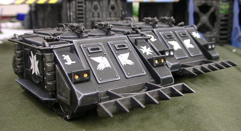 | 有機溶剤さんのコメント コイツのパーツをはじめてみたときは、”同じランナーパーツが2つも入っている、ミスパックか?” と思いました(爆)で、説明書を見ると、”上下対象、左右対称”という誠に男らしく且つ究極の省力化を行ってありました(核爆) ..やるなGW。 と落ちこんでも仕方が無いので、究めて説明書に忠実に製作してみました。おかげで ゲームでは謎の大活躍です。 ペイントはモノトーンでシンプルにグラデーションをかけて仕上げました Rmanのコメント 確かに現行のライノはマズイ...のですが、この有機溶剤さんのライノは抑えるトコは抑えてあって コンパクトに綺麗にまとまっているなぁって思いました。 じつは真面目に作るとそれなりのモノになるのですね〜。GWが何年もモデルチェンジしないわけですね...。 |