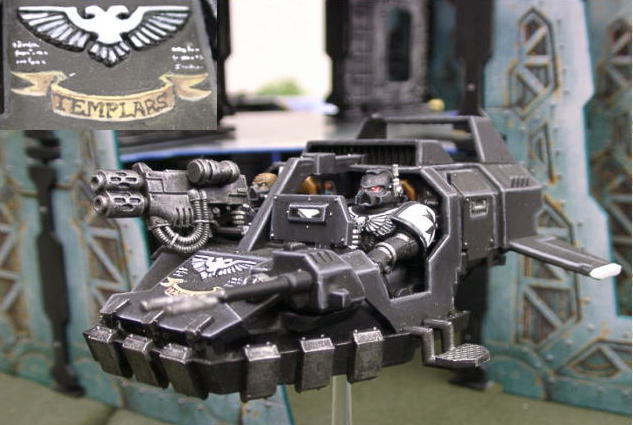| 有機溶剤さんのコメント 究めて説明書に忠実に作った何の工夫も無いランドスピーダーです 但し、ボディとシャーシーの合いが絶望的に悪くて、ボディを無理やり曲げて瞬間接着剤を流し込んで 強引に接着しましたが....疲れました。 ”TEMPLARS”のマーキングが楽しかったです、シャーペンで下書後ガッシュで手書しました。 残り後2台か....がんばります Rmanのコメント う〜ん、格好良いですね〜。前面に描かれた模様がほんと丁寧でブラックテンプラーズらしさ倍増です。 これもエッジを強調する塗装でランスピの形がはっきりわかって格好良いです、元々良いモデルですよね。 |
