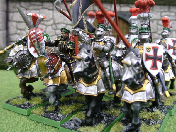 カラーパターンは箱絵とアーミーガイドを参考にしてみました。 設定では銀単色のバーディングなので、単調にならないようにするのが大変でした。 バナーはいつも通り下書き無しの手書き漢勝負です。 Rmanのコメント 大迫力のナイトですね!バーディングの塗り方が斬新です。 銀色は銀色ですが単調さを感じさせません。バナーも格好いいですね チャンピオンの表情がこれまた見事です! |